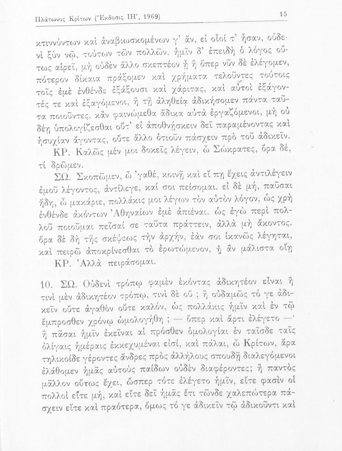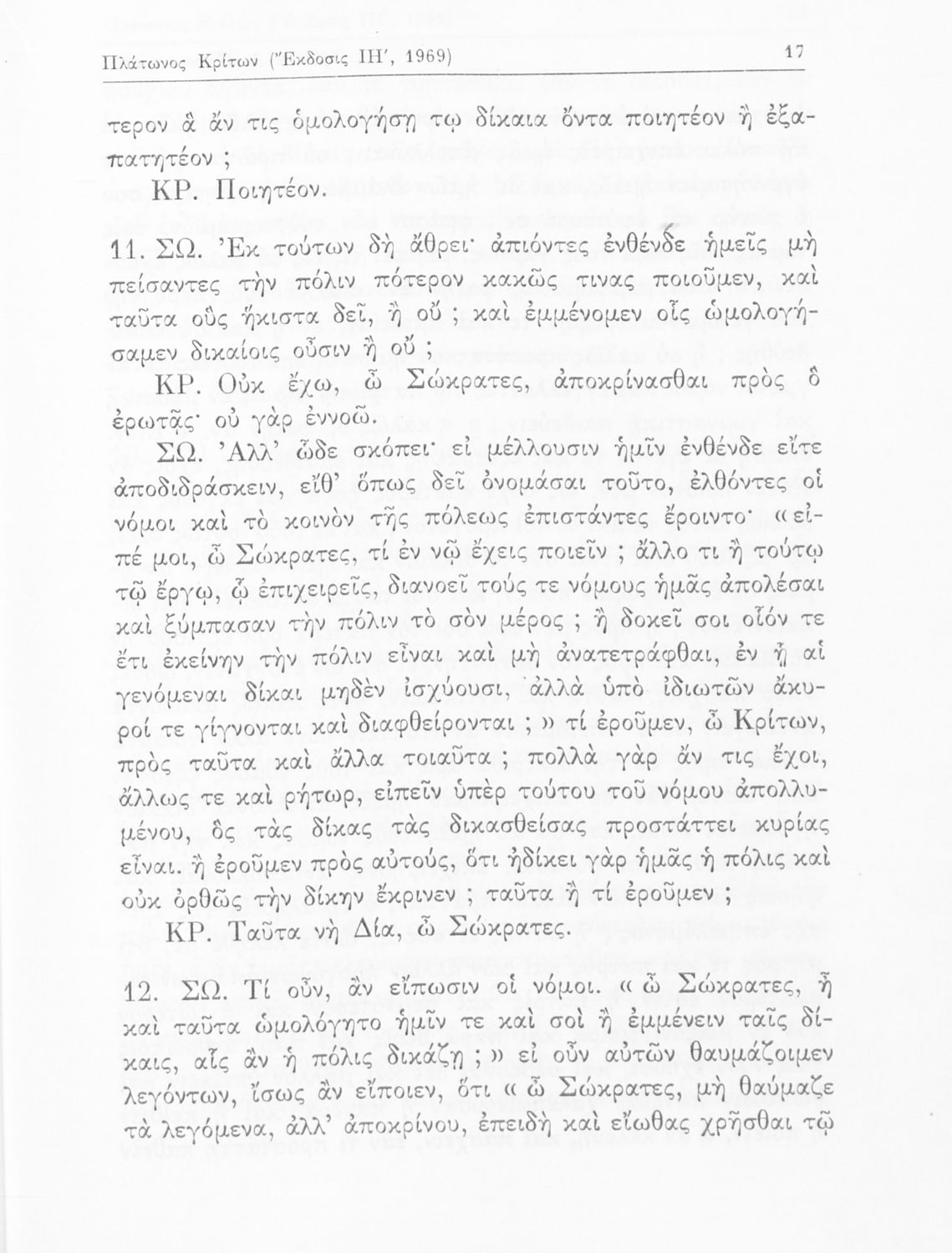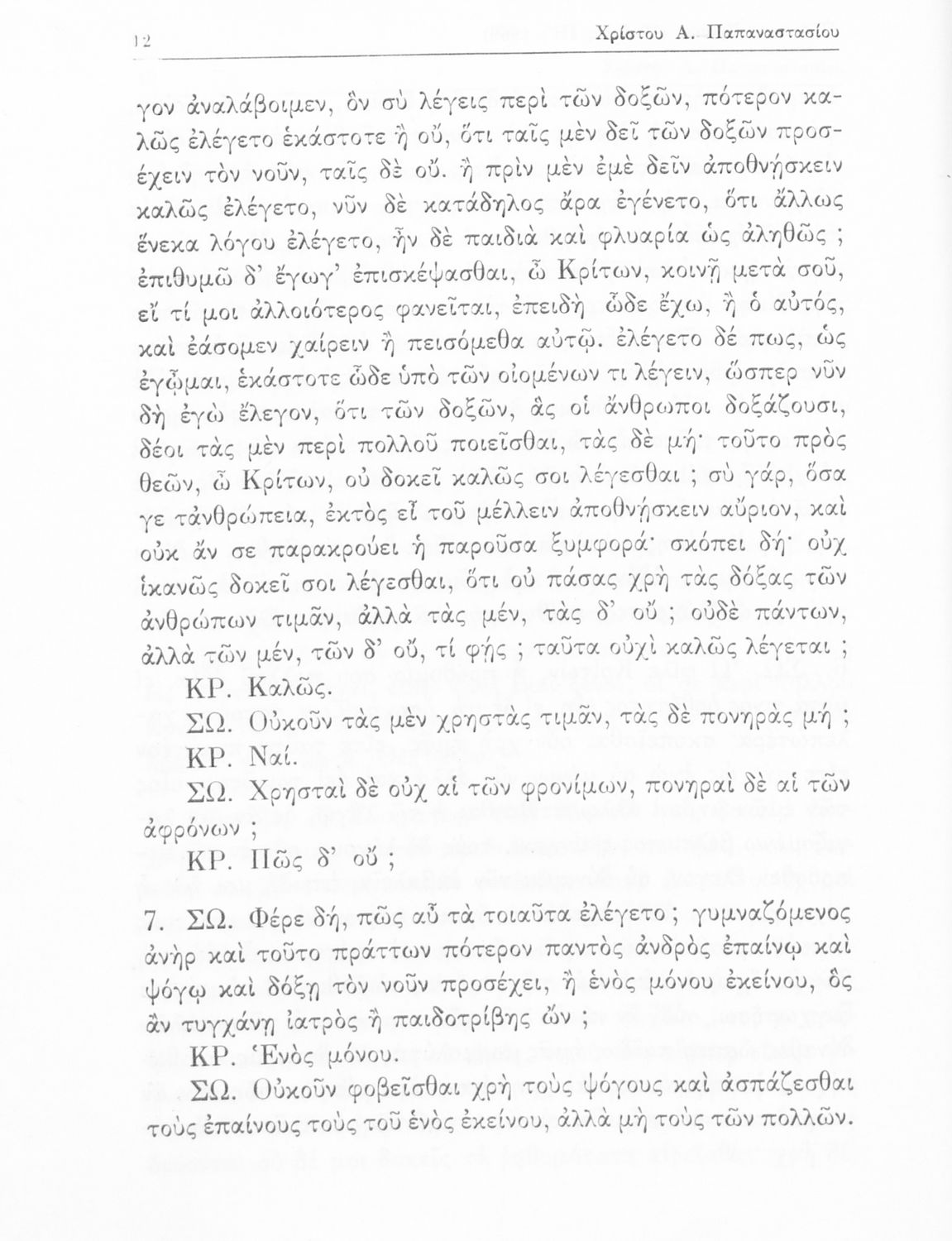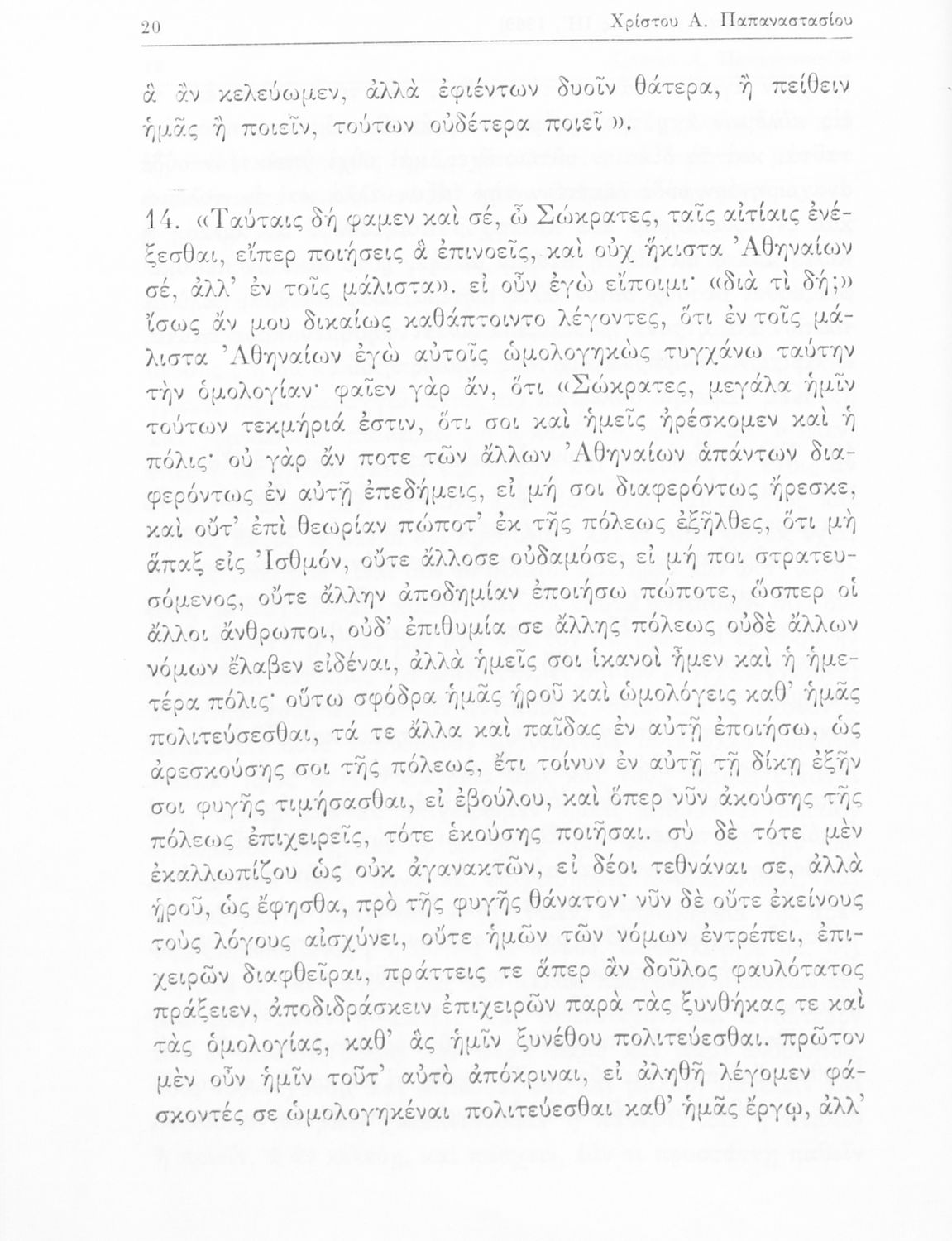 Σχολικό εγχειρίδιο της Ε΄ Γυμνασίου για το μάθημα των Αρχαίων Ελληνικών. Το εγχειρίδιο περιλαμβάνει το αρχαίο κείμενο του έργου του Πλάτωνα, "Κρίτων" και το β΄ μέρος περιλαμβάνει ερμηνευτικές σημειώσεις με πραγματολογικά, γλωσσικά και γραμματολογικά σχόλια.