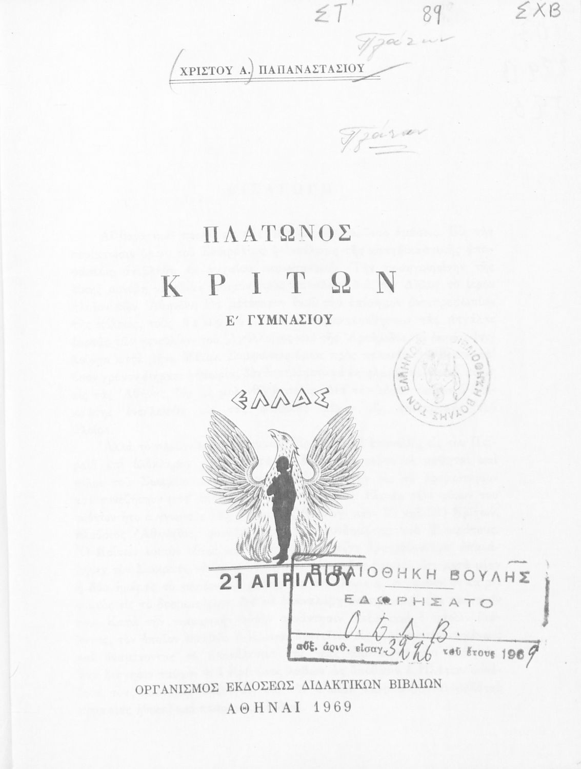 Εκδότης: Οργανισμός Εκδόσεως Διδακτικών Βιβλίων Έτος έκδοσης: 1969 Τόπος έκδοσης: Αθήνα Έκδοση: 18η Υπουργική απόφαση / Σύμβαση: 1839/ 23-5-1969 Έτος έγκρισης: 1969 |