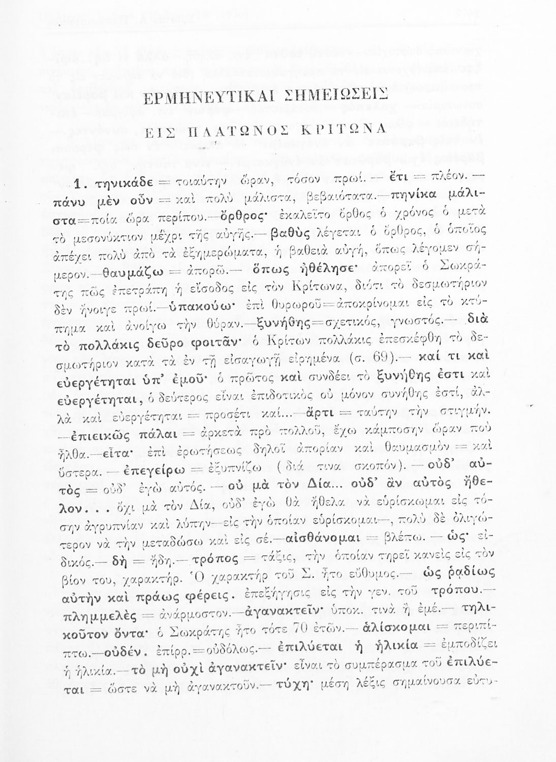 Σχολικό εγχειρίδιο Αρχαίων Ελληνικών της Ε ' Γυμνασίου. Το βιβλίο περιλαμβάνει το έργο του Πλάτωνα, Κρίτων. Ξεκινάει με μια εισαγωγή για τη ζωή και το έργο του Πλάτωνα, συνεχίζει με το απόσπασμα από το πρωτότυπο έργο του Πλάτωνα και κλείνει με ερμηνευτικές σημειώσεις του συγγραφέα.