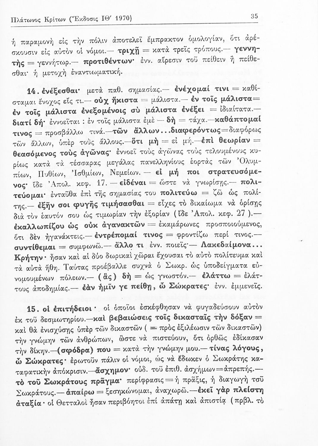 Σχολικό εγχειρίδιο Αρχαίων Ελληνικών για τους μαθητές της Ε΄ Γυμνασίου. Το βιβλίο περιλαμβάνει το έργο του Πλάτωνα, “Κρίτων” και το οποίο αναλύει γλωσσικά και ερμηνευτικά.