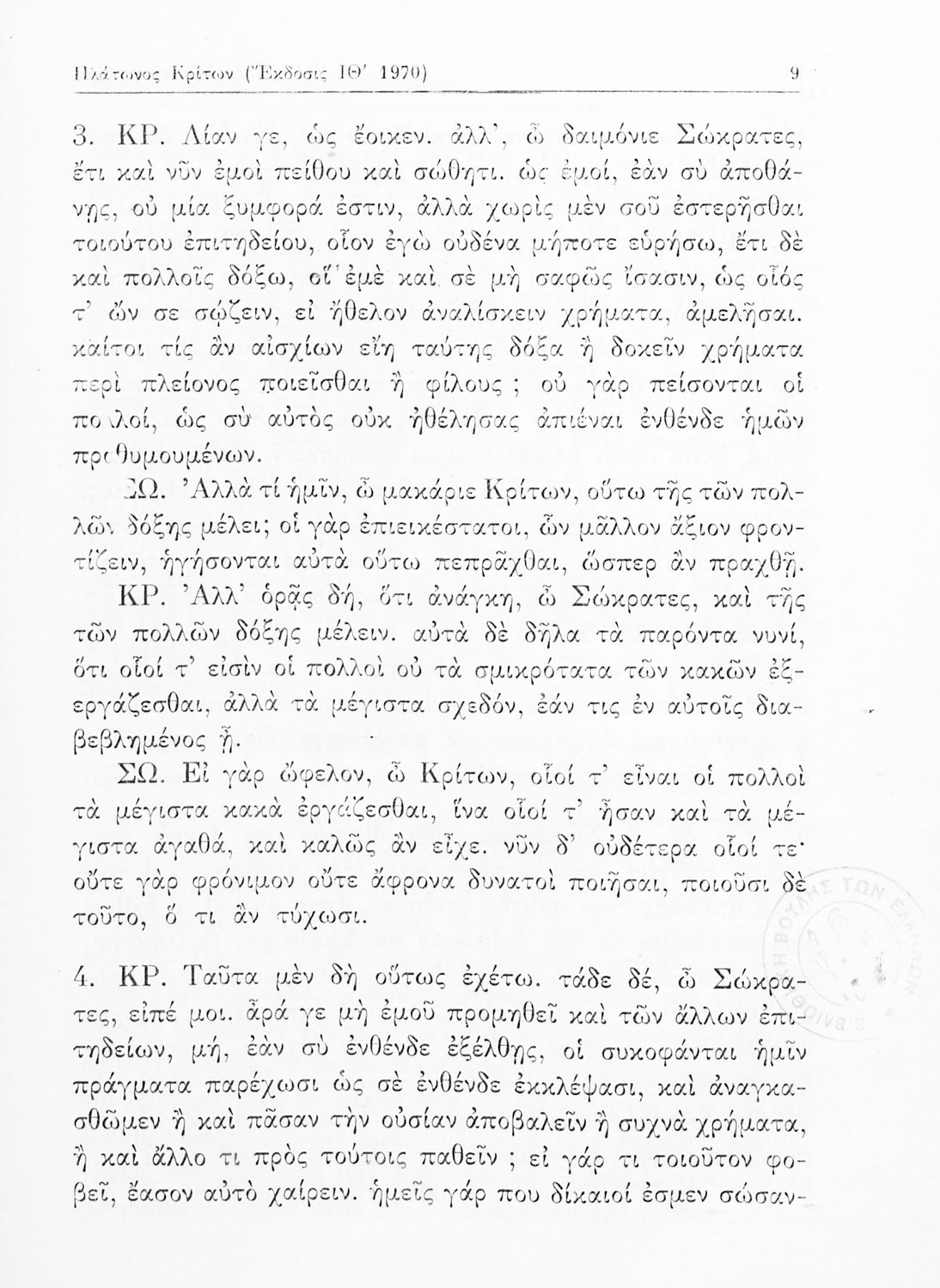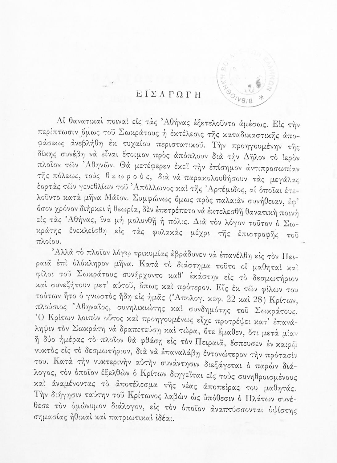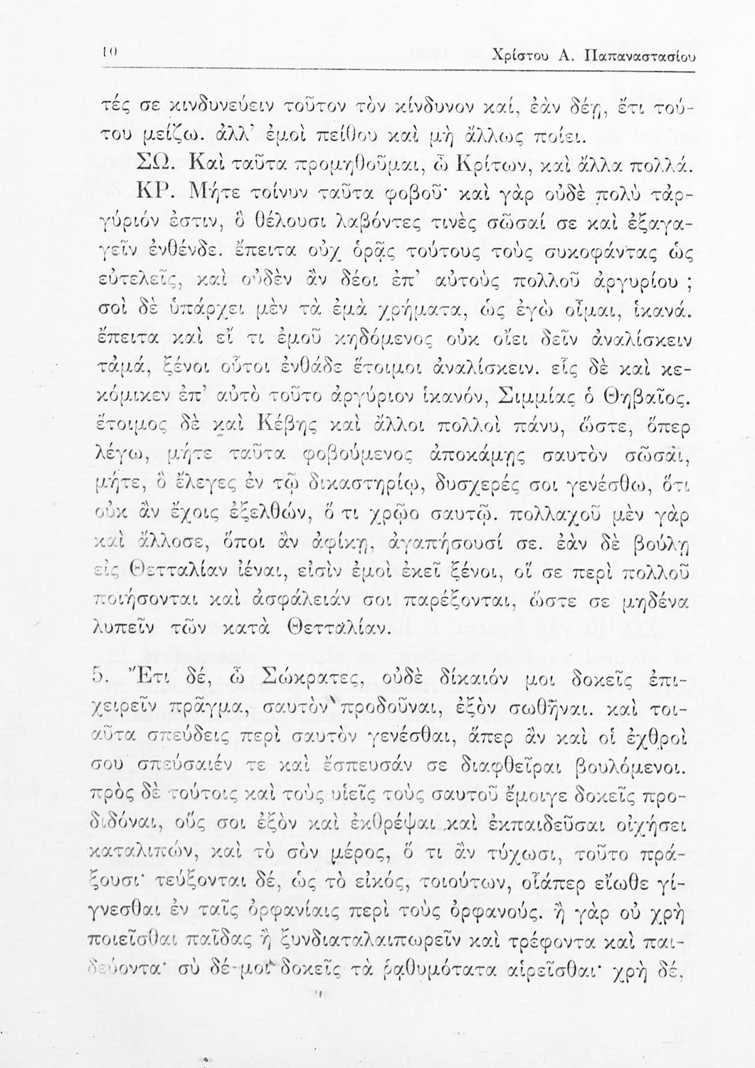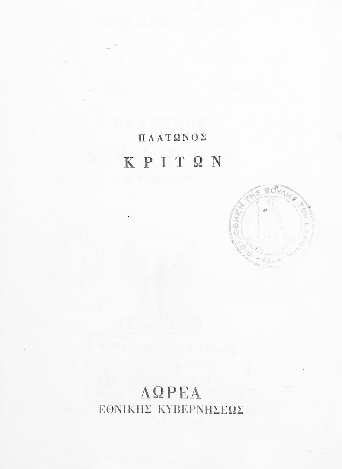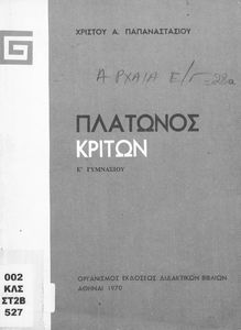 Σχολικό εγχειρίδιο Αρχαίων Ελληνικών της Ε ' Γυμνασίου. Το βιβλίο περιλαμβάνει το έργο του Πλάτωνα, Κρίτων. Ξεκινάει με μια εισαγωγή για τη ζωή και το έργο του Πλάτωνα, συνεχίζει με το απόσπασμα από το πρωτότυπο έργο του Πλάτωνα και κλείνει με ερμηνευτικές σημειώσεις του συγγραφέα.