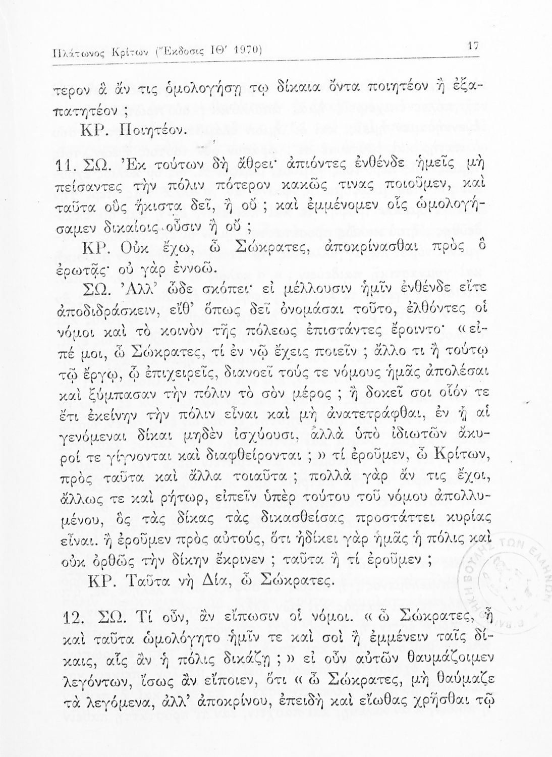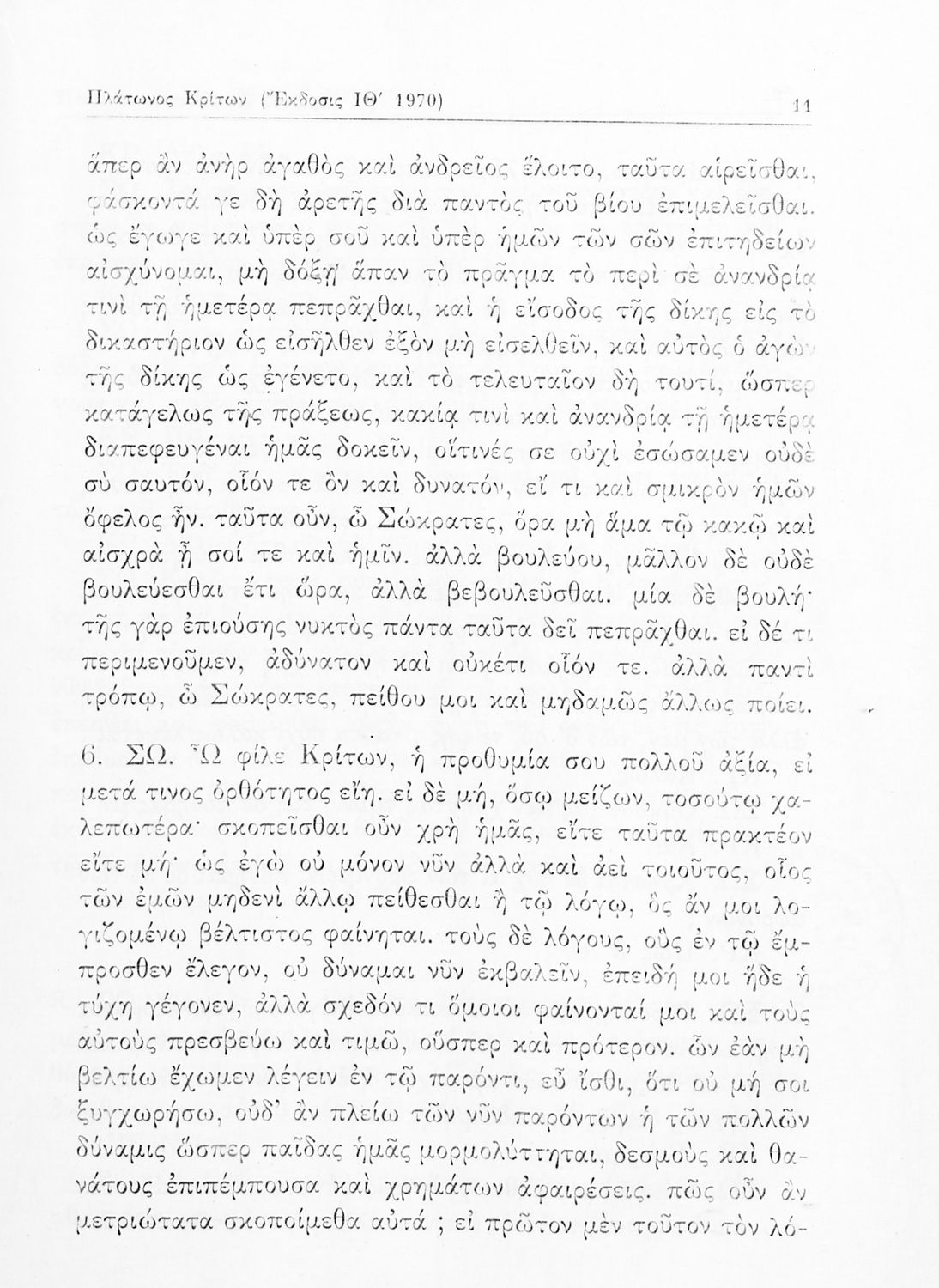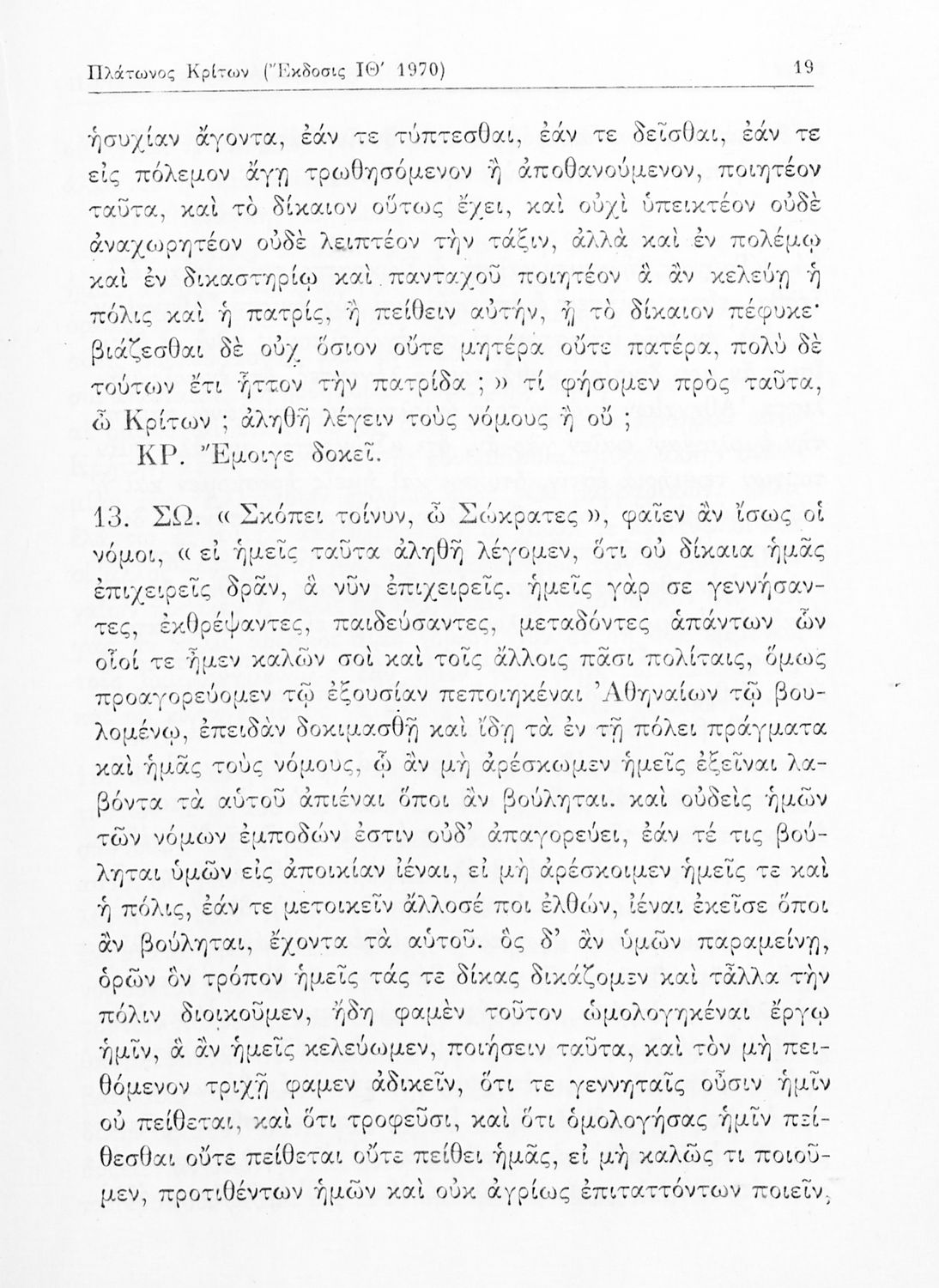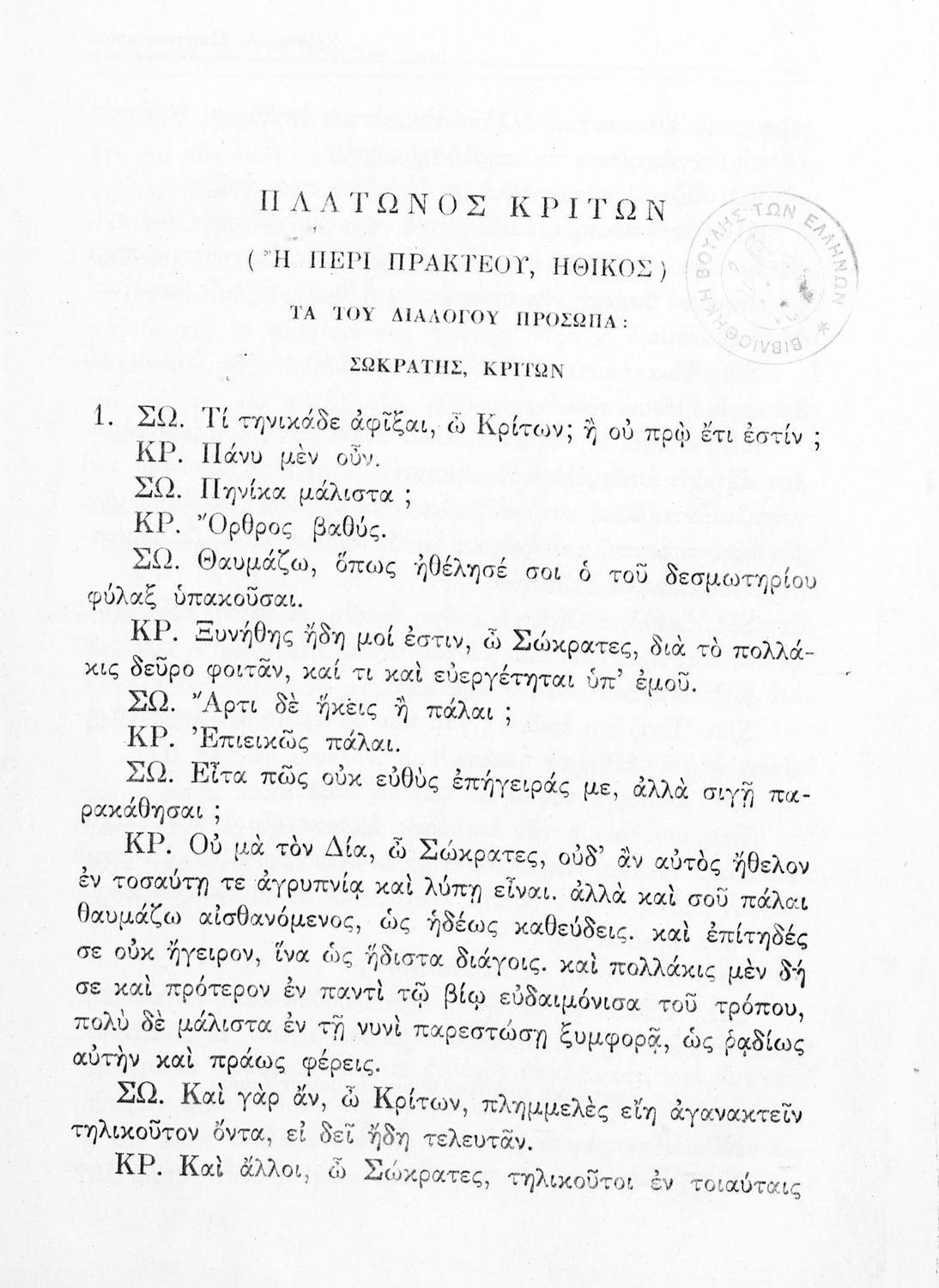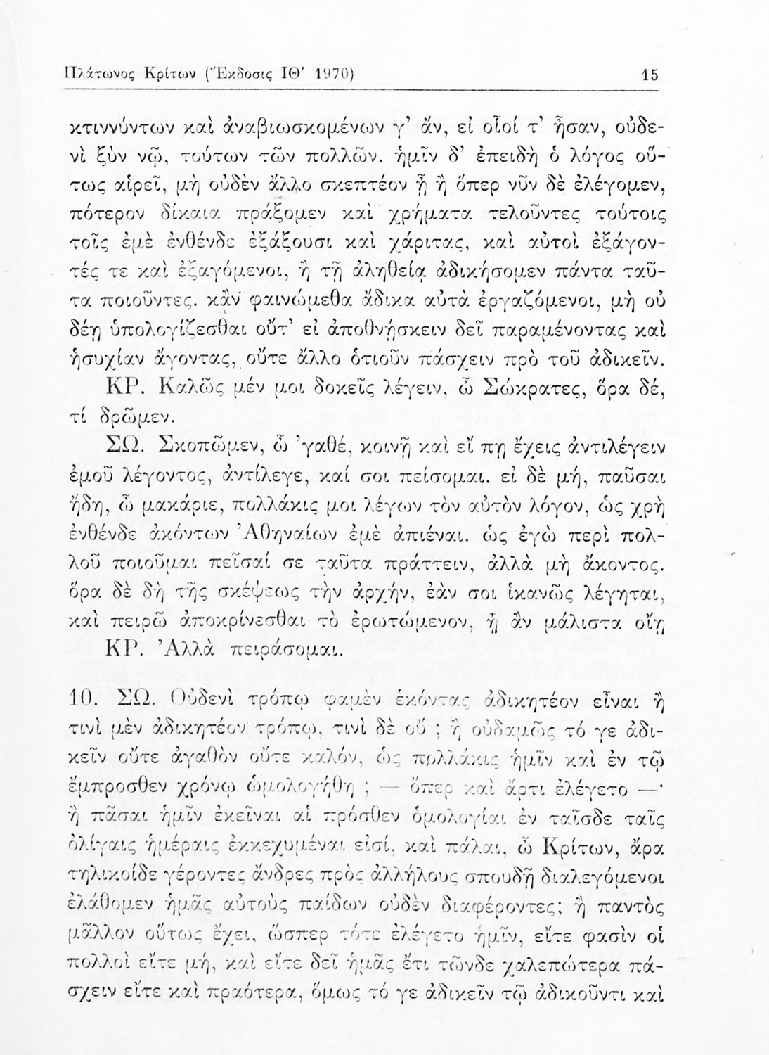 Σχολικό εγχειρίδιο Αρχαίων Ελληνικών της Ε ' Γυμνασίου. Το βιβλίο περιλαμβάνει το έργο του Πλάτωνα, Κρίτων. Ξεκινάει με μια εισαγωγή για τη ζωή και το έργο του Πλάτωνα, συνεχίζει με το απόσπασμα από το πρωτότυπο έργο του Πλάτωνα και κλείνει με ερμηνευτικές σημειώσεις του συγγραφέα.