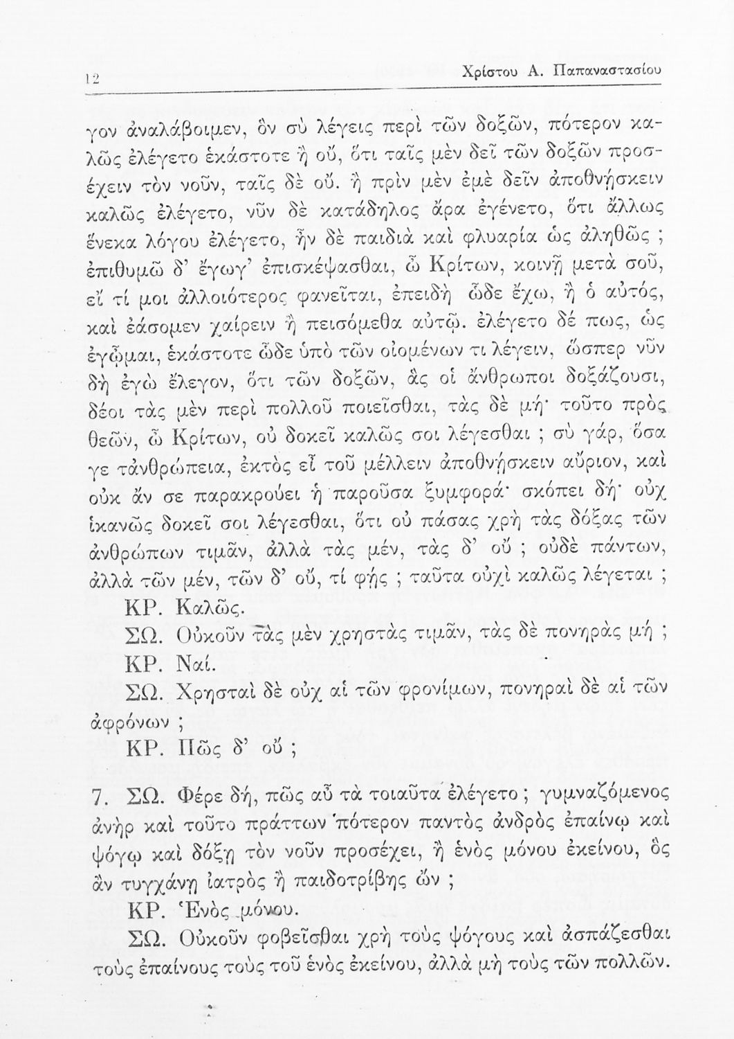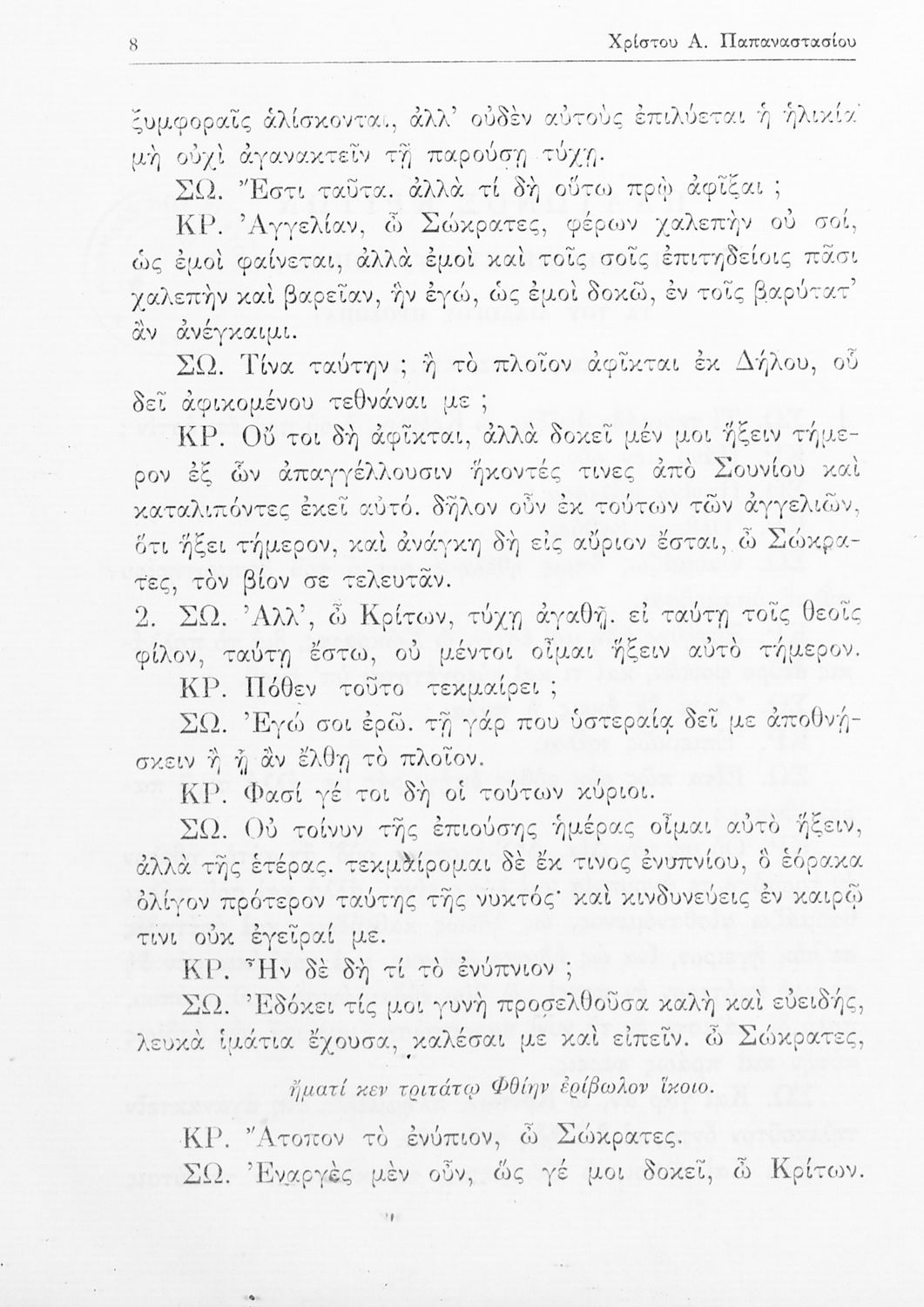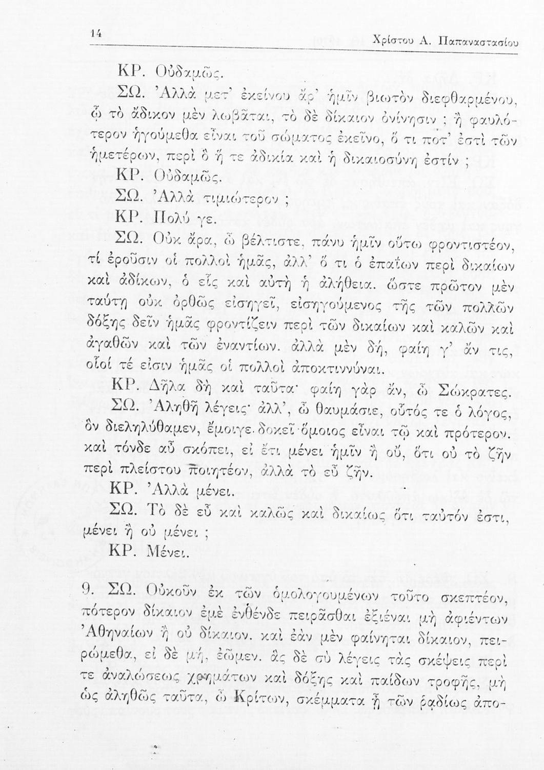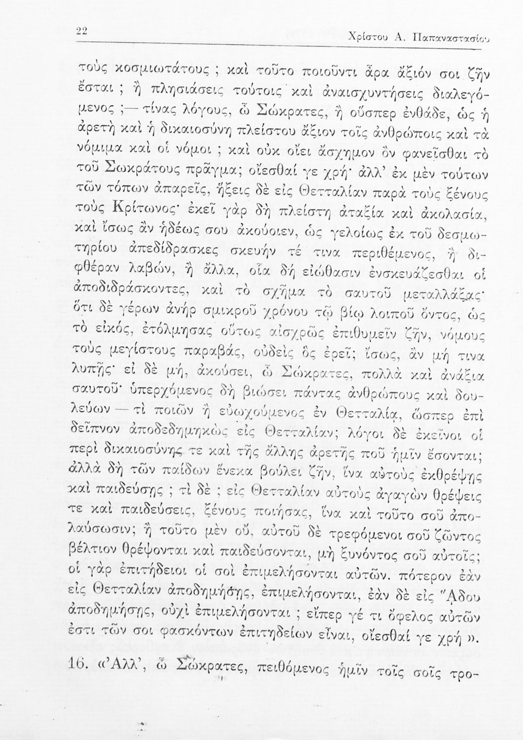Σχολικό εγχειρίδιο Αρχαίων Ελληνικών της Ε ' Γυμνασίου. Το βιβλίο περιλαμβάνει το έργο του Πλάτωνα, Κρίτων. Ξεκινάει με μια εισαγωγή για τη ζωή και το έργο του Πλάτωνα, συνεχίζει με το απόσπασμα από το πρωτότυπο έργο του Πλάτωνα και κλείνει με ερμηνευτικές σημειώσεις του συγγραφέα.