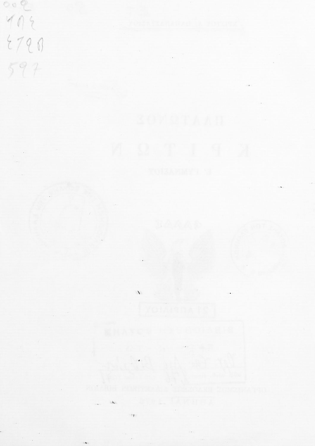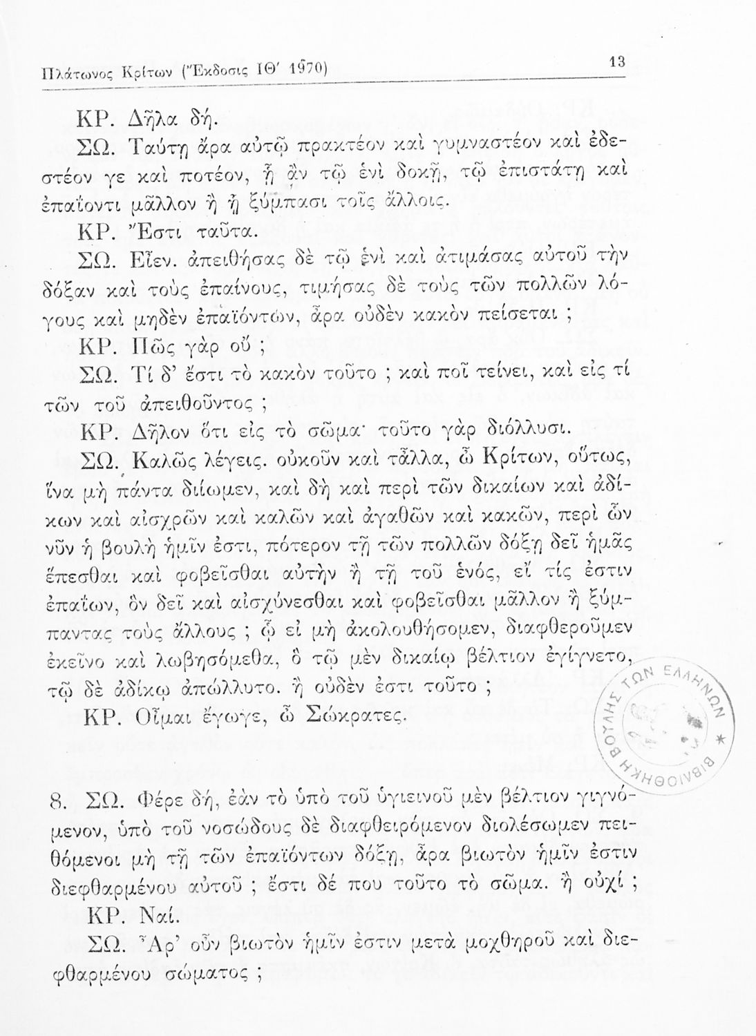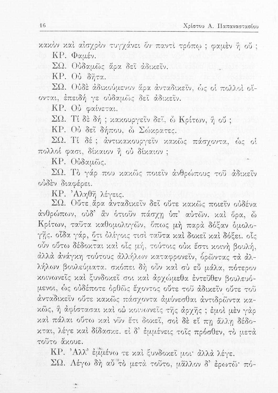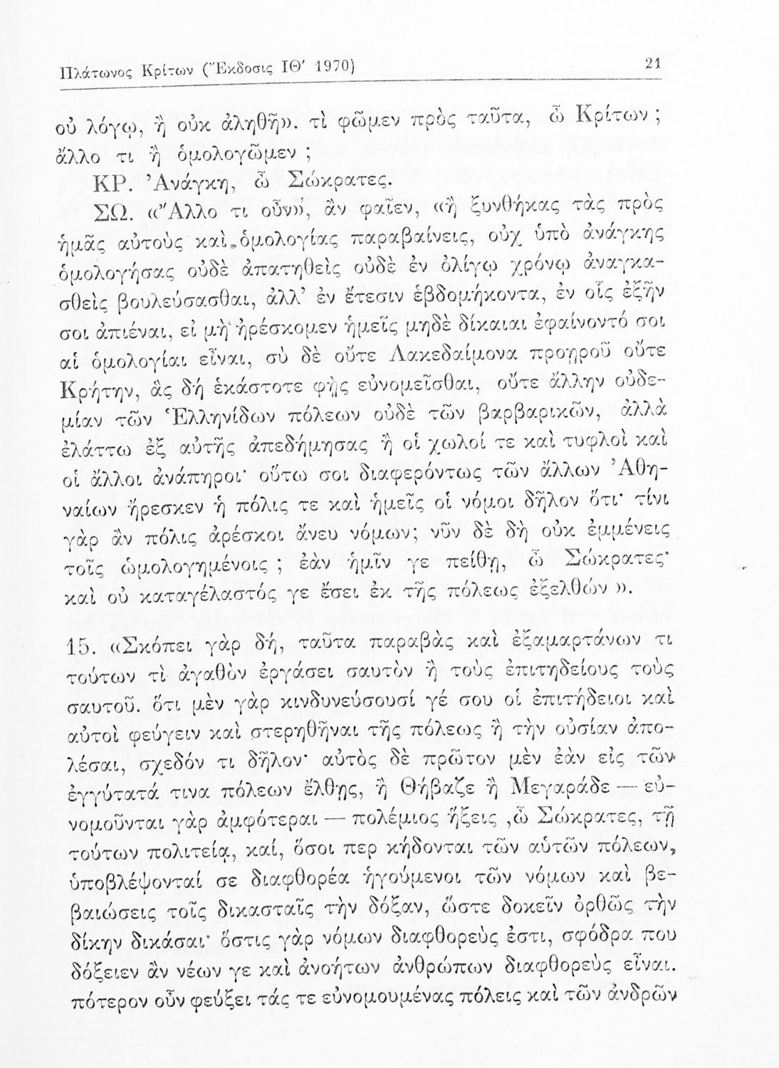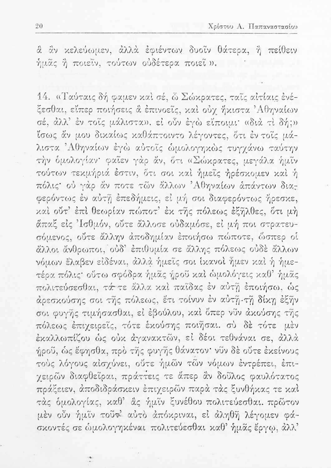 Σχολικό εγχειρίδιο Αρχαίων Ελληνικών της Ε ' Γυμνασίου. Το βιβλίο περιλαμβάνει το έργο του Πλάτωνα, Κρίτων. Ξεκινάει με μια εισαγωγή για τη ζωή και το έργο του Πλάτωνα, συνεχίζει με το απόσπασμα από το πρωτότυπο έργο του Πλάτωνα και κλείνει με ερμηνευτικές σημειώσεις του συγγραφέα.