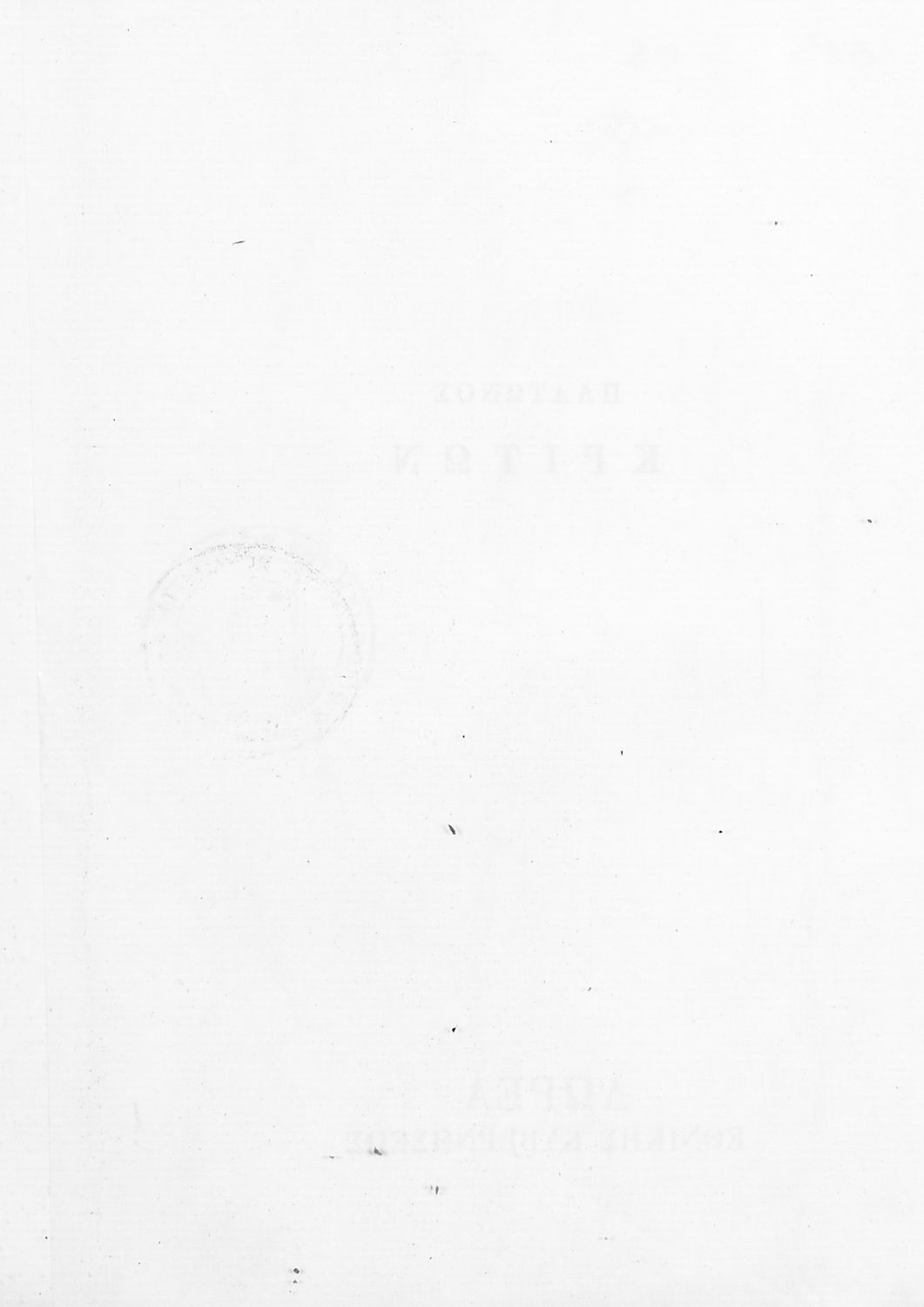 Βαθμίδα εκπαίδευσης: Δευτεροβάθμια Τάξη: Ε' Γυμνασίου Μάθημα: Αρχαία Ελληνικά Γλώσσα: Απλή καθαρεύουσα Παρουσίαση περιεχομένου: Σχολικό εγχειρίδιο Αρχαίων Ελληνικών της Ε ' Γυμνασίου. Το βιβλίο περιλαμβάνει το έργο του Πλάτωνα, Κρίτων. Ξεκινάει με μια εισαγωγή για τη ζωή και το έργο του Πλάτωνα, συνεχίζει με το απόσπασμα από το πρωτότυπο έργο του Πλάτωνα και κλείνει με ερμηνευτικές σημειώσεις του συγγραφέα. |