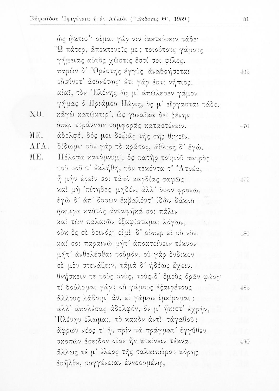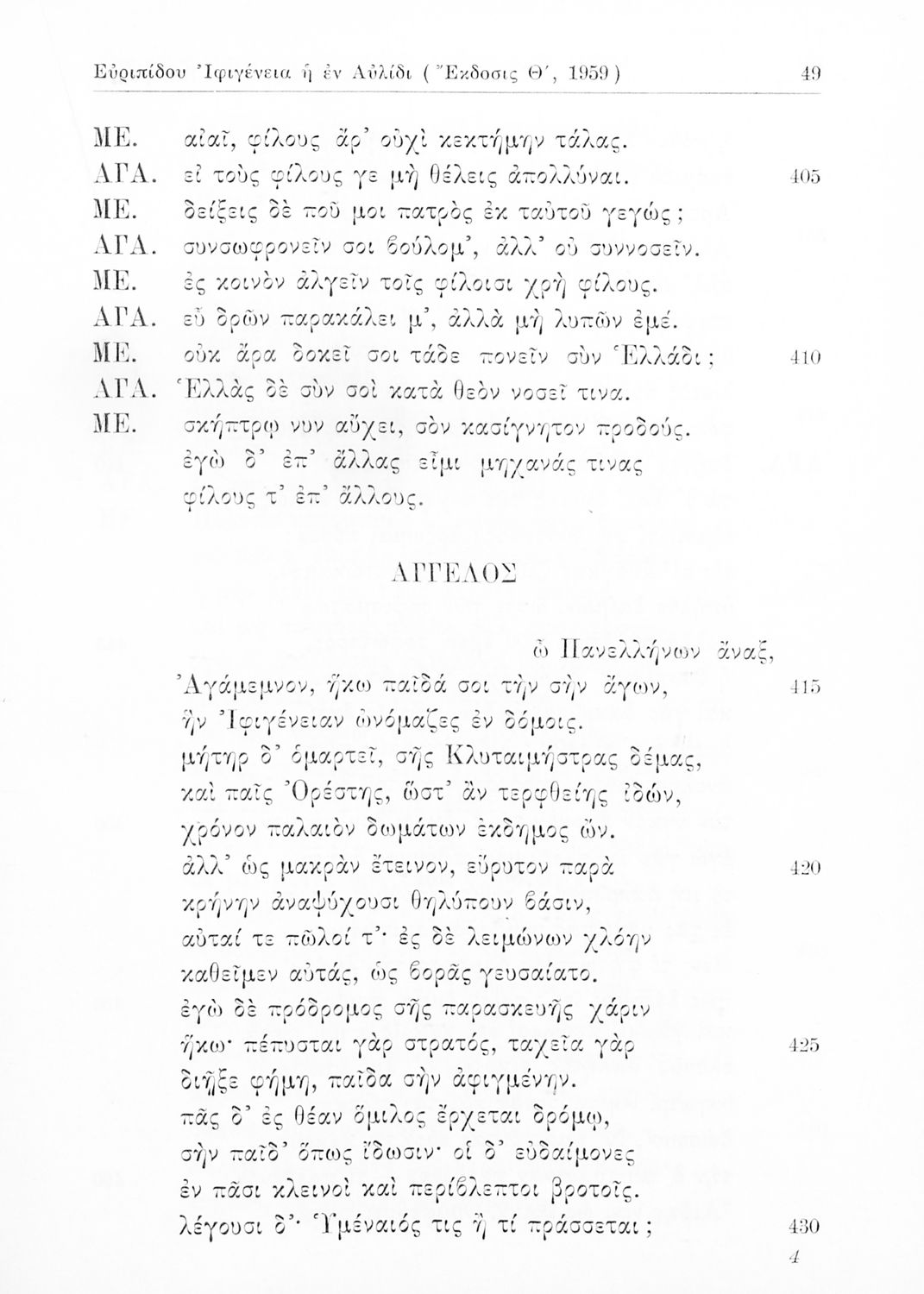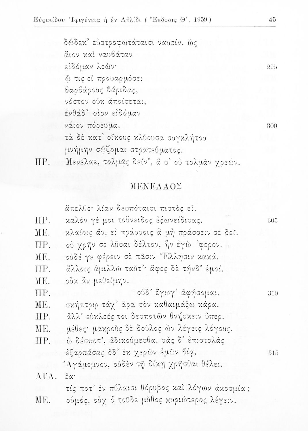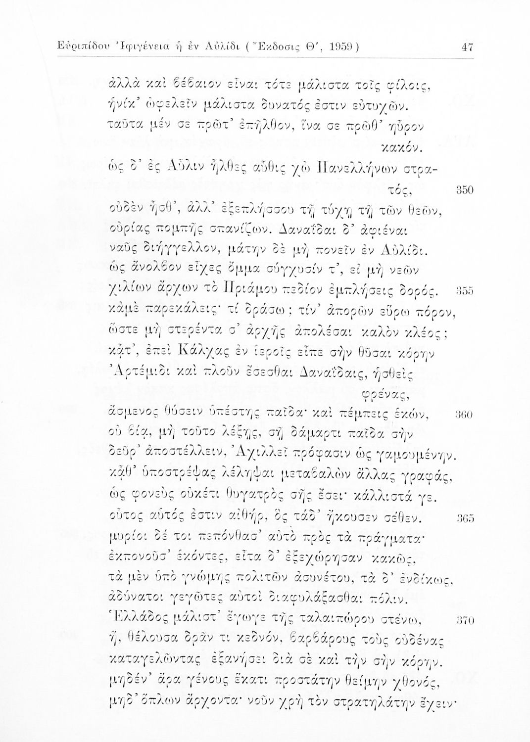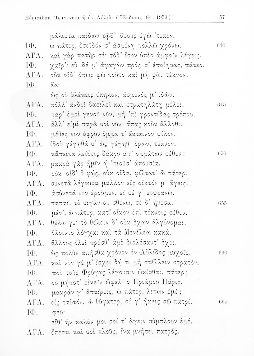 Σχολικό εγχειρίδιο Αρχαίων Ελληνικών Γυμνασίου που περιλαμβάνει αποσπάσματα τις τραγωδίες του Ευριπίδη Ιφιγένεια η εν Αυλίδι και Ιφιγένεια η εν Ταύροις, ερμηνευτικά και πραγματολογικά σχόλια και λεξιλογικές παρατηρήσεις.