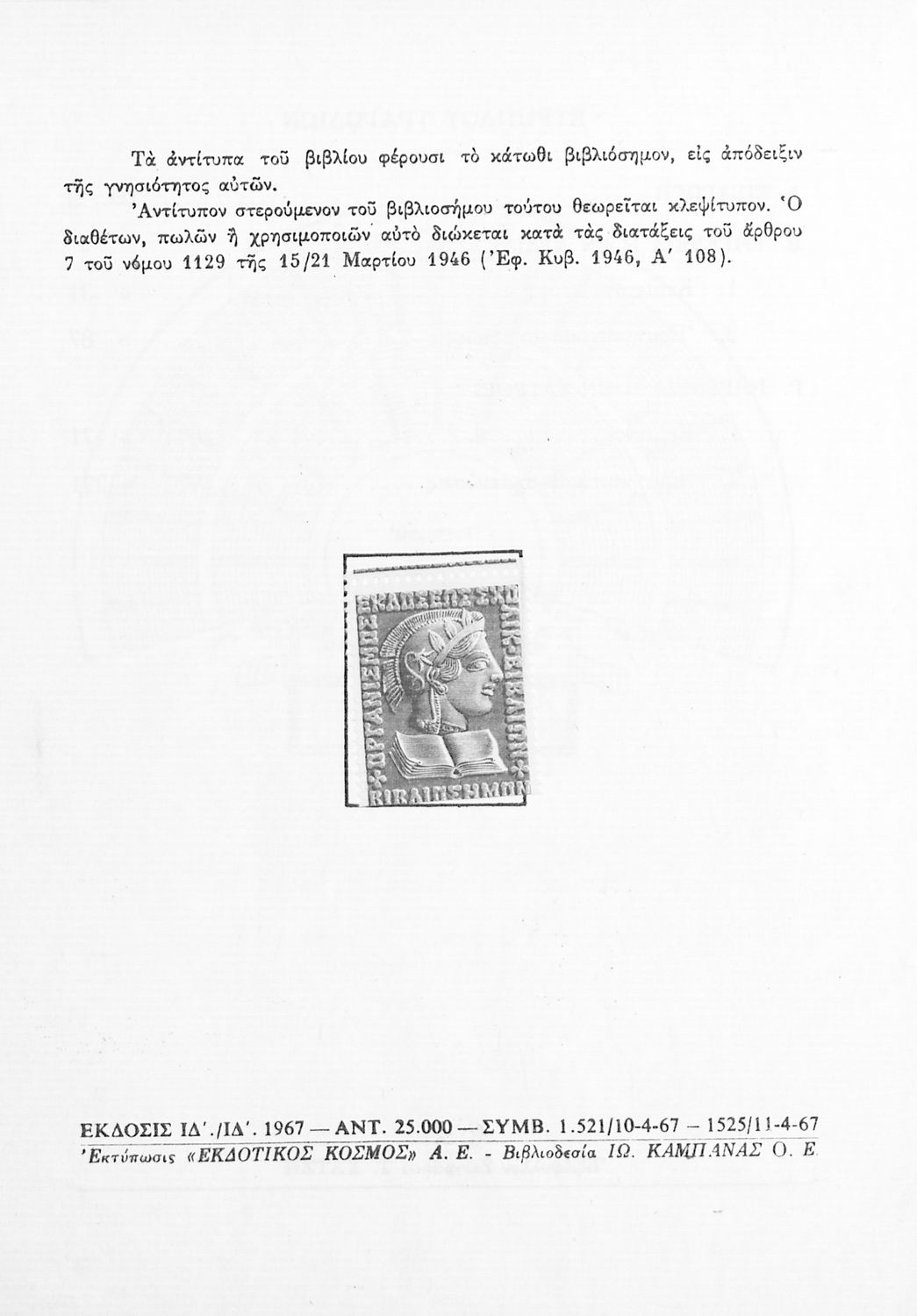 Εκδότης: Οργανισμός Εκδόσεως Διδακτικών Βιβλίων Έτος έκδοσης: 1967 Τόπος έκδοσης: Αθήνα Έκδοση: 14η Υπουργική απόφαση / Σύμβαση: 1521/10-4-1967, 1525/11-4-1967 Έτος έγκρισης: 1967 |