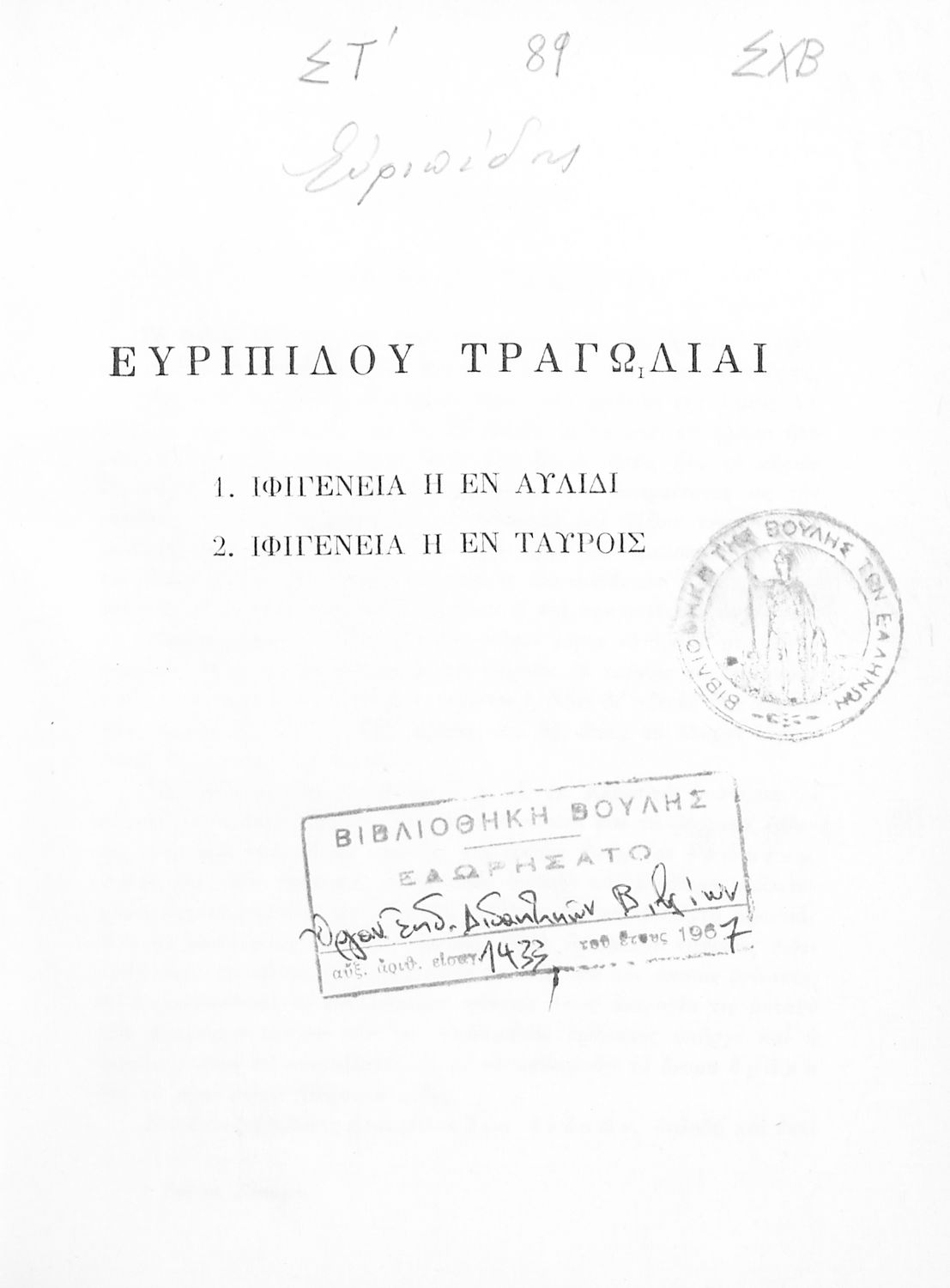 Σχολικό εγχειρίδιο Αρχαίων Ελληνικών Β΄ Λυκείου που περιέχει εισαγωγή στο αρχαίο δράμα και στη ζωή και το έργο του Ευριπίδη, αποσπάσματα από την Ιφιγένεια η εν Αυλίδι και την Ιφιγένεια η εν Ταύροις και ερμηνευτικά σχόλια.
