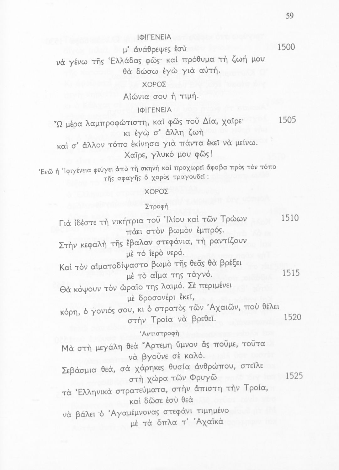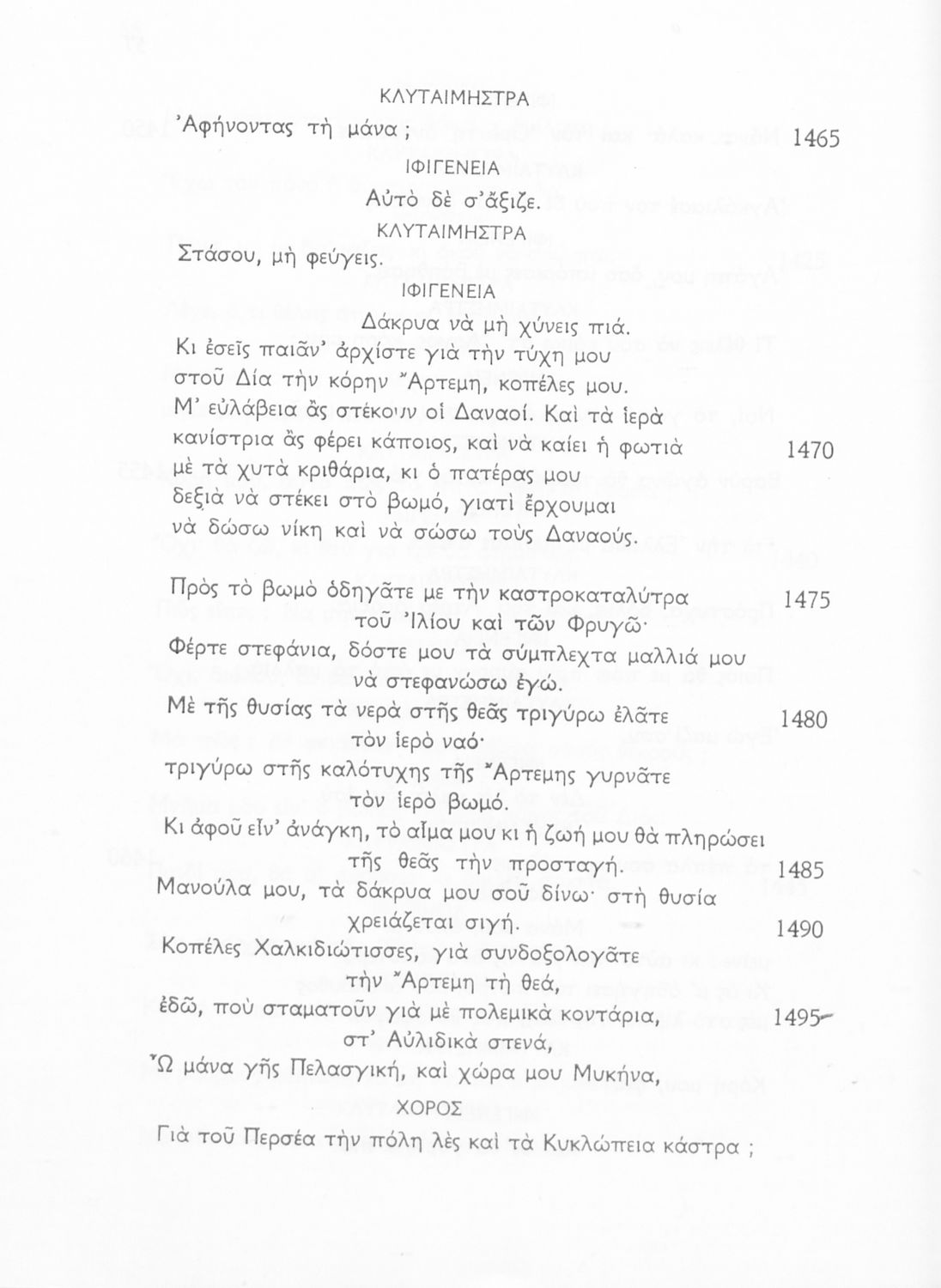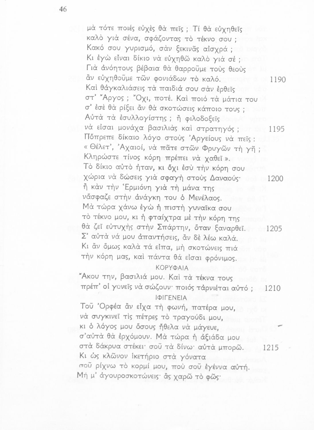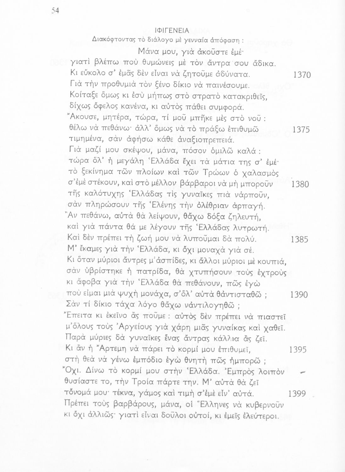 Σχολικό εγχειρίδιο Αρχαίων Ελληνικών Γ΄ Γυμνασίου που περιλαμβάνει το έργο του Ευριπίδη, Ιφιγένεια εν Αυλίδι σε μετάφραση και ερμηνευτικά και γλωσσολογικά σχόλια. Στο εξώφυλλο απεικονίζεται η Μαντώ Μαυρογένους. Φέρει το σύμβολο της δικτατορίας.