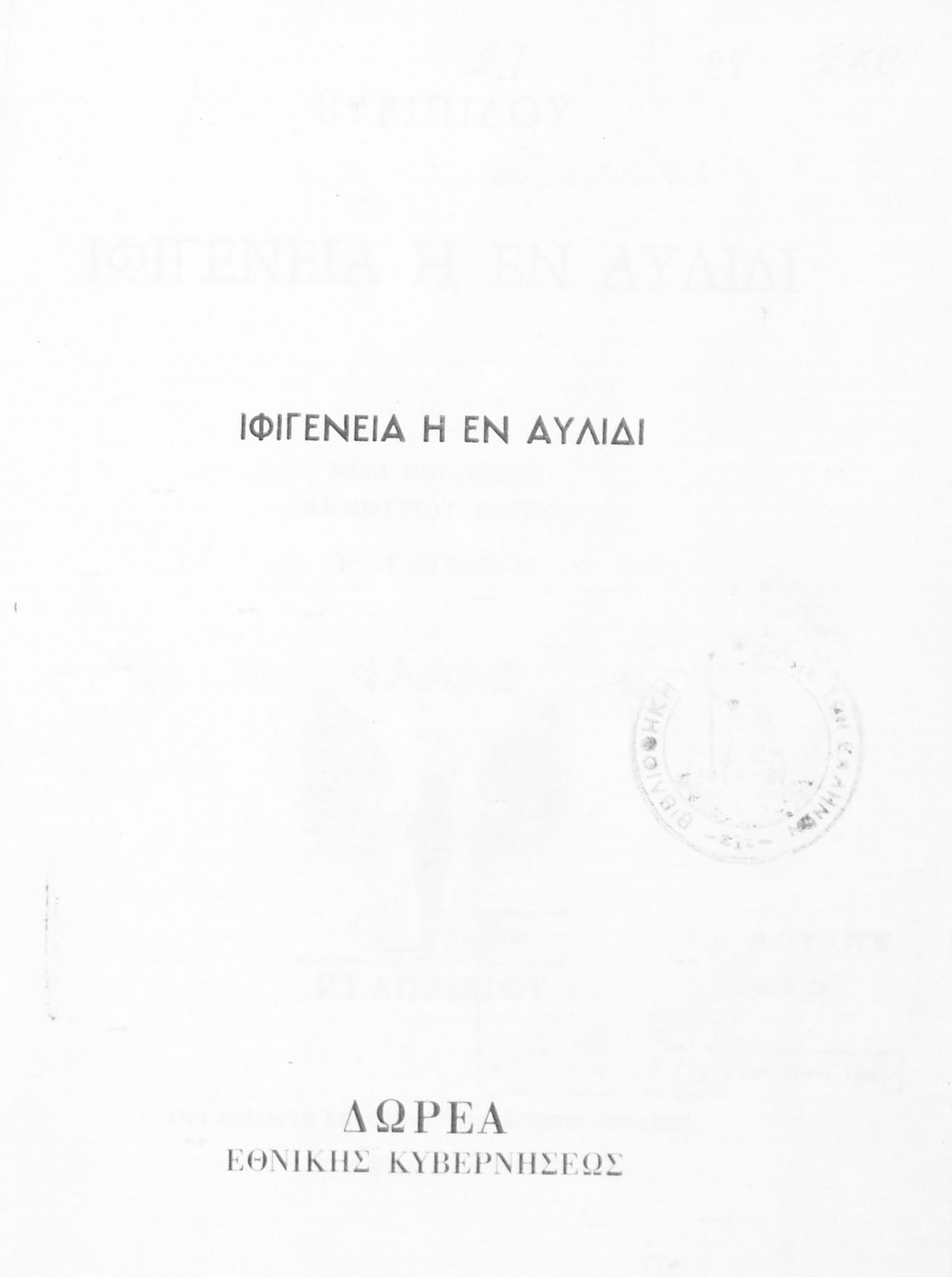 Σχολικό εγχειρίδιο Αρχαίων Ελληνικών για τη Γ' Γυμνασίου που περιλαμβάνει τη τραγωδία του Ευριπίδη Ιφιγένεια η εν Αυλίδι σε μετάφραση και ερμηνευτικές σημειώσεις. Φέρει το σύμβολο της δικτατορίας.