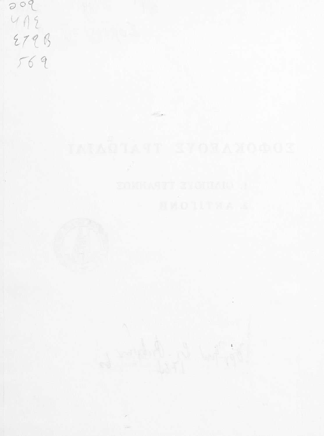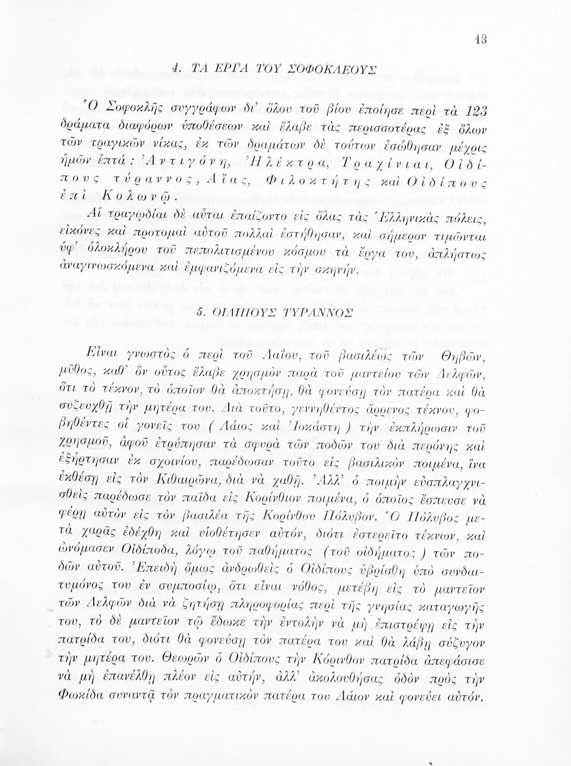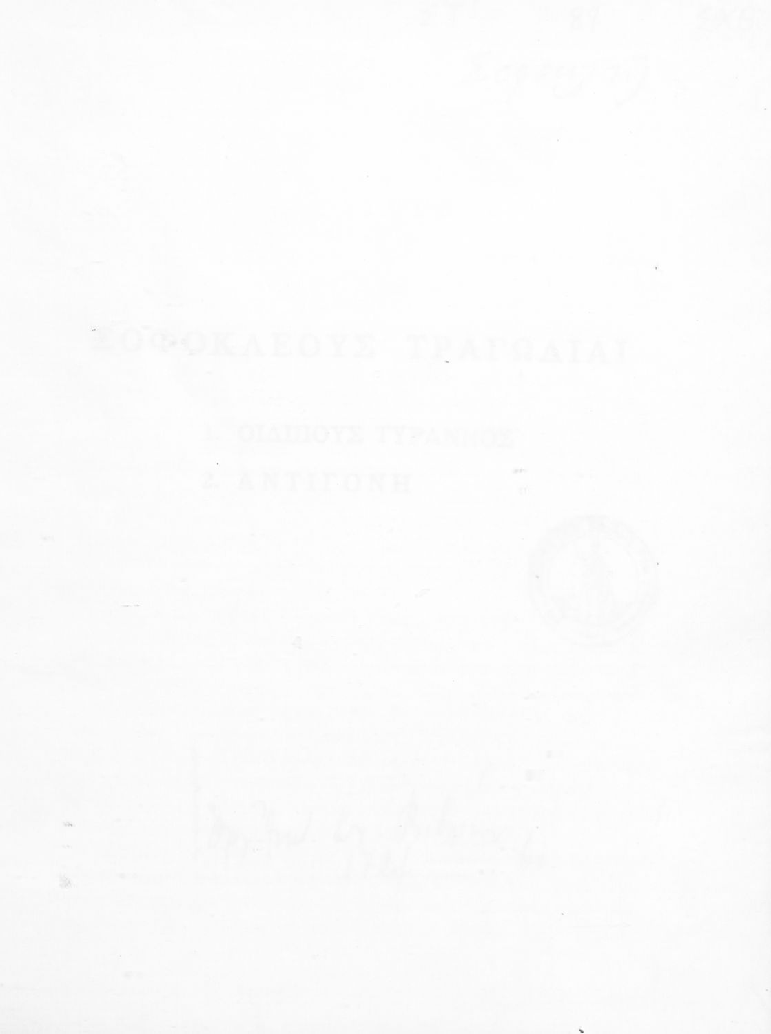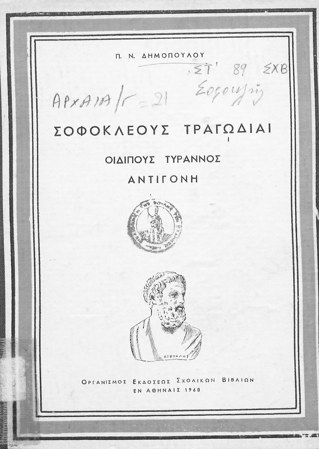 Σχολικό εγχειρίδιο Αρχαίων Ελληνικών του Γυμνασίου. Το βιβλίο περιέχει τις δύο τραγωδίες του Σοφοκλή, τον Οιδίπους Τύραννο και την Αντιγόνη. Στο βιβλίο τα έργα συνοδεύονται από γλωσσολογικές σημειώσεις και αναλύσεις περιεχομένου.