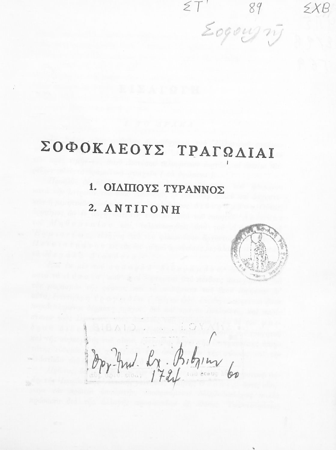 Κωδικός αναγνώρισης: 03-20556663 Τίτλος: Σοφοκλέους Τραγωδίαι –Οιδίπους Τύραννος – Αντιγόνη Συγγραφέας: Σοφοκλής, Π. Ν. Δημόπουλος (εισαγωγή, σχόλια) Μέγεθος και υπόστρωμα: Σχολικό εγχειρίδιο, σκληρό εξώφυλλο, 262 σελίδες. |