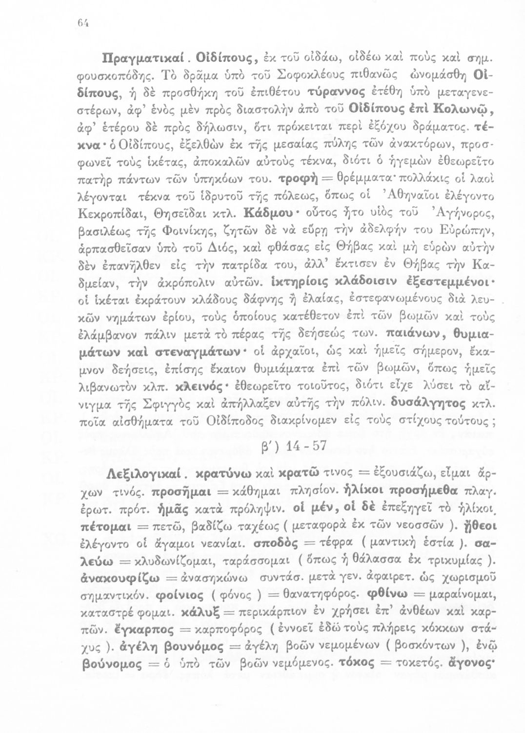Σχολικό εγχειρίδιο Αρχαίων Ελληνικών που περιλαμβάνει τις τραγωδίες του Σοφοκλή Οιδίπους Τύραννος και Αντιγόνη, εισαγωγή και ερμηνευτικά σχόλια.