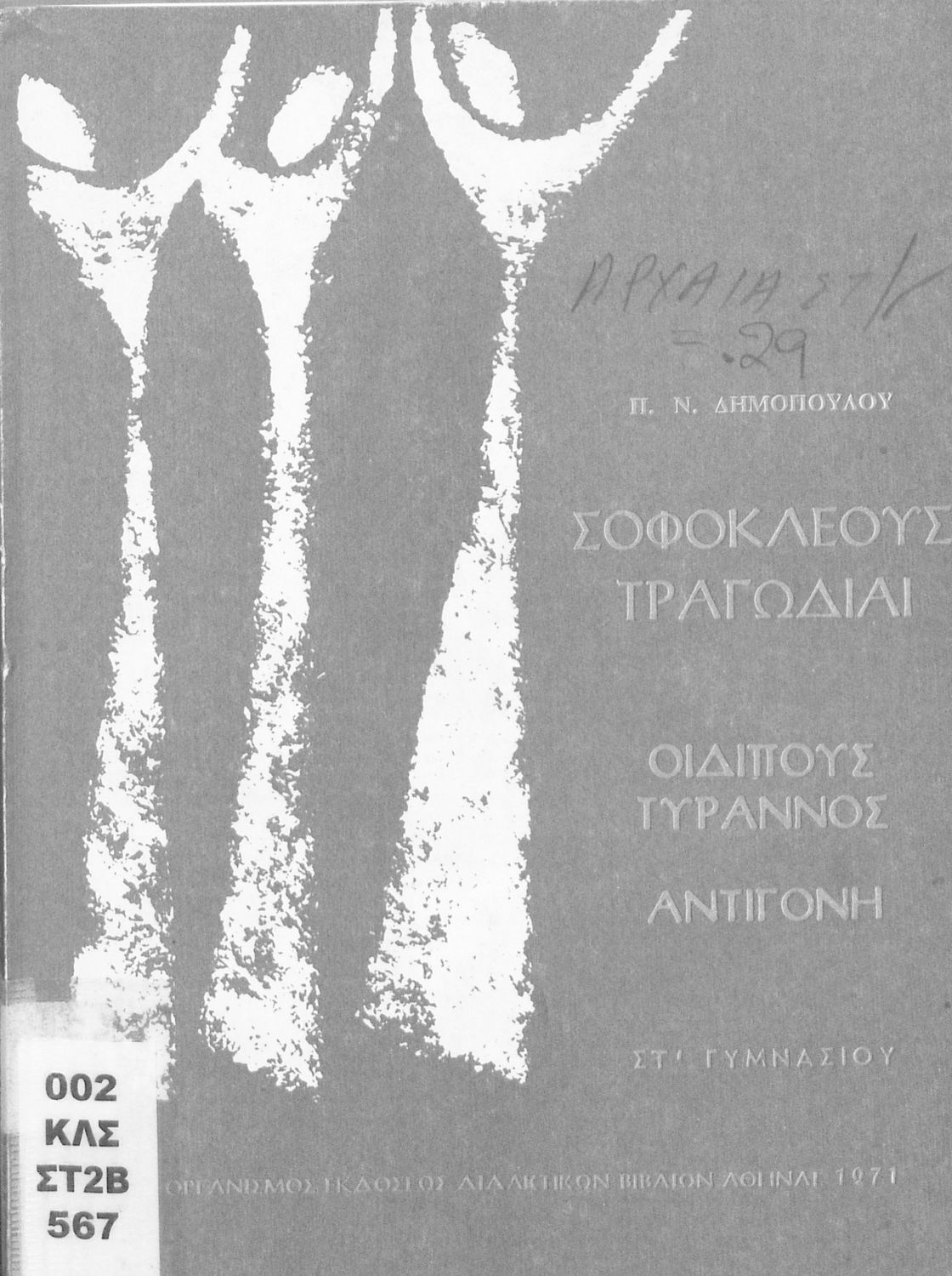 Σχολικό εγχειρίδιο Αρχαίων Ελληνικών της ΣΤ΄ Γυμνασίου. Το βιβλίο περιέχει δύο τραγωδίες του Σοφοκλή, τον Οιδίπους Τύραννο και την Αντιγόνη. Τα έργα αυτά συνοδεύονται από αναλύσεις λεξιλογικές και αναφορικά με
