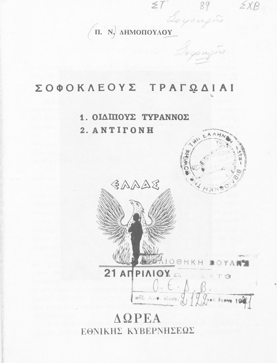 Τίτλος: Σοφοκλέους Τραγωδίαι –Οιδίπους Τύραννος – Αντιγόνη ΣΤ΄ Γυμνασίου