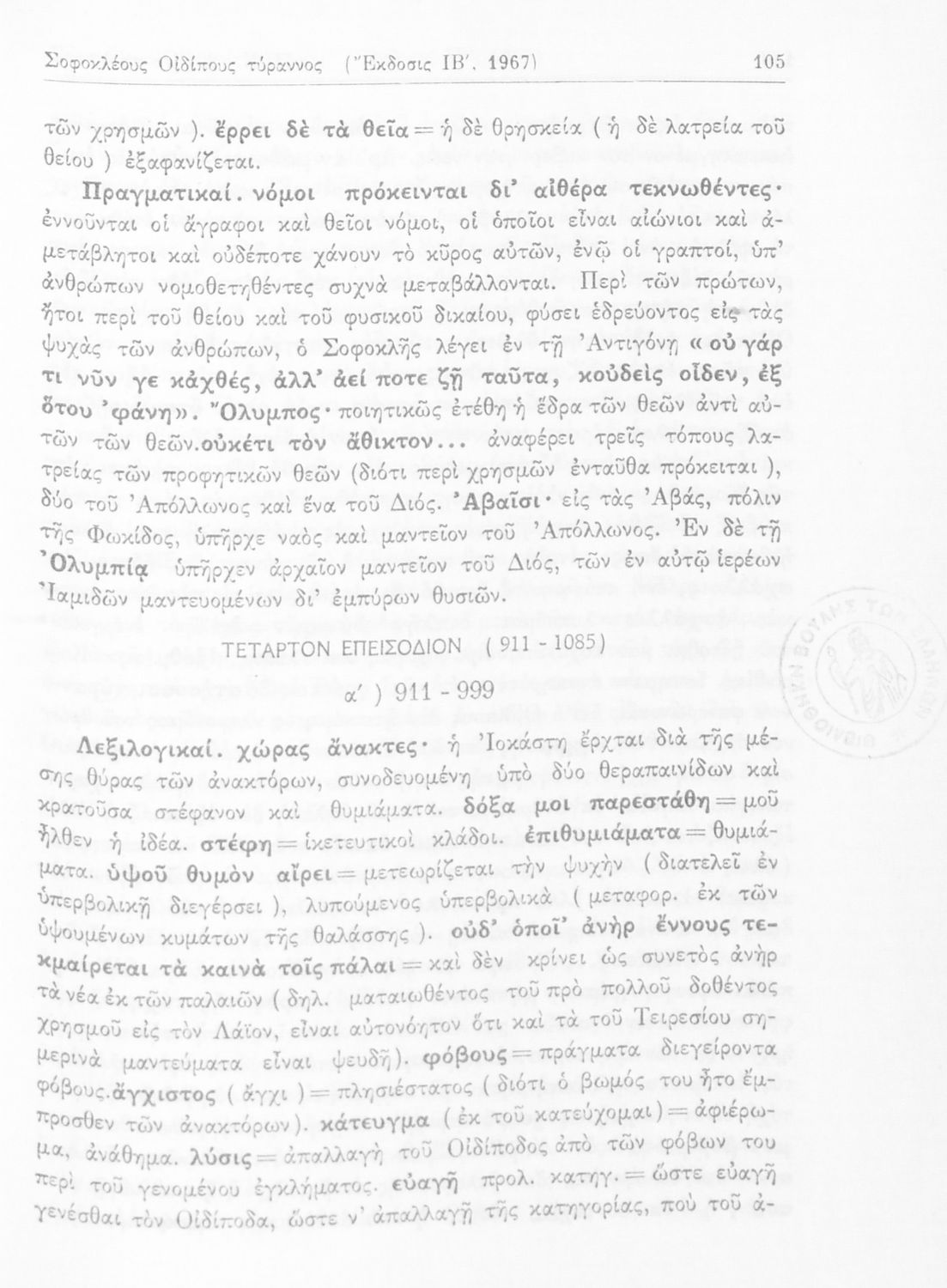 Σχολικό εγχειρίδιο Αρχαίων Ελληνικών που περιλαμβάνει τις τραγωδίες του Σοφοκλή Οιδίπους Τύραννος και Αντιγόνη, εισαγωγή και ερμηνευτικά σχόλια.