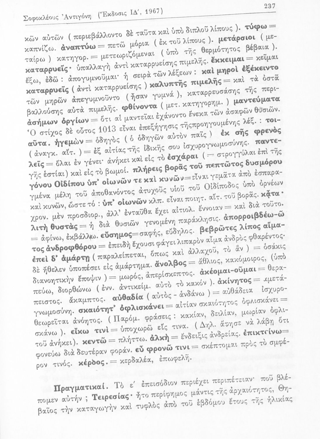 Σχολικό εγχειρίδιο Αρχαίων Ελληνικών που περιλαμβάνει τις τραγωδίες του Σοφοκλή Οιδίπους Τύραννος και Αντιγόνη, εισαγωγή και ερμηνευτικά σχόλια.