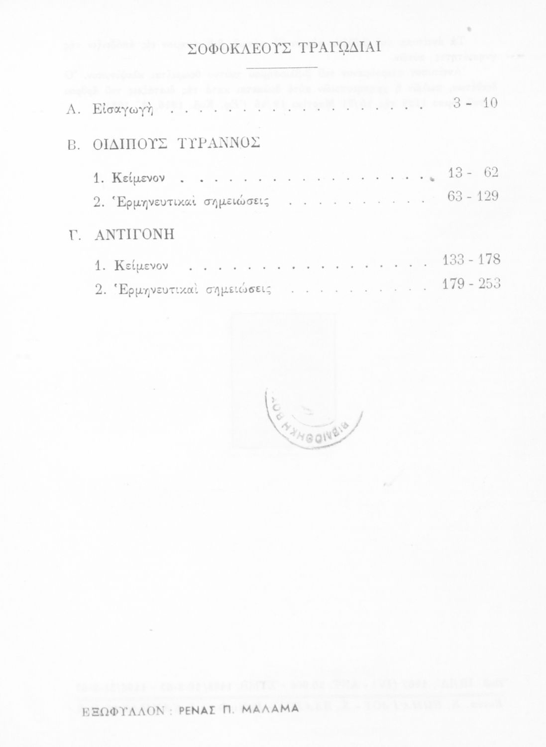 520 ## _aΣχολικό εγχειρίδιο της Γ΄ Λυκείου για το μάθημα των Αρχαίων Ελληνικών. Περιέχει τις τραγωδίες του Σοφοκλή Οιδίπους Τύραννος και Αντιγόνη. Τα κείμενα συνοδεύονται από ερμηνευτικές και λεξιλογικές παρατηρήσεις του συγγραφέα.