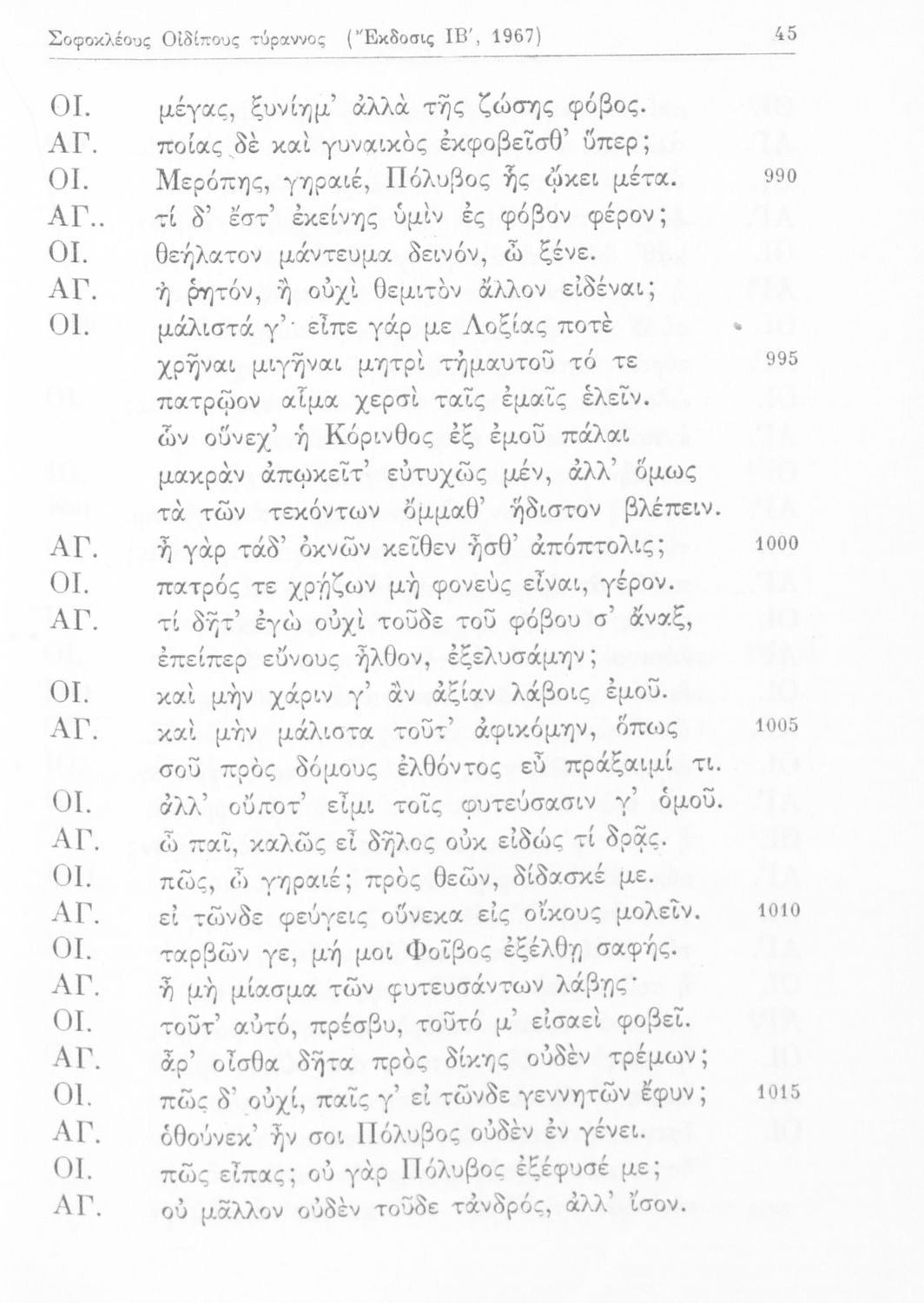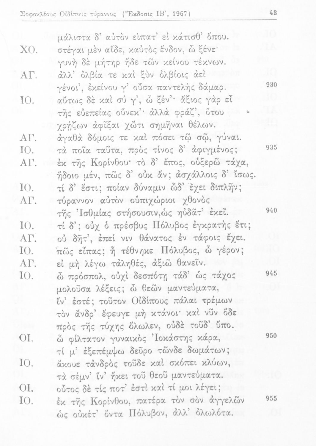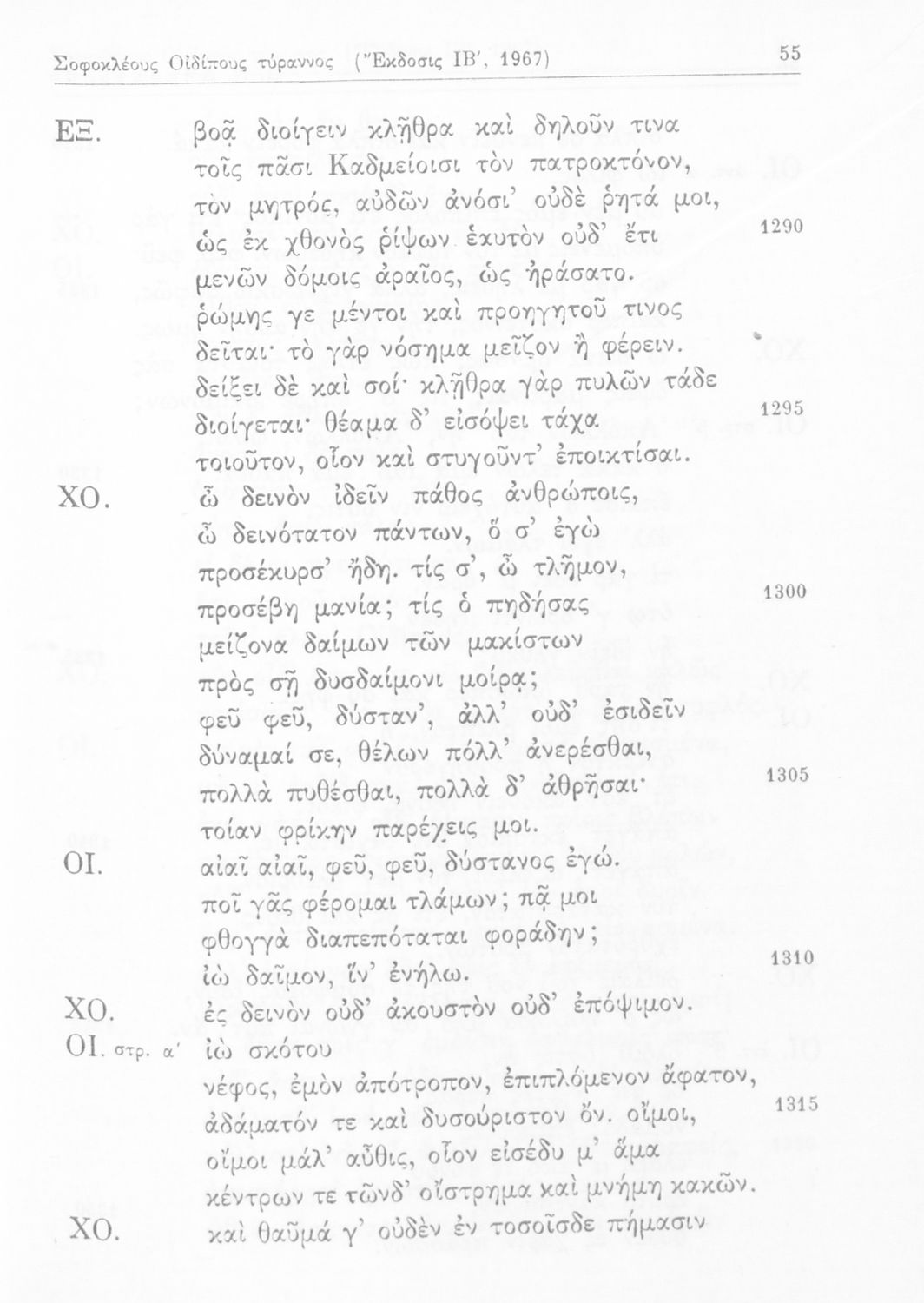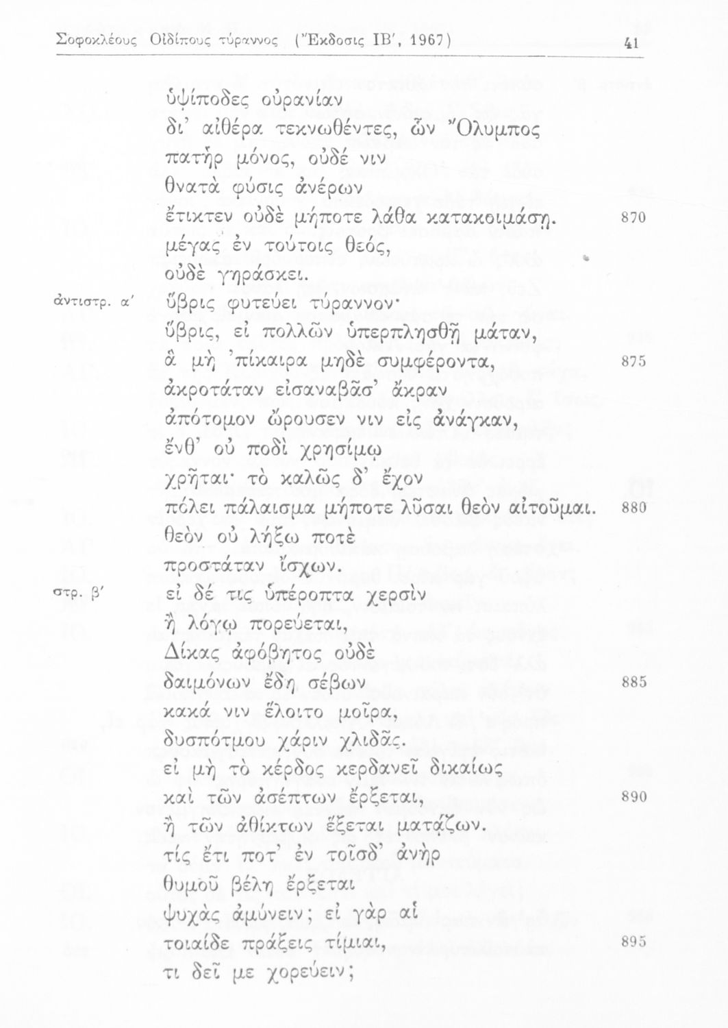520 ## _aΣχολικό εγχειρίδιο της Γ΄ Λυκείου για το μάθημα των Αρχαίων Ελληνικών. Περιέχει τις τραγωδίες του Σοφοκλή Οιδίπους Τύραννος και Αντιγόνη. Τα κείμενα συνοδεύονται από ερμηνευτικές και λεξιλογικές παρατηρήσεις του συγγραφέα.