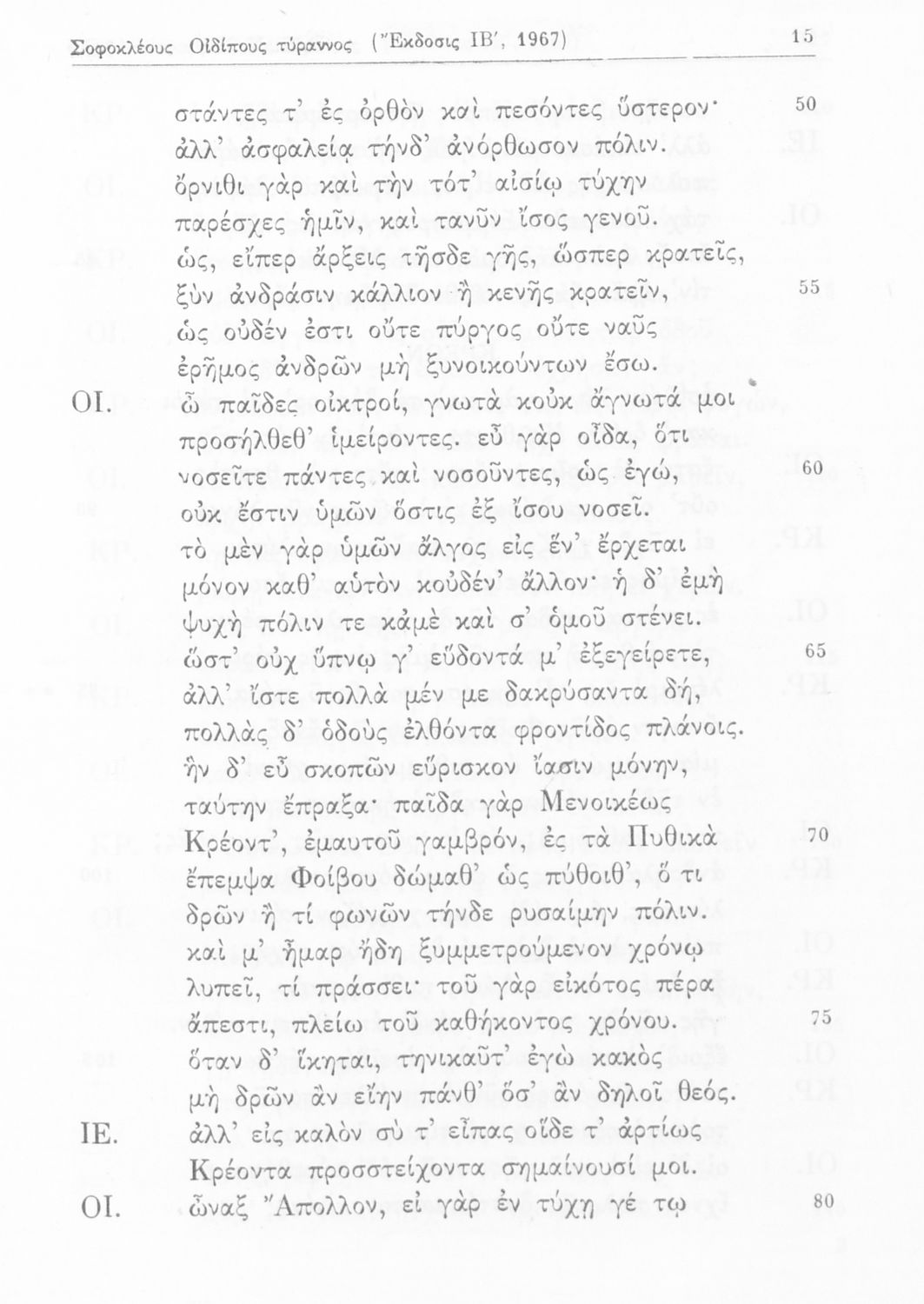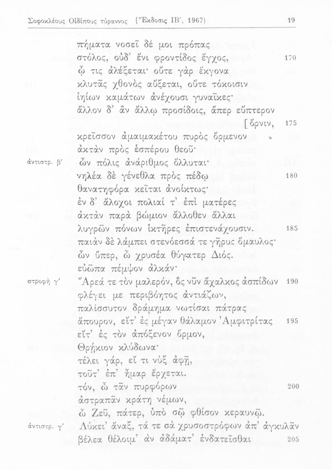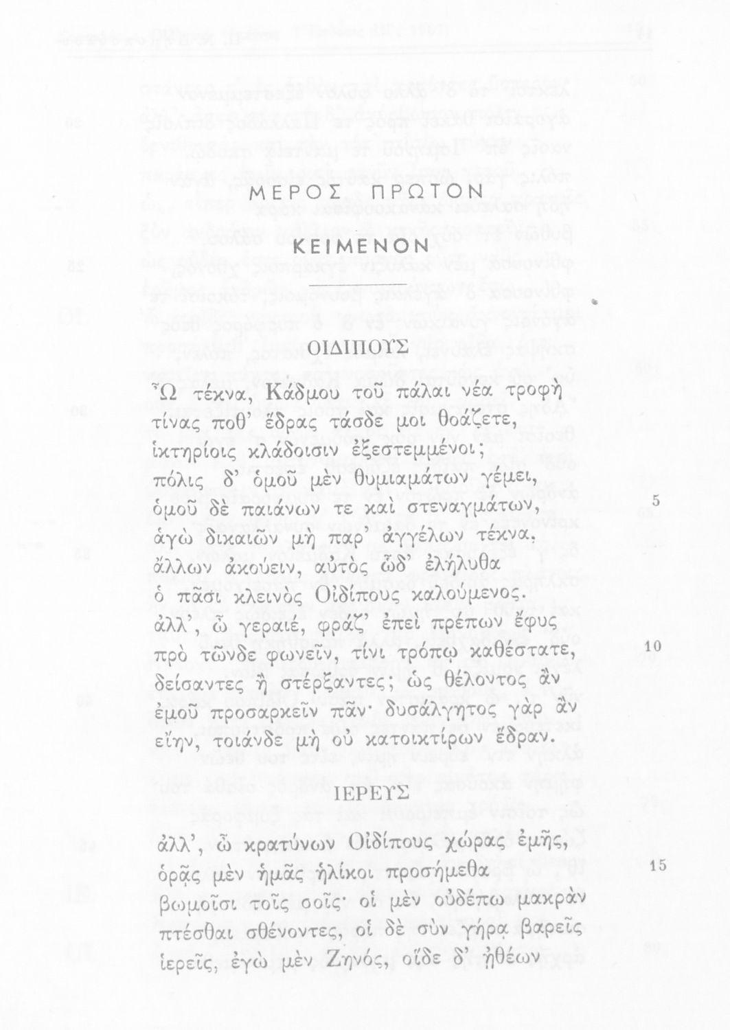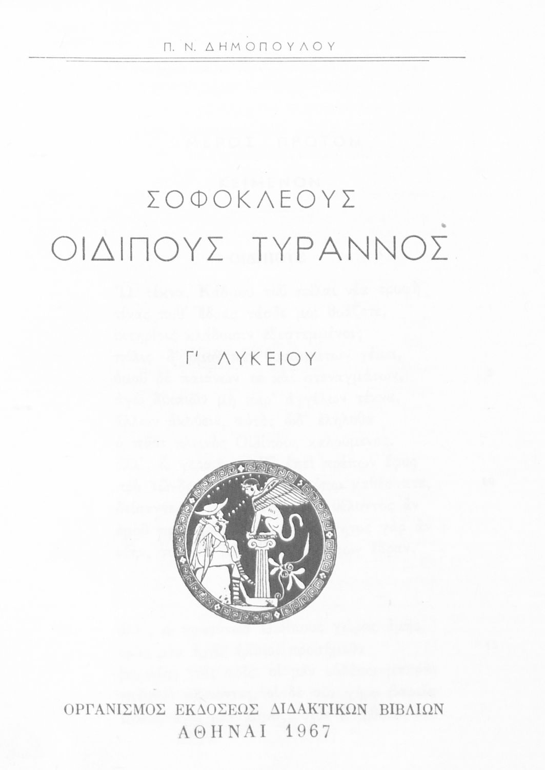 Σχολικό εγχειρίδιο της Γ΄ Λυκείου για το μάθημα των Αρχαίων Ελληνικών. Περιέχει τις τραγωδίες του Σοφοκλή Οιδίπους Τύραννος και Αντιγόνη. Τα κείμενα συνοδεύονται από ερμηνευτικές και λεξιλογικές παρατηρήσεις του συγγραφέα.
