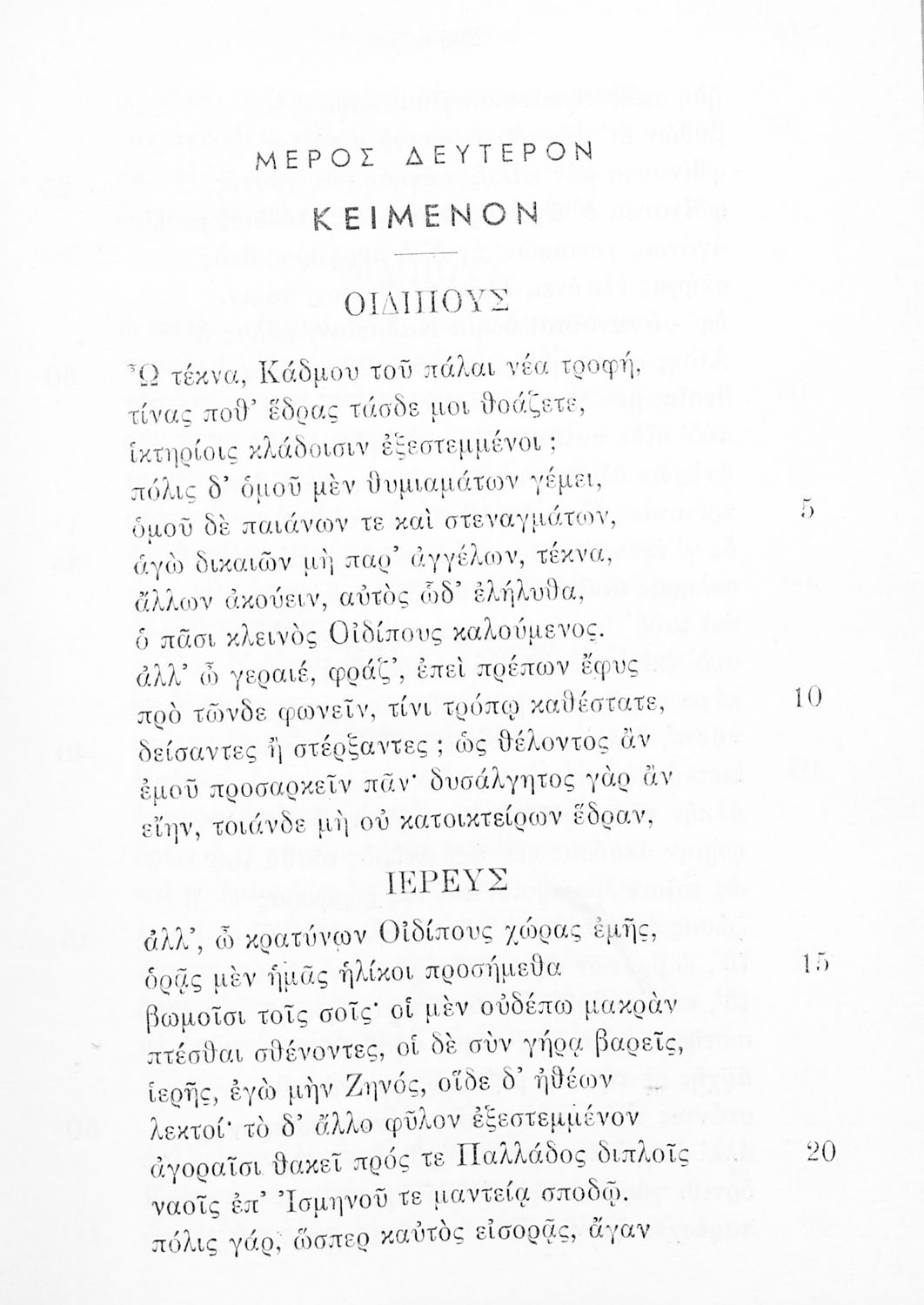 Σχολικό εγχειρίδιο Αρχαίων Ελληνικών της ΣΤ΄ Γυμνασίου. Το βιβλίο περιέχει την τραγωδία του Σοφοκλή “Οιδίπους Τύραννος”. Το έργο συνοδεύεται από αναλύσεις λεξιλογικές, πραγματολογικές, γραμματικές και συντακτικές.