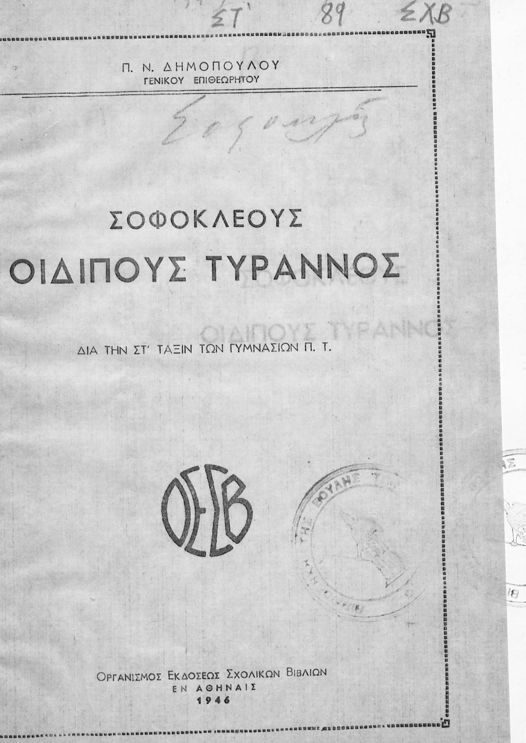 Σχολικό εγχειρίδιο Αρχαίων Ελληνικών της ΣΤ΄ Γυμνασίου το οποίο περιλαμβάνει μετάφραση του 'Οιδίπους Τύραννος' του Σοφοκλή.