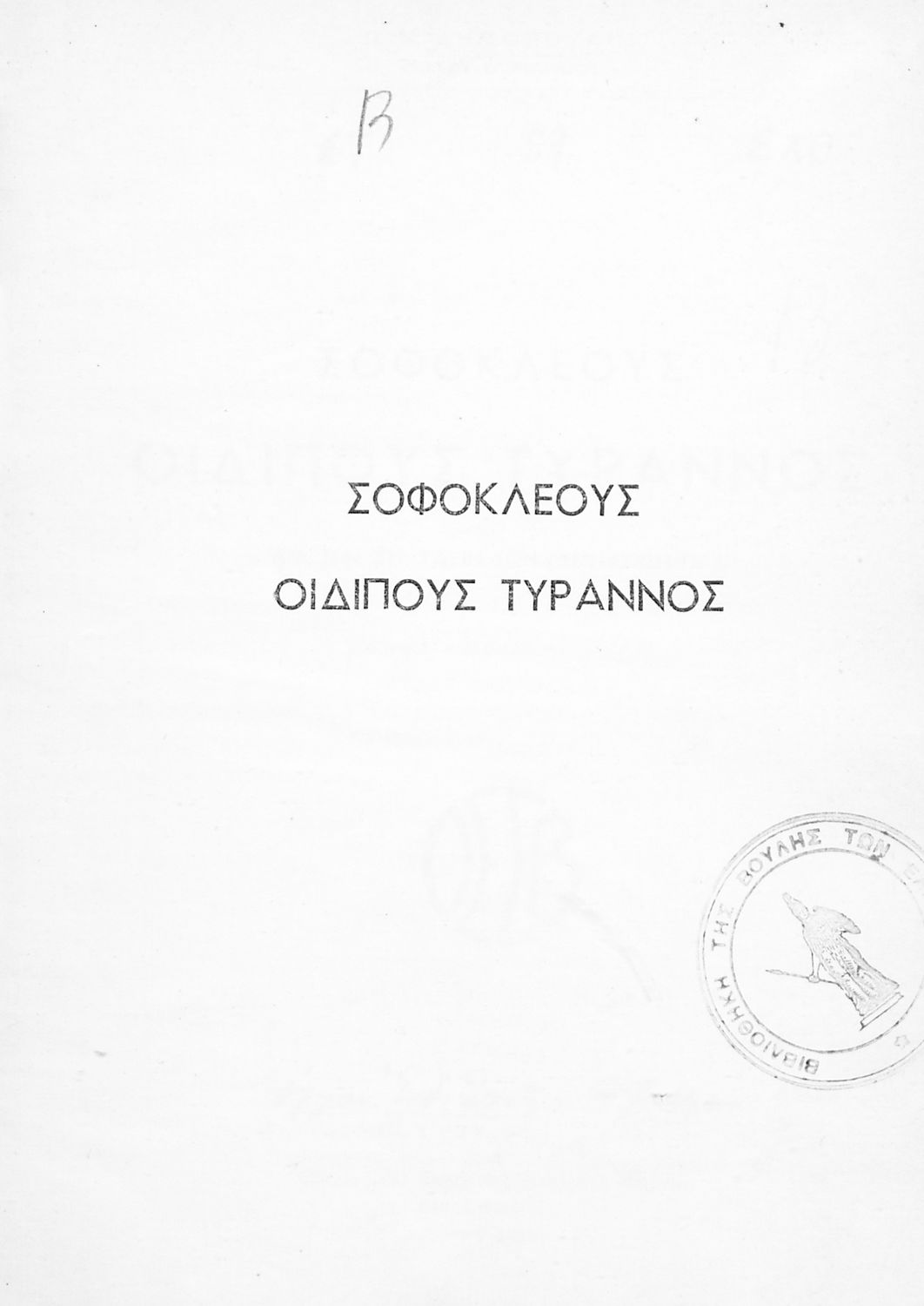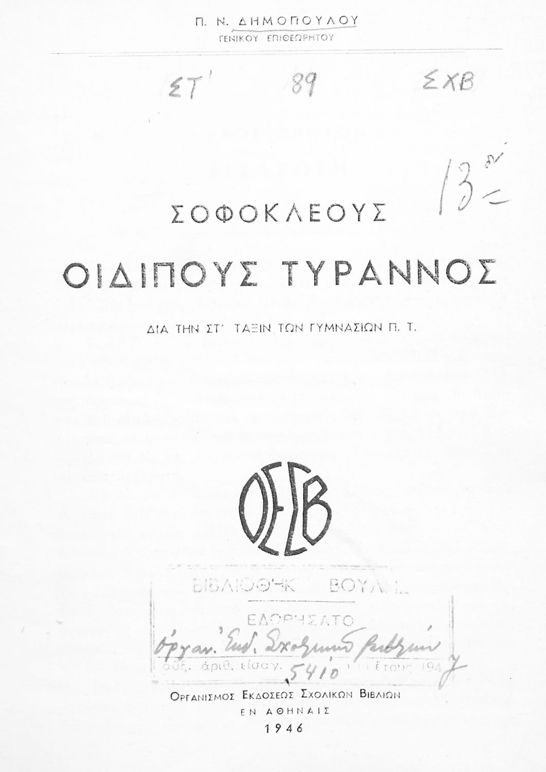 Τίτλος: Σοφοκλέους Οιδίπους Τύραννος, δια την ΣΤ΄ τάξιν των Γυμνασίων Π. Τ.