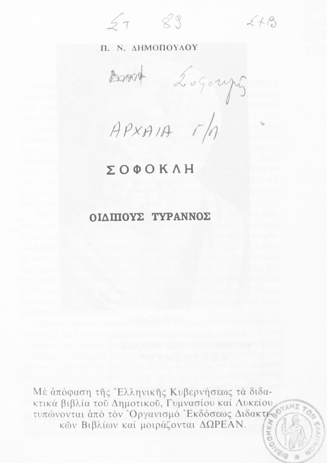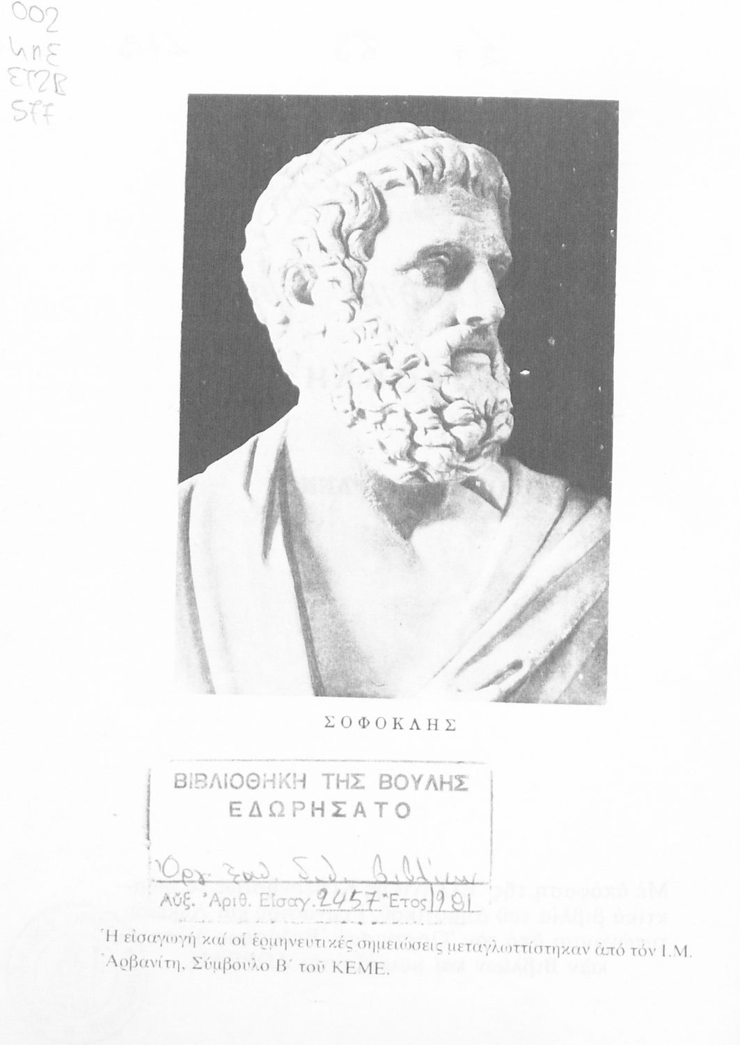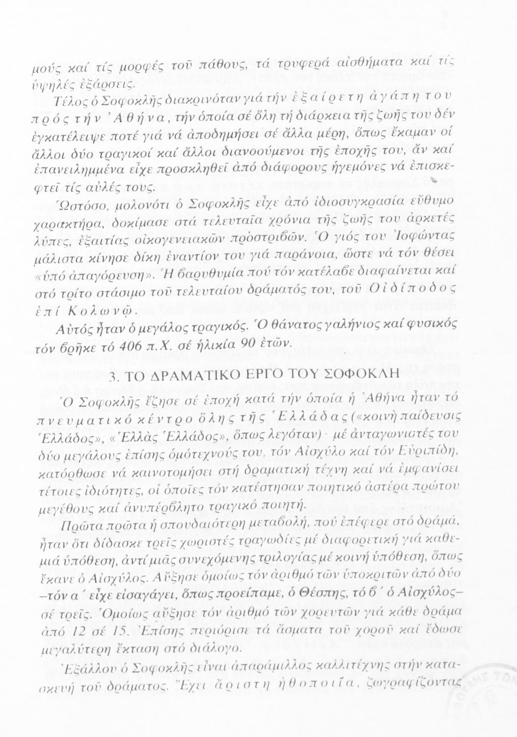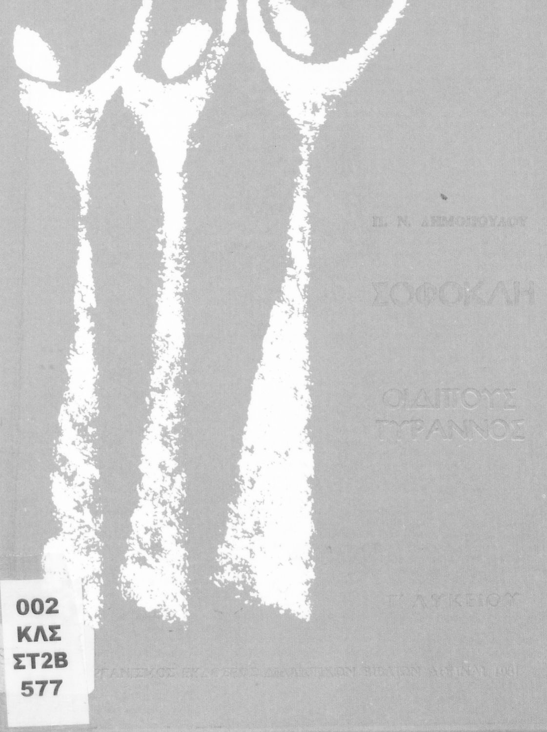 Σχολικό εγχειρίδιο Αρχαίων Ελληνικών της Γ΄ Λυκείου. Το βιβλίο περιέχει τις δύο τραγωδίες του Σοφοκλή, τον Οιδίπους Τύραννο και την Αντιγόνη. Στο βιβλίο τα έργα συνοδεύονται από γλωσσολογικές σημειώσεις και αναλύσεις περιεχομένου.