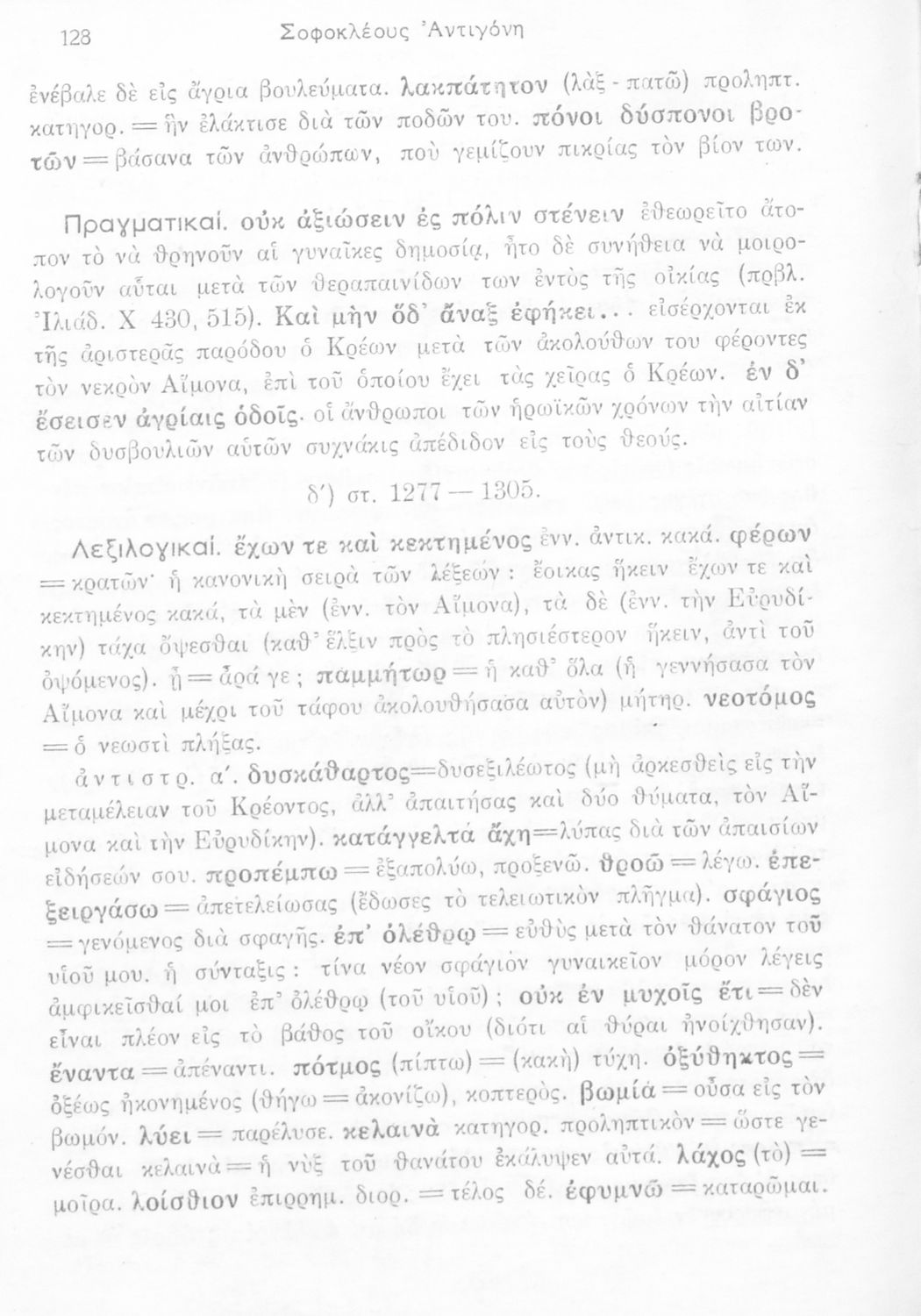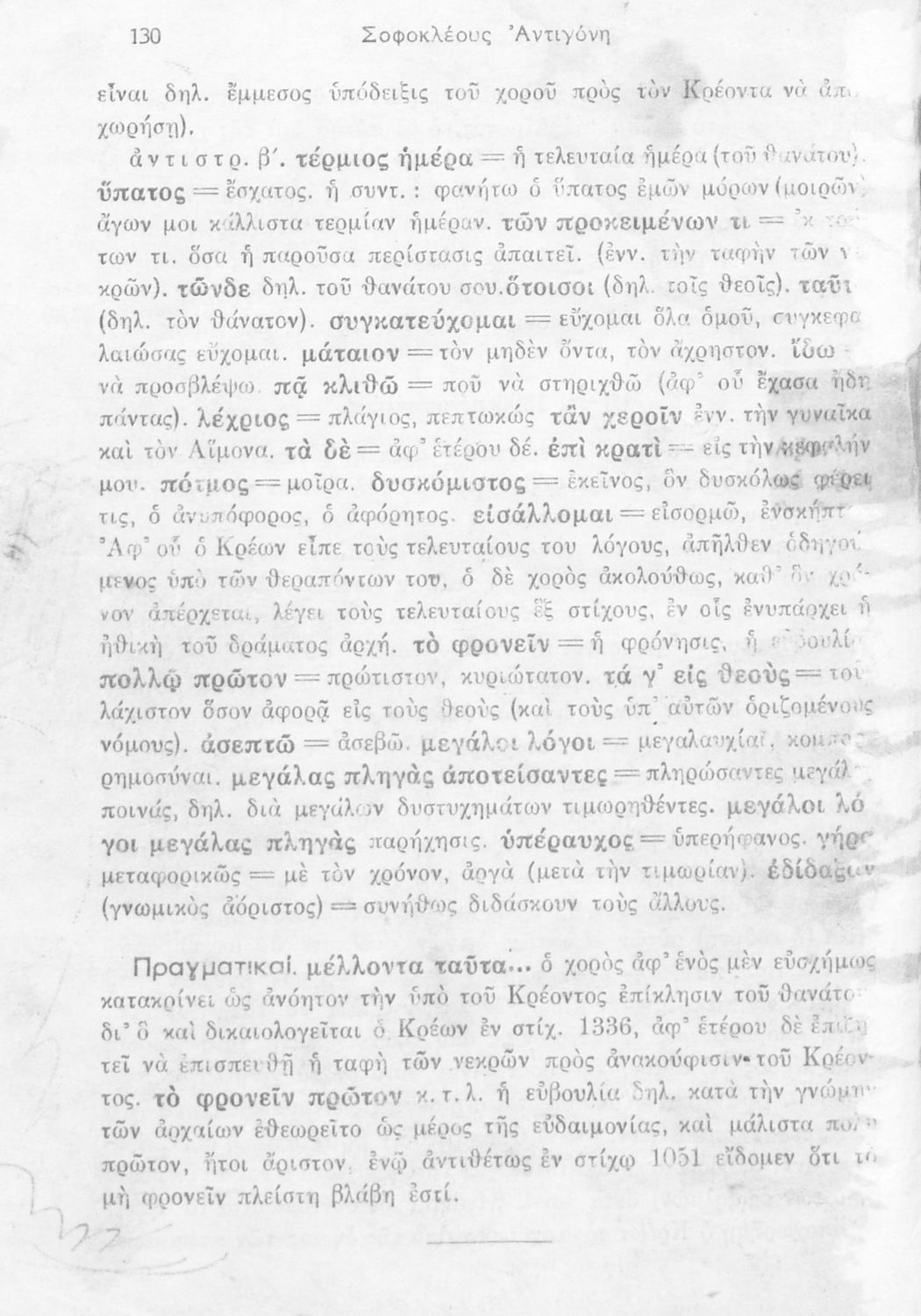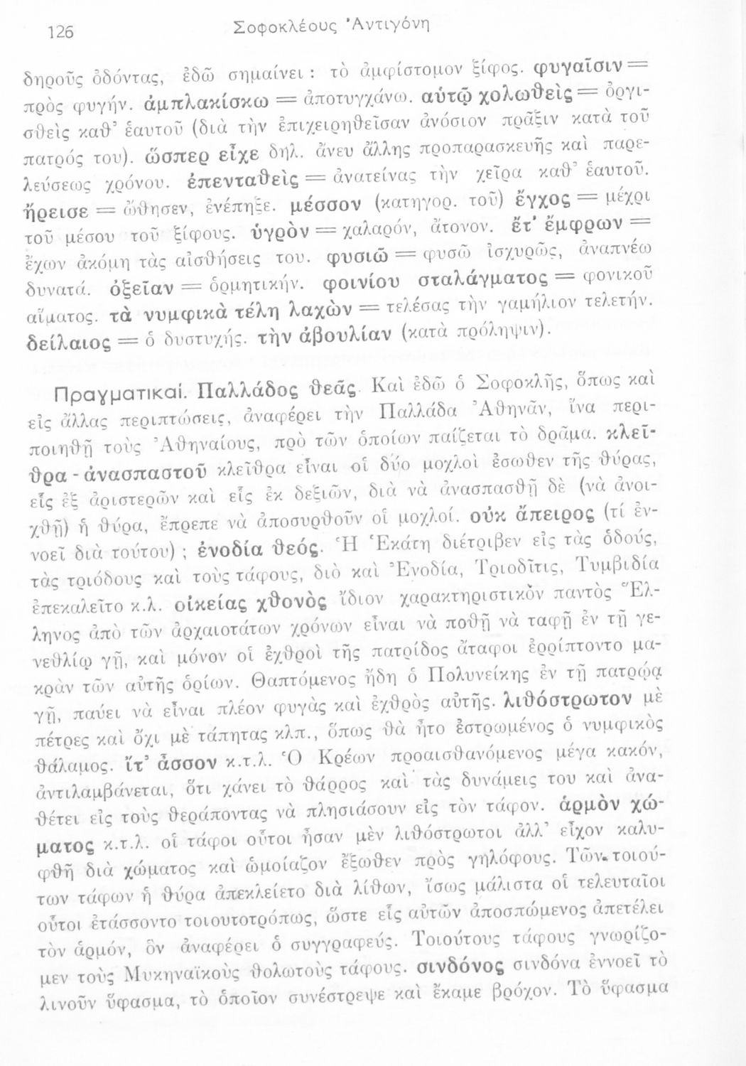 Σχολικό εγχειρίδιο Αρχαίων Ελληνικών της ΣΤ΄ Γυμνασίου. Το βιβλίο παρουσιάζει το έργο του Σοφοκλή, Αντιγόνη. Στο δεύτερο μέρος περιλαμβάνει λεξιλογικά και ερμηνευτικά σχόλια.