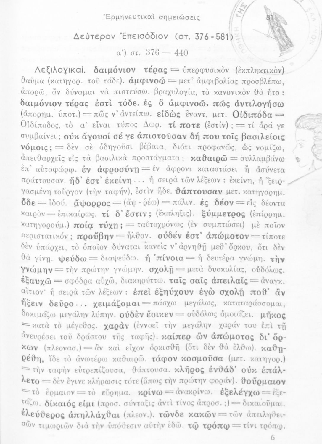 Σχολικό εγχειρίδιο Αρχαίων Ελληνικών ΣΤ΄ Γυμνασίου που περιέχει την Αντιγόνη του Σοφοκλή, ερμηνευτικά και πραγματολογικά σχόλια και λεξιλογικές παρατηρήσεις.