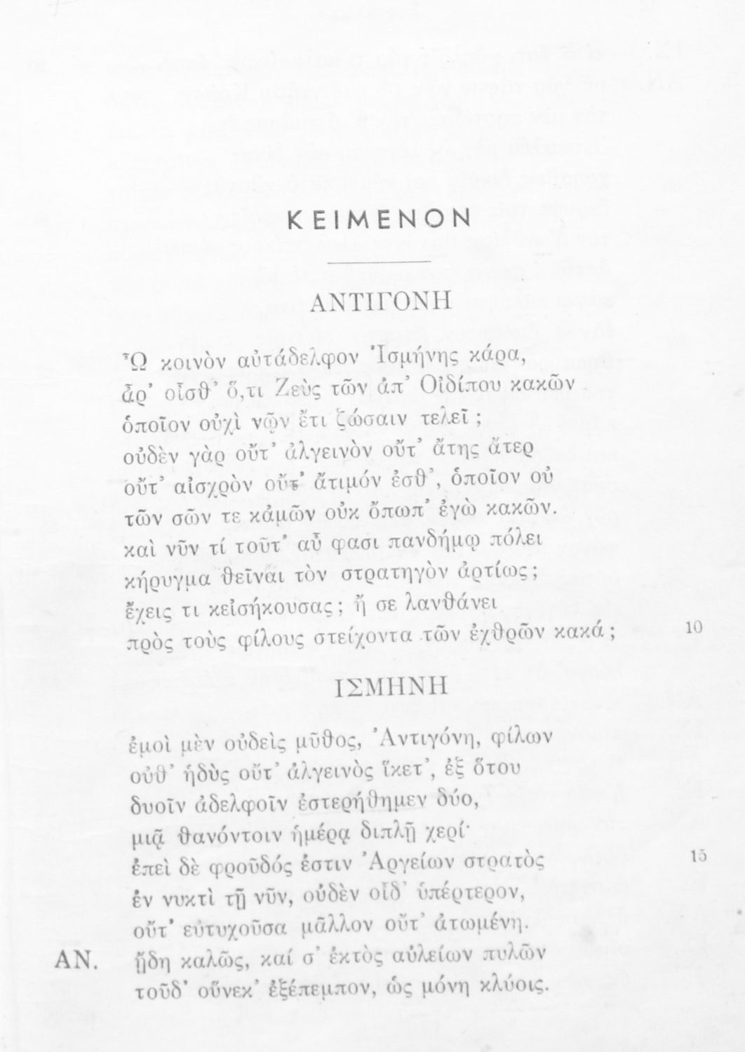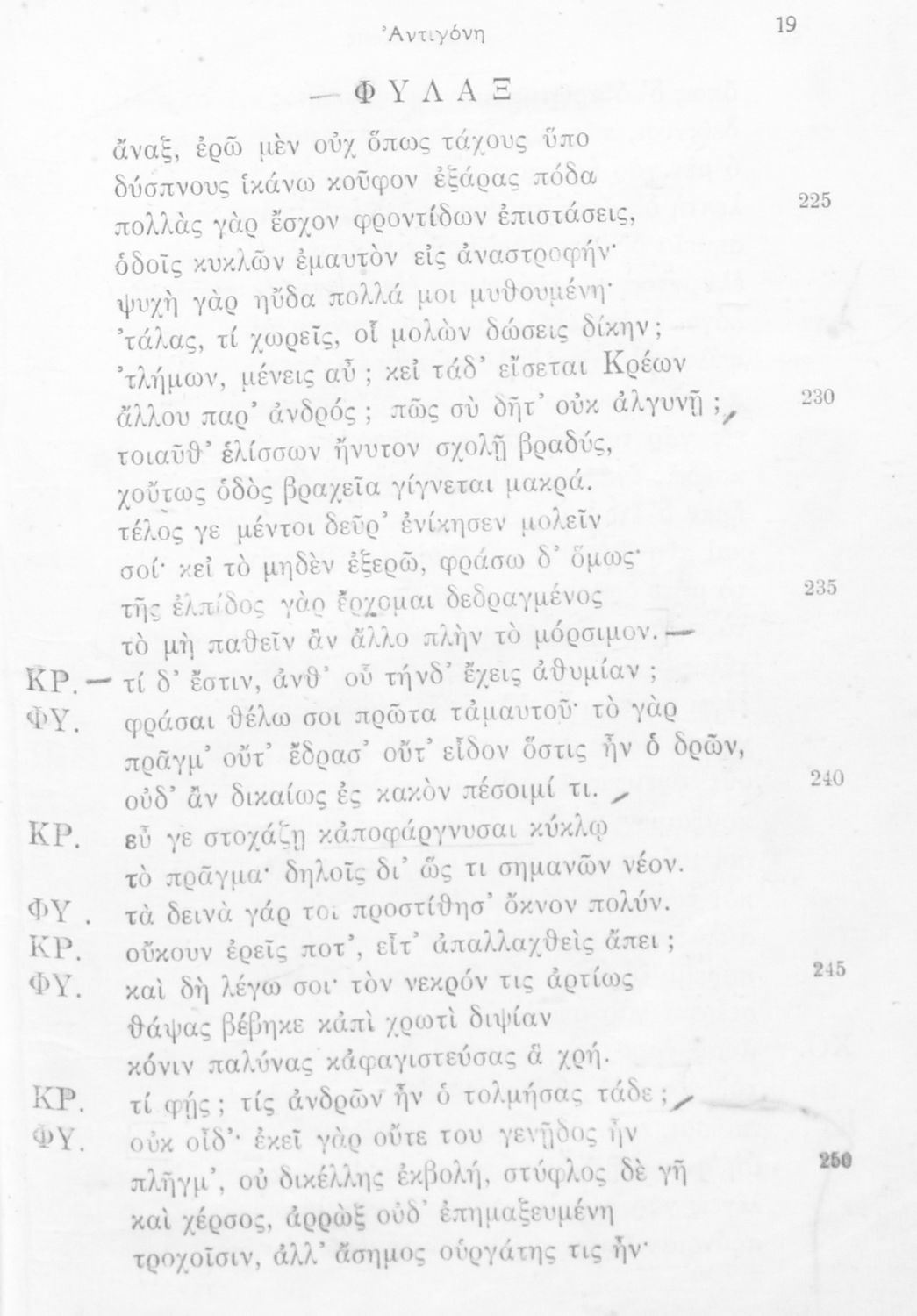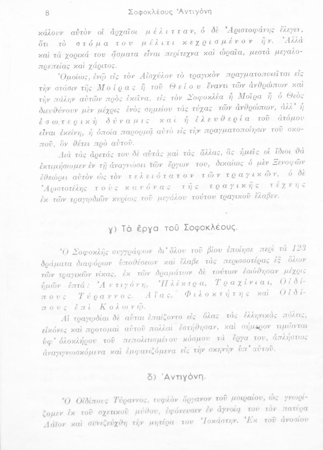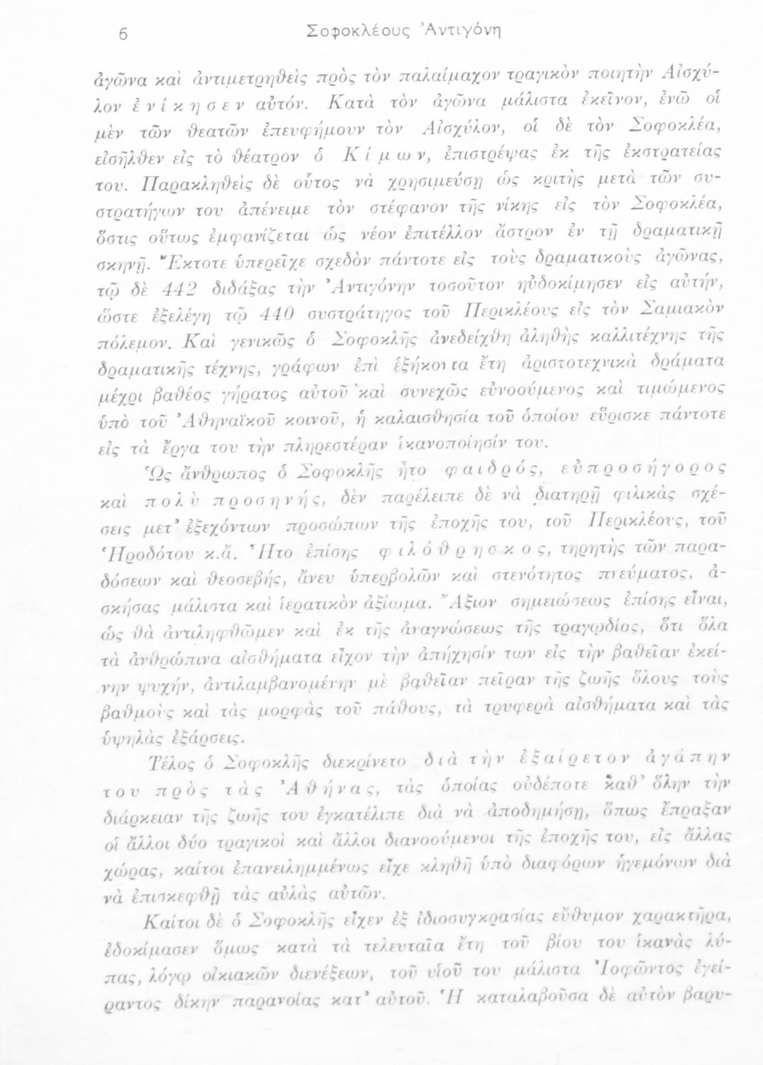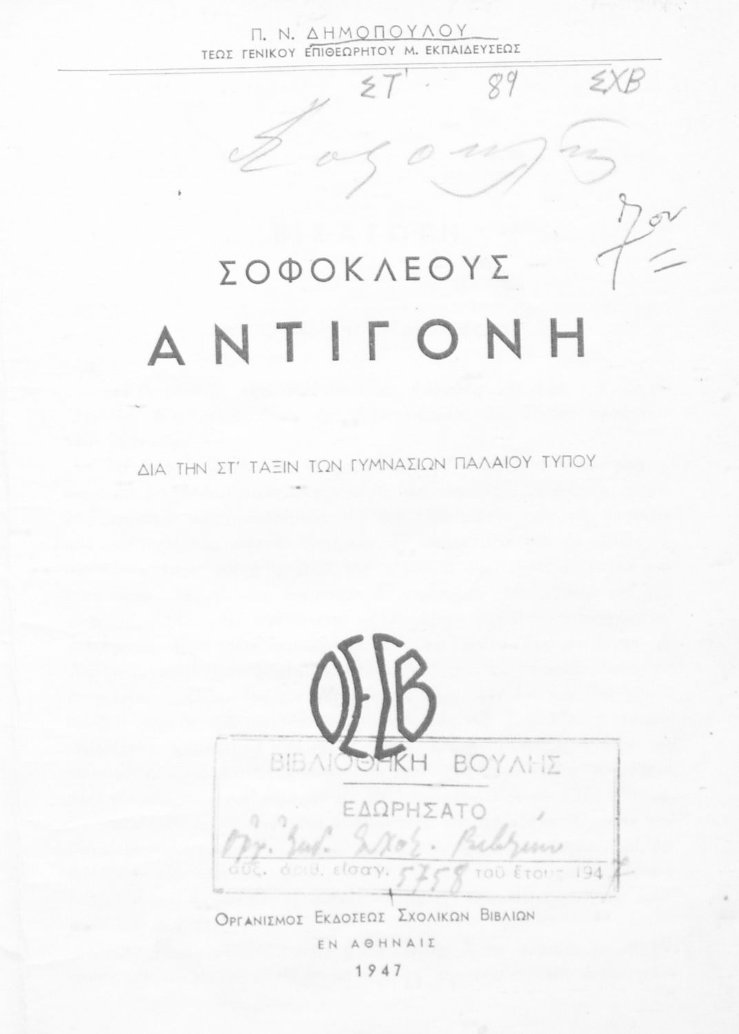 Σχολικό εγχειρίδιο Αρχαίων Ελληνικών της ΣΤ΄ Γυμνασίου. Το βιβλίο παρουσιάζει το έργο του Σοφοκλή, Αντιγόνη. Στο δεύτερο μέρος περιλαμβάνει λεξιλογικά και ερμηνευτικά σχόλια.