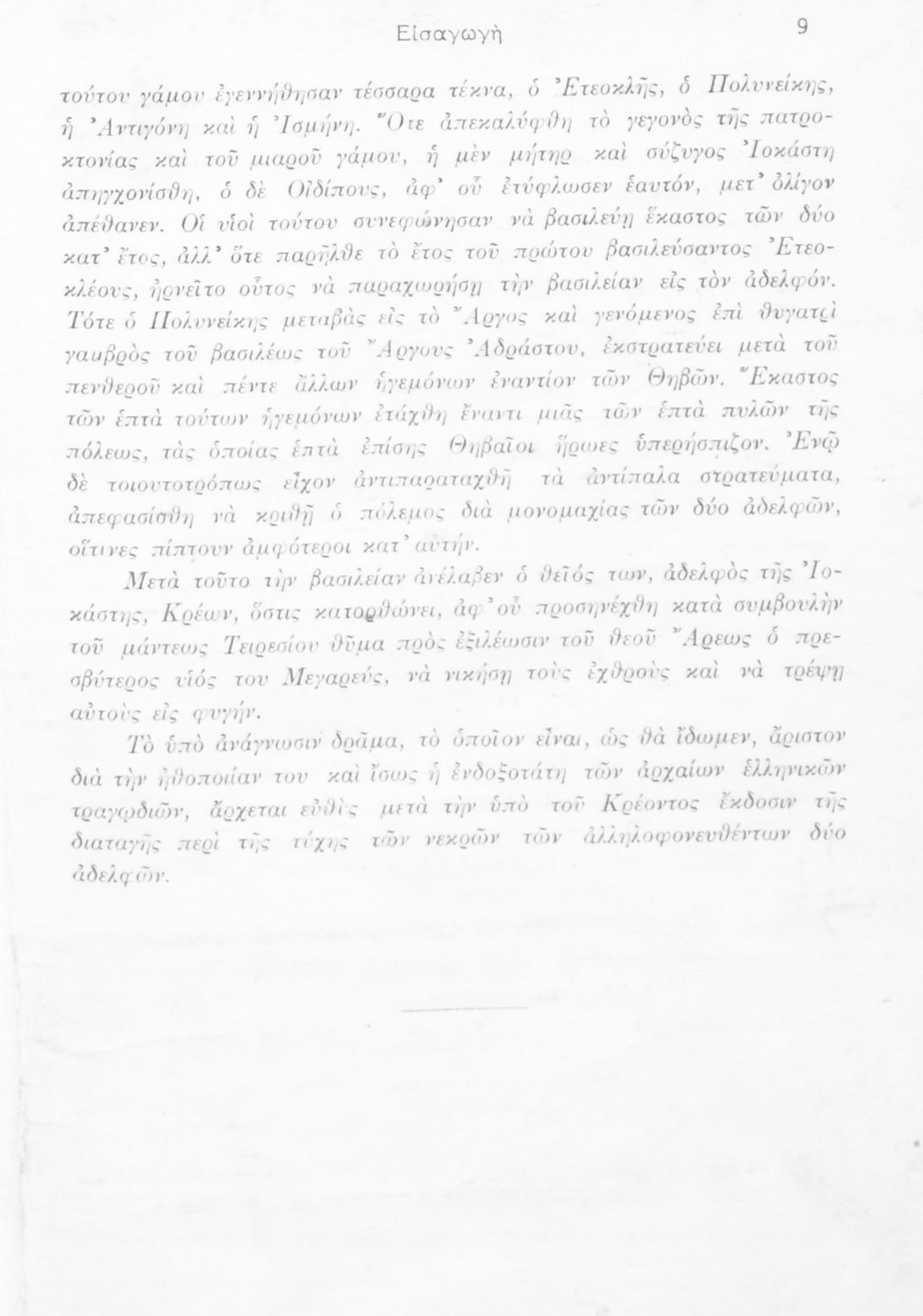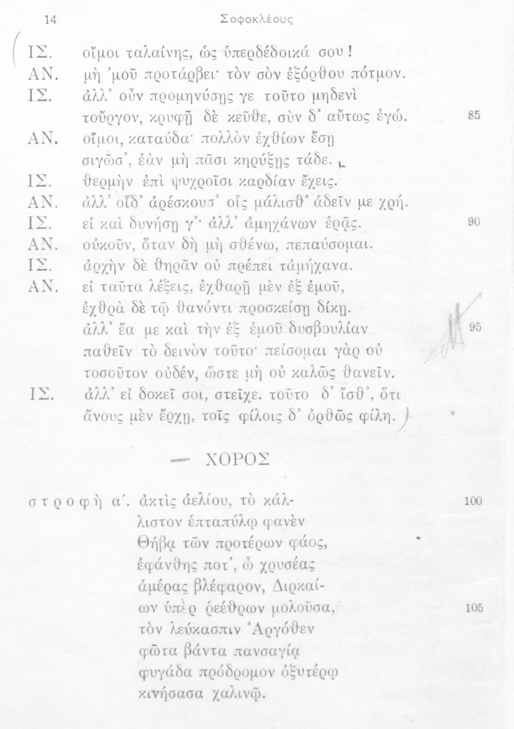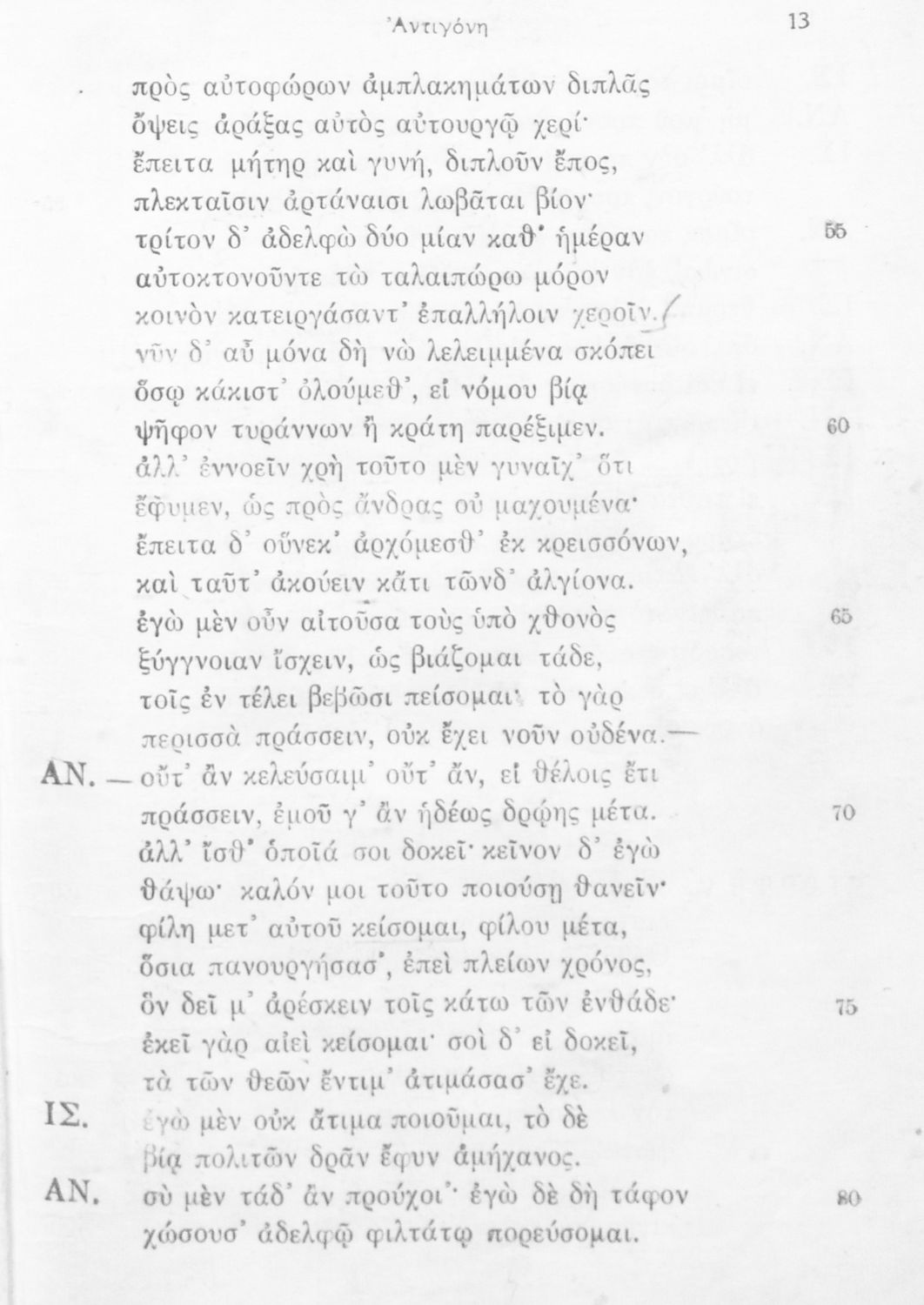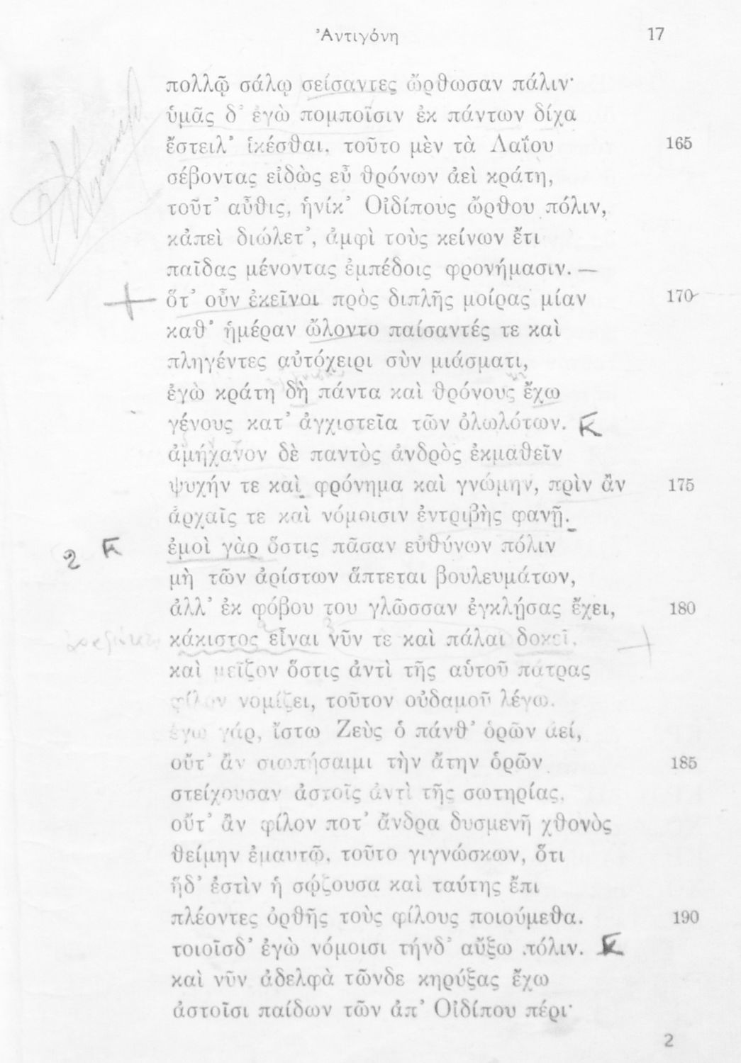 Σχολικό εγχειρίδιο Αρχαίων Ελληνικών της ΣΤ΄ Γυμνασίου. Το βιβλίο παρουσιάζει το έργο του Σοφοκλή, Αντιγόνη. Στο δεύτερο μέρος περιλαμβάνει λεξιλογικά και ερμηνευτικά σχόλια.