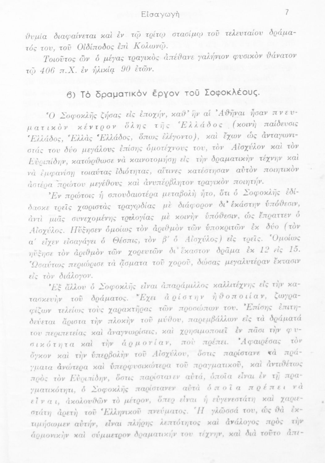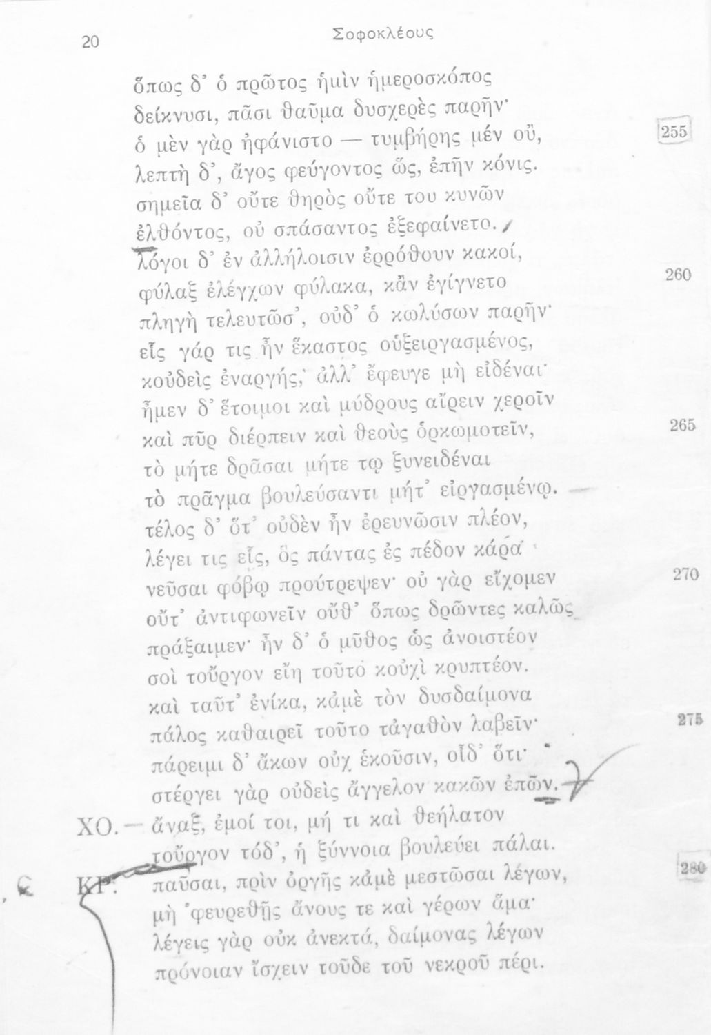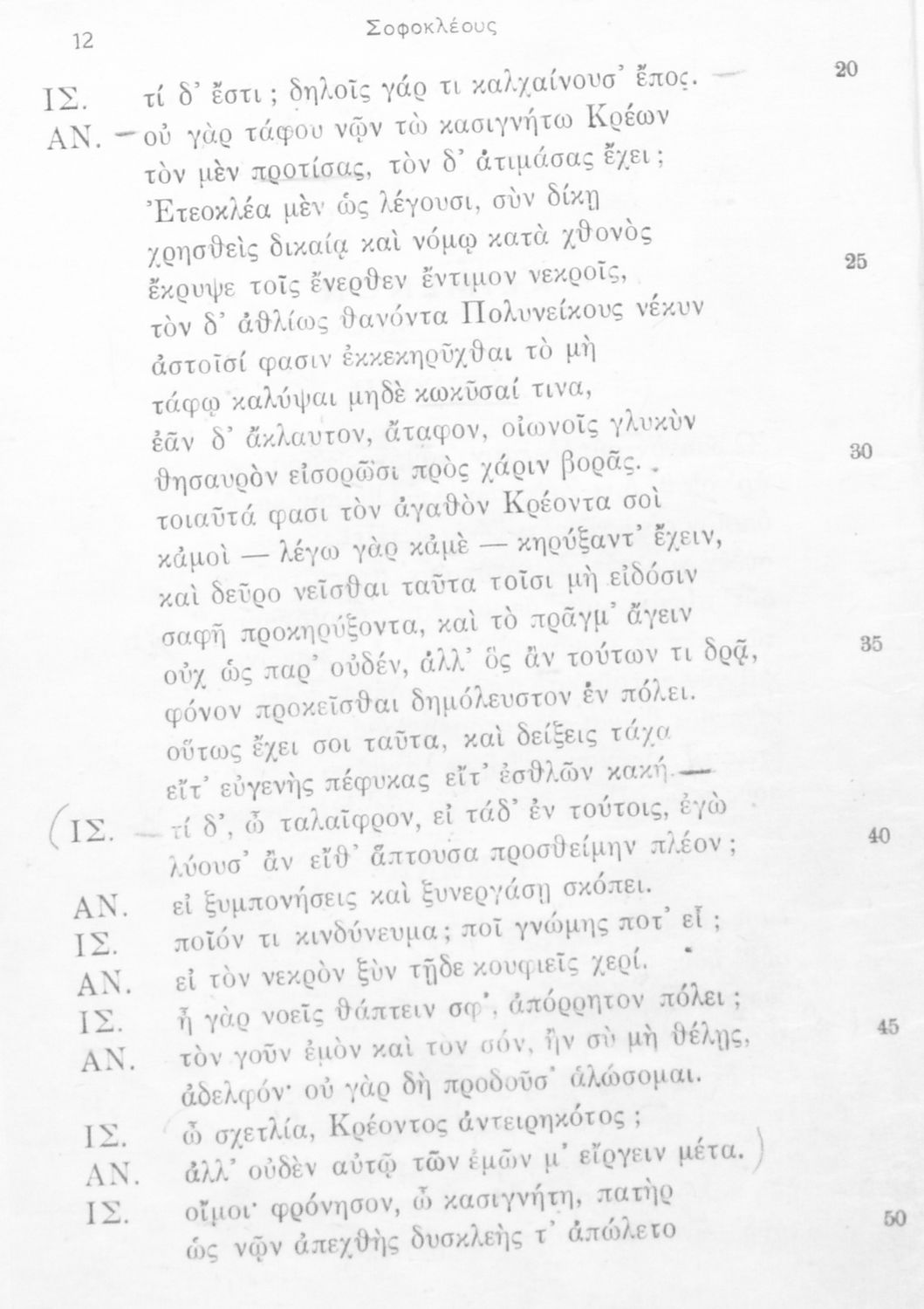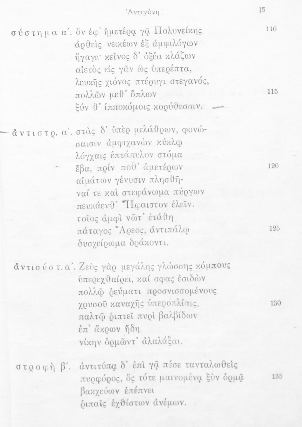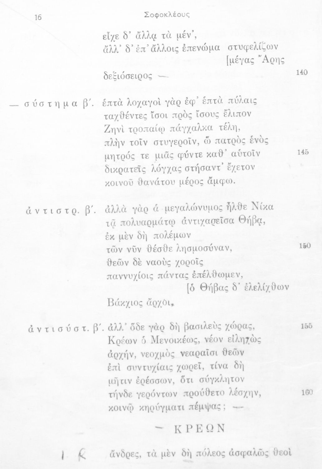 Σχολικό εγχειρίδιο Αρχαίων Ελληνικών της ΣΤ΄ Γυμνασίου. Το βιβλίο παρουσιάζει το έργο του Σοφοκλή, Αντιγόνη. Στο δεύτερο μέρος περιλαμβάνει λεξιλογικά και ερμηνευτικά σχόλια.