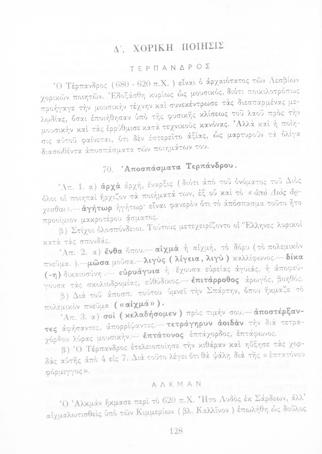 Σχολικό εγχειρίδιο Αρχαίων Ελληνικών που περιέχει αποσπάσματα αρχαίων Ελλήνων λυρικών, εισαγωγή και ερμηνευτικά σχόλια. Κοσμείται από μικρά διακοσμητικά σχέδια.