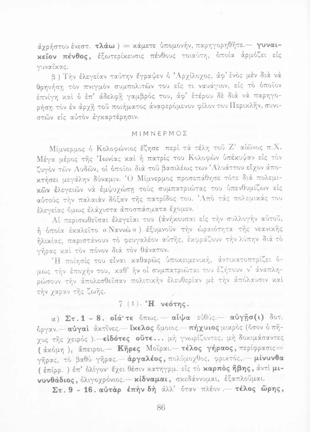 Σχολικό εγχειρίδιο Αρχαίων Ελληνικών Γ΄ Λυκείου που περιλαμβάνει αποσπάσματα έργων αρχαίων Ελλήνων λυρικών, πολιτικές και γνωμικές ελεγείες, ιάμβους και επιγράμματα. Περιέχει υπόμνημα με ερμηνευτικά, ...