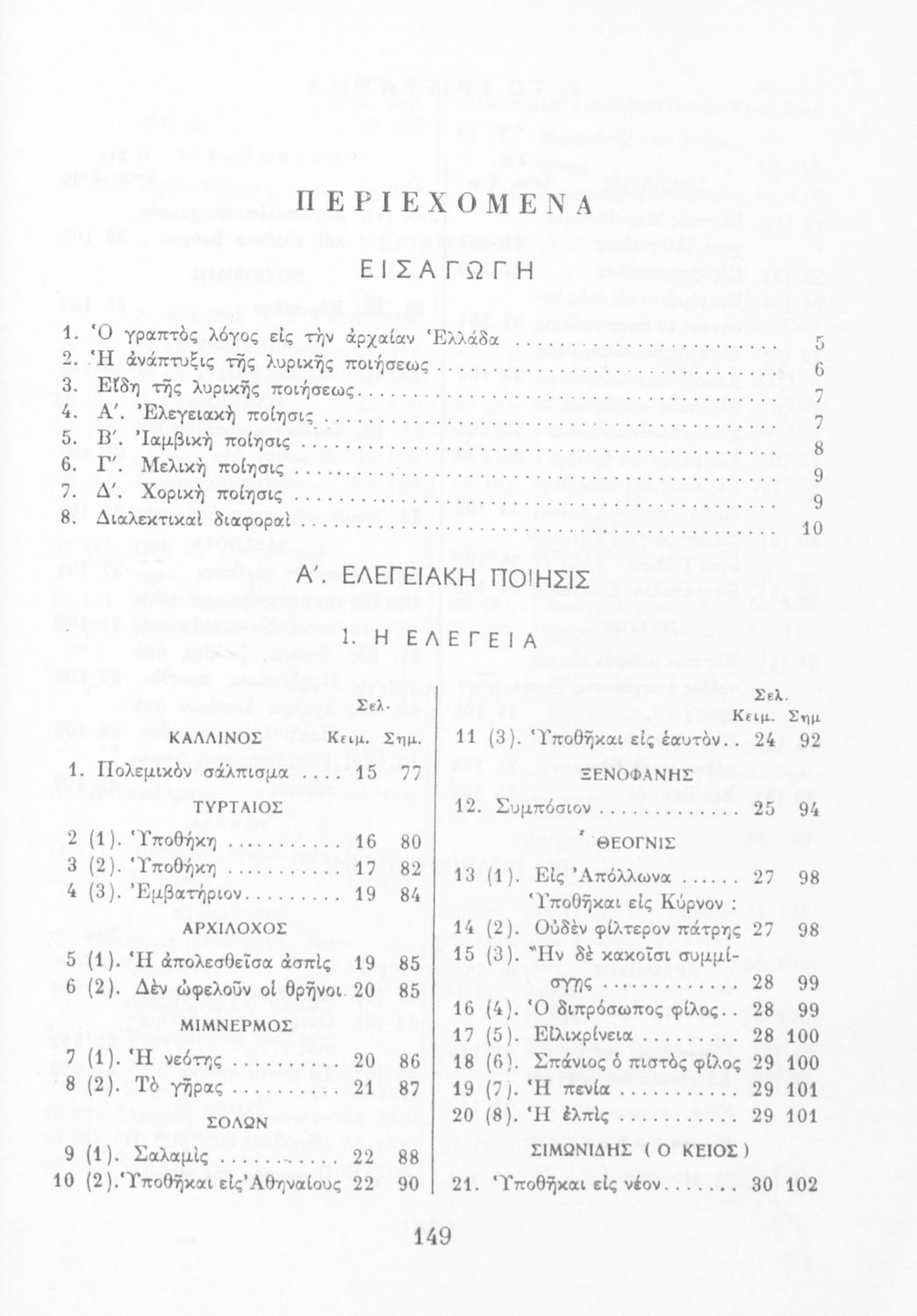 Σχολικό εγχειρίδιο Αρχαίων Ελληνικών Ε΄ Γυμνασίου που περιλαμβάνει αποσπάσματα έργων αρχαίων Ελλήνων λυρικών, πολιτικές και γνωμικές ελεγείες, ιάμβους και επιγράμματα. Περιέχει υπόμνημα με ερμηνευτικά, ...