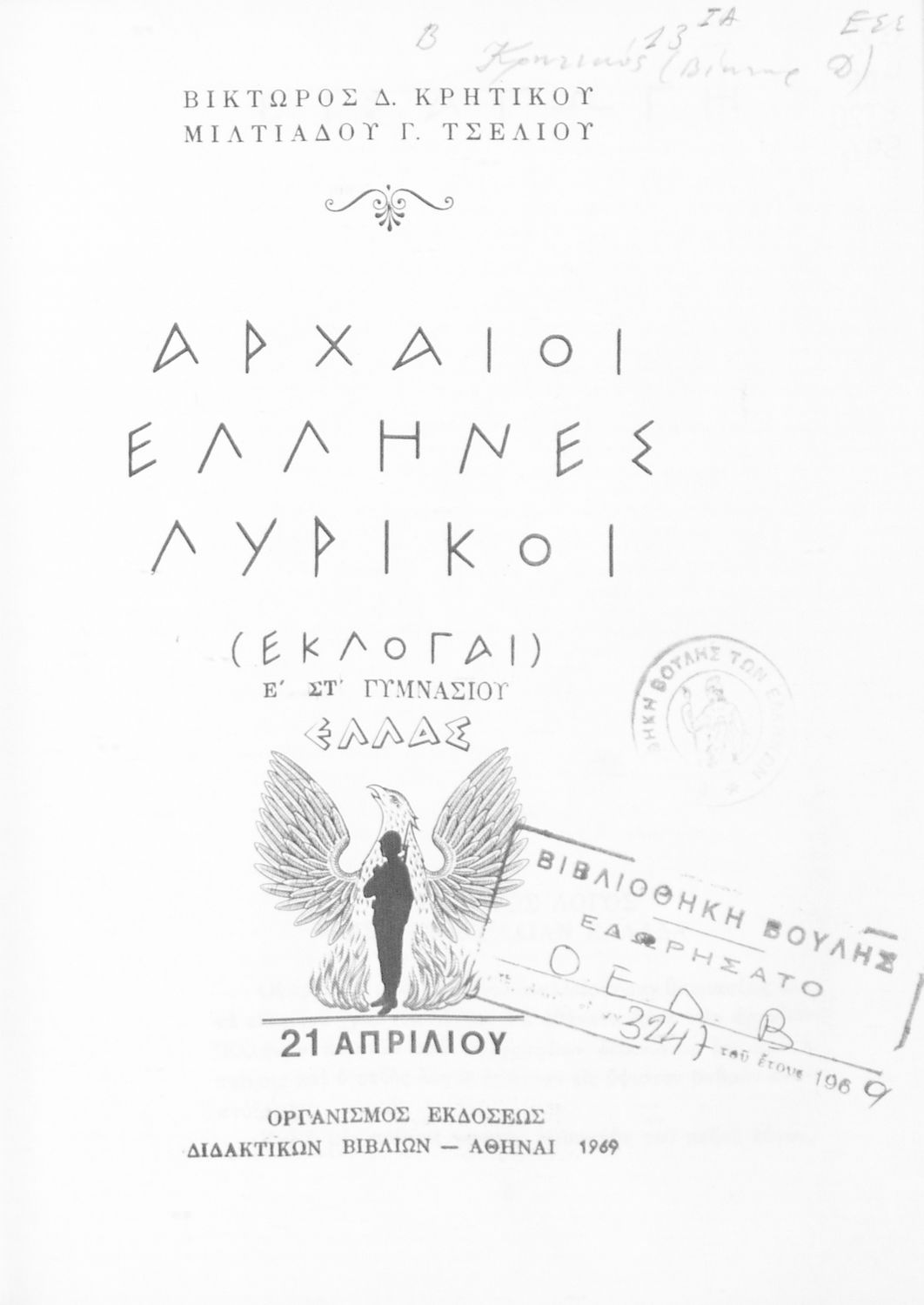 Βαθμίδα εκπαίδευσης: Δευτεροβάθμια Τάξη: Ε' Γυμνασίου / ΣΤ' Γυμνασίου Μάθημα: Αρχαία Ελληνικά Γλώσσα: Καθαρεύουσα Παρουσίαση περιεχομένου: Σχολικό εγχειρίδιο Αρχαίων Ελληνικών Ε΄ και ΣΤ΄ Γυμνασίου που περιλαμβάνει εισαγωγή στη λυρική ποίηση, έργα αρχαίων Ελλήνων ποιητών, ερμηνευτικά και πραγματολογικά σχόλια, και λεξιλογικές παρατηρήσεις. |