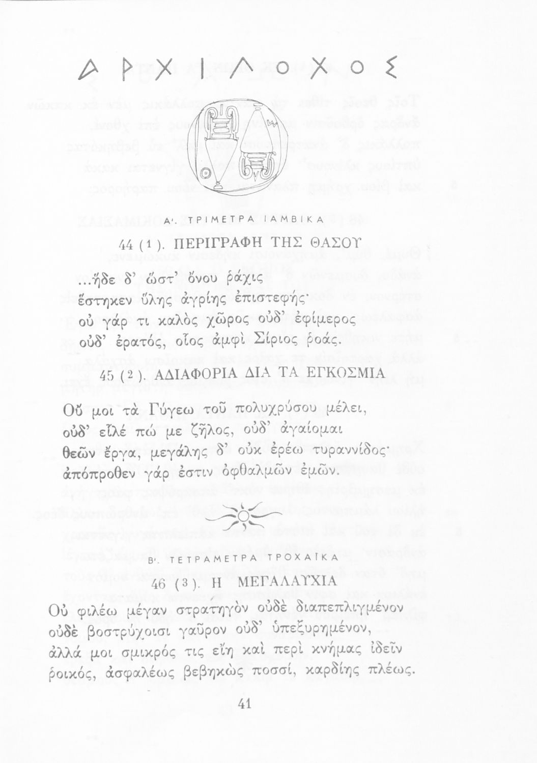 Σχολικό εγχειρίδιο Αρχαίων Ελληνικών για την ΣΤ΄ Γυμνασίου που περιέχει αποσπάσματα αρχαίων Ελλήνων λυρικών, εισαγωγή και ερμηνευτικά σχόλια. Κοσμείται από μικρά διακοσμητικά σχέδια.