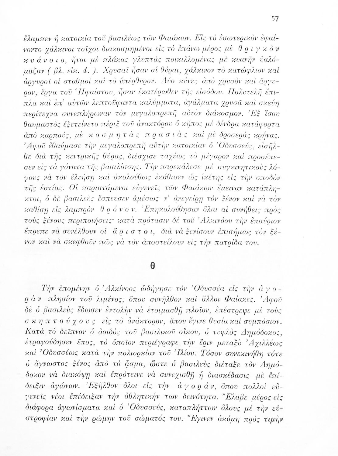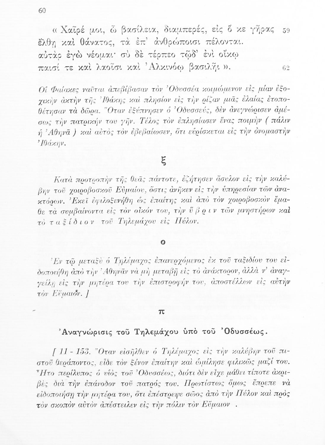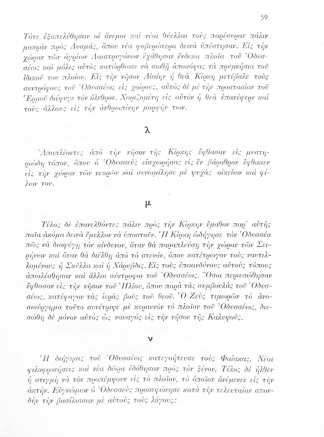 Σχολικό εγχειρίδιο Αρχαίων Ελληνικών Γυμνασίου που περιλαμβάνει αποσπάσματα από τις ραψωδίες της Οδύσσειας, ερμηνευτικά και πραγματολογικά σχόλια, και λεξιλογικές παρατηρήσεις.