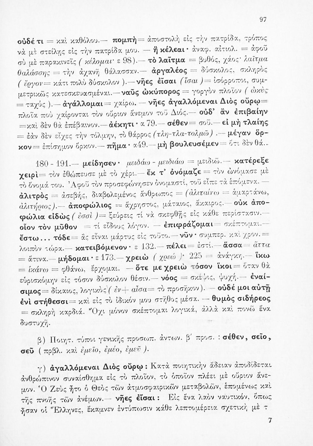 Βαθμίδα εκπαίδευσης: Δευτεροβάθμια Τάξη: Δ' Γυμνασίου Μάθημα: Αρχαία Ελληνικά Γλώσσα: Καθαρεύουσα Παρουσίαση περιεχομένου: Σχολικό εγχειρίδιο Αρχαίων Ελληνικών της Δ' Γυμνασίου. Το σχολικό εγχειρίδιο περιέχει την Οδύσσεια του Ομήρου. Στην αρχή έχει πληροφορίες για το μυκηναϊκό πολιτισμό και γενικότερα τους Αχαιούς. Μετά παρουσιάζει το πρωτότυπο κείμενο του Ομήρου και στη συνέχεια ερμηνευτικές σημειώσεις για το κείμενο. |