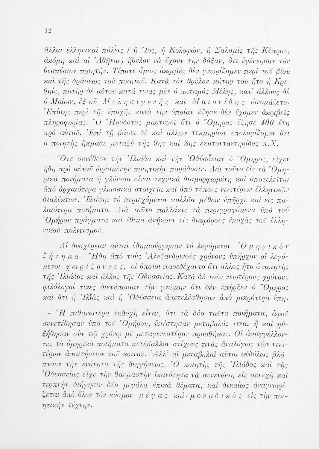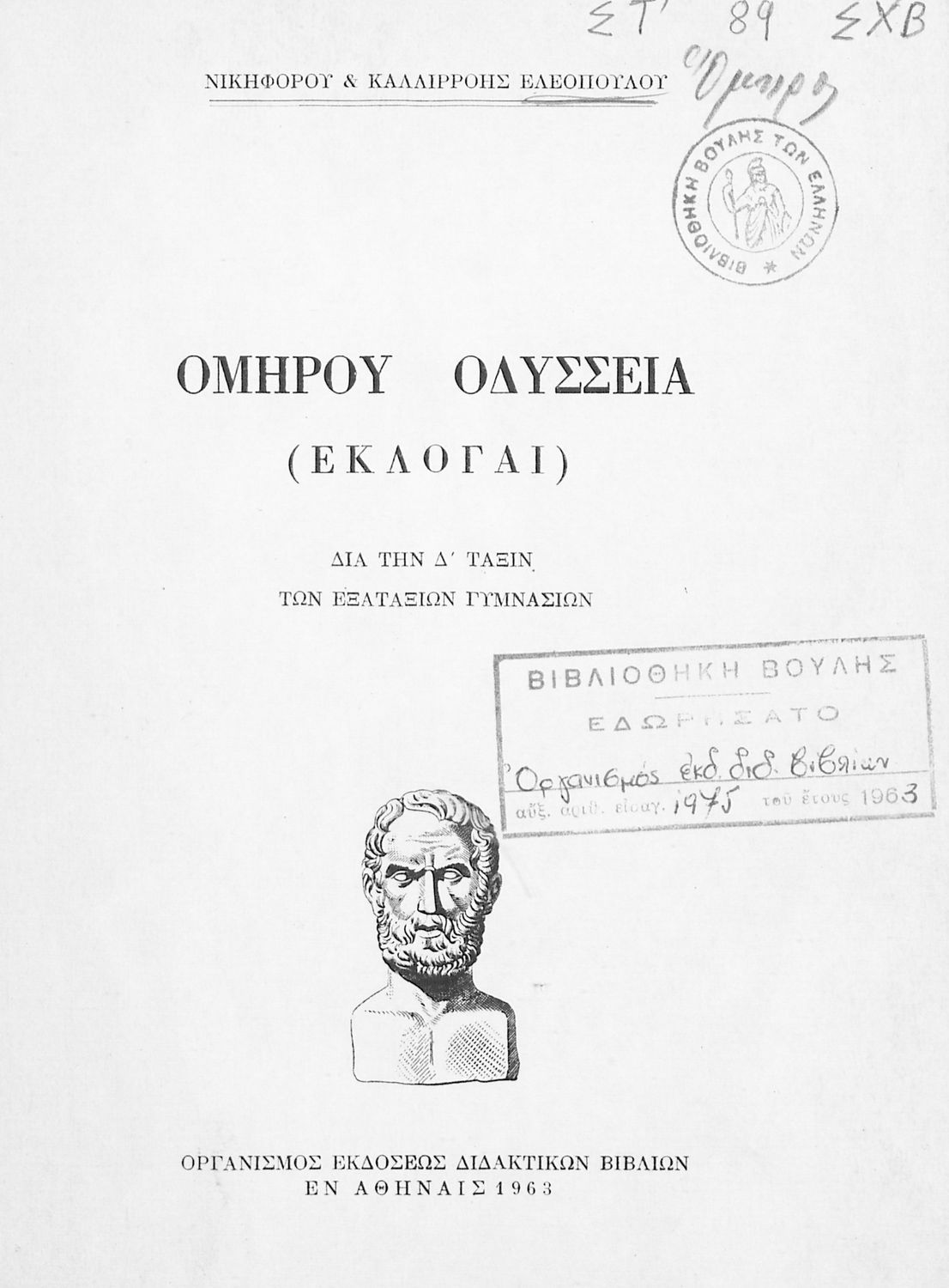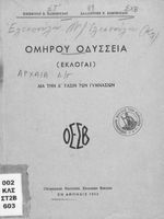 Βαθμίδα εκπαίδευσης: Δευτεροβάθμια Τάξη: Δ' Γυμνασίου Μάθημα: Αρχαία Ελληνικά Γλώσσα: Καθαρεύουσα Παρουσίαση περιεχομένου: Σχολικό εγχειρίδιο Αρχαίων Ελληνικών της Δ' Γυμνασίου. Το σχολικό εγχειρίδιο περιέχει την Οδύσσεια του Ομήρου. Στην αρχή έχει πληροφορίες για το μυκηναϊκό πολιτισμό και γενικότερα τους Αχαιούς. Μετά παρουσιάζει το πρωτότυπο κείμενο του Ομήρου και στη συνέχεια ερμηνευτικές σημειώσεις για το κείμενο. |