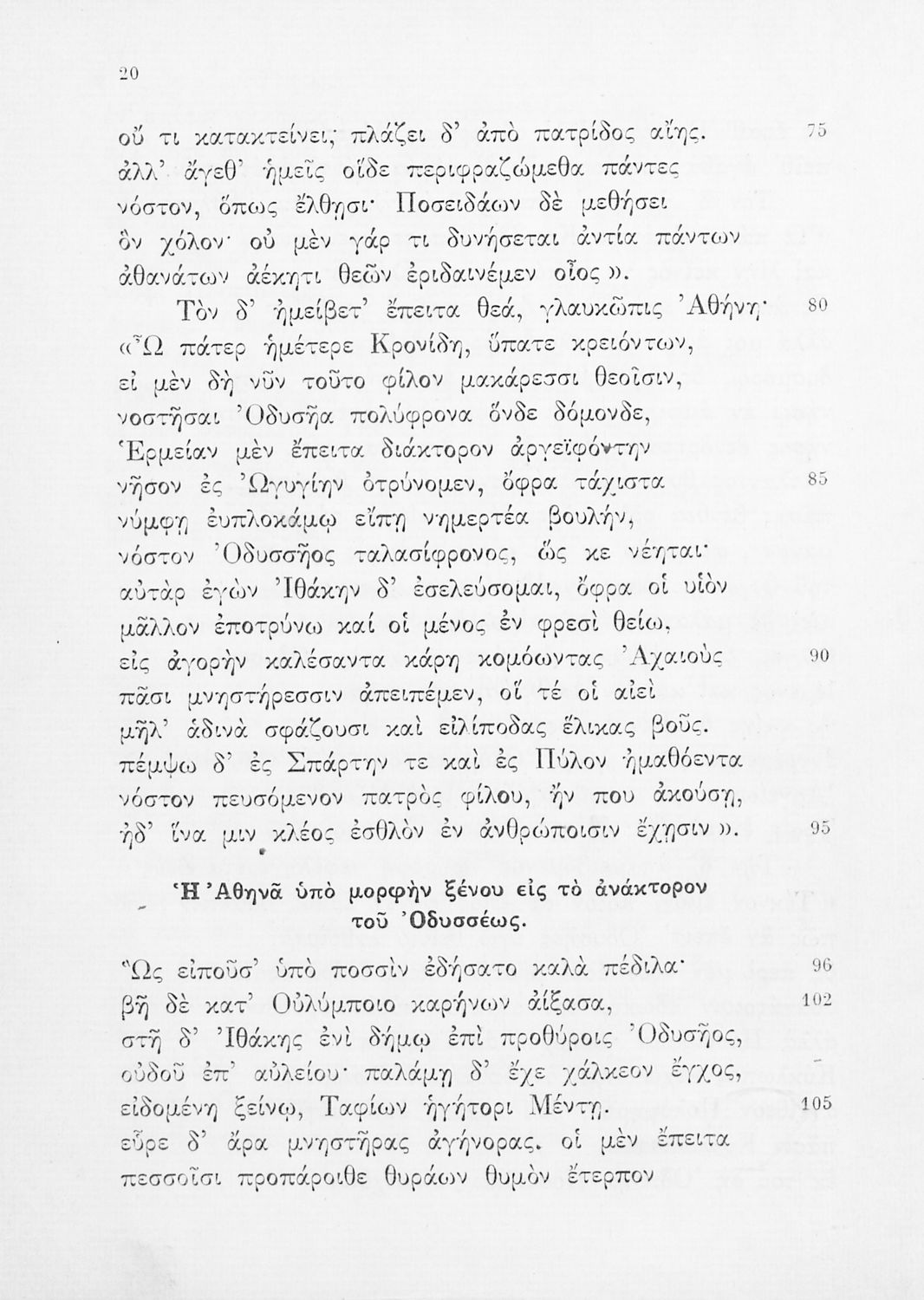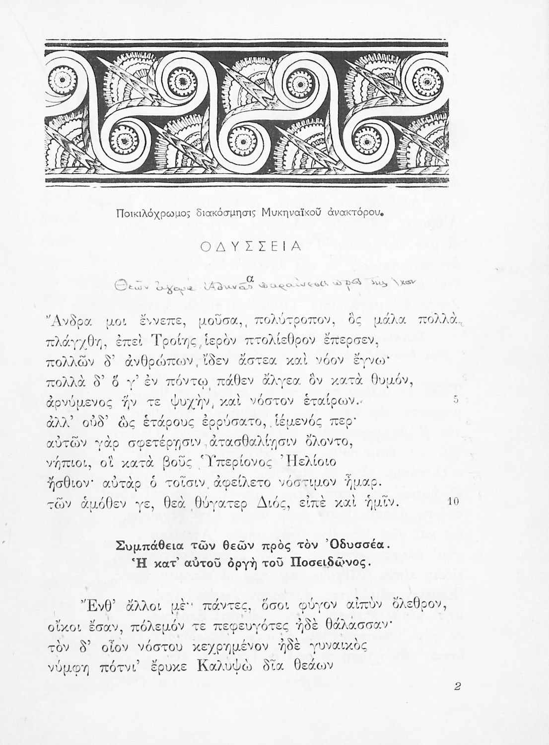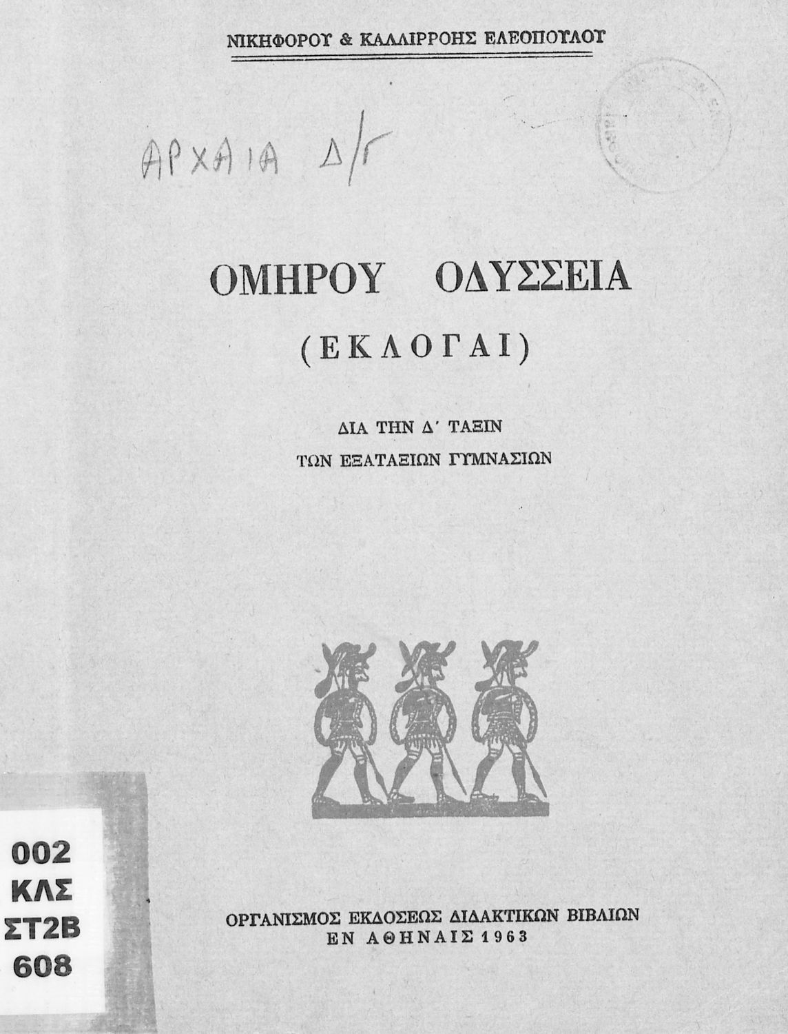 Σχολικό εγχειρίδιο Αρχαίων Ελληνικών της Δ' Γυμνασίου. Το σχολικό εγχειρίδιο περιέχει την Οδύσσεια του Ομήρου. Στην αρχή έχει πληροφορίες για το μυκηναϊκό πολιτισμό και γενικότερα τους Αχαιούς. Μετά παρουσιάζει το πρωτότυπο κείμενο του Ομήρου και στη συνέχεια ερμηνευτικές σημειώσεις για το κείμενο.