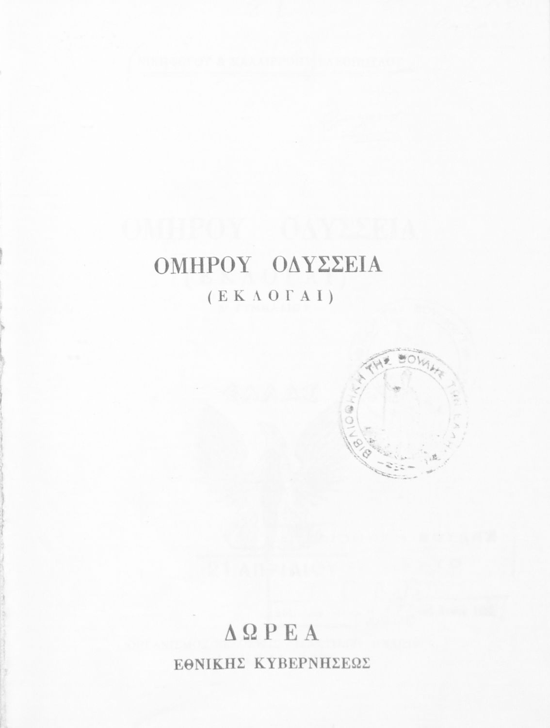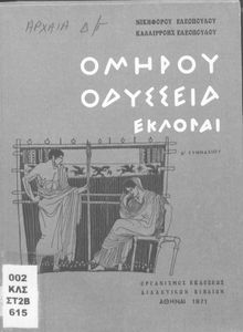 Βαθμίδα εκπαίδευσης: Δευτεροβάθμια Τάξη: Δ' Γυμνασίου Μάθημα: Αρχαία Ελληνικά Γλώσσα: Καθαρεύουσα Παρουσίαση περιεχομένου: Σχολικό εγχειρίδιο Αρχαίων Ελληνικών της Δ΄ Γυμνασίου. Στο βιβλίο παρουσιάζεται η Οδύσσεια του Ομήρου. Χωρίζεται σε τρία μέρη. Το πρώτο μέρος περιλαμβάνει μια εισαγωγή για το μυκηναϊκό πολιτισμό. Στο δεύτερο μέρος παρουσιάζει το πρωτότυπο κείμενο του Ομήρου το οποίο και συνοδεύουν ερμηνευτικές και γλωσσολογικές στο τρίτο και τελευταίο μέρος. |