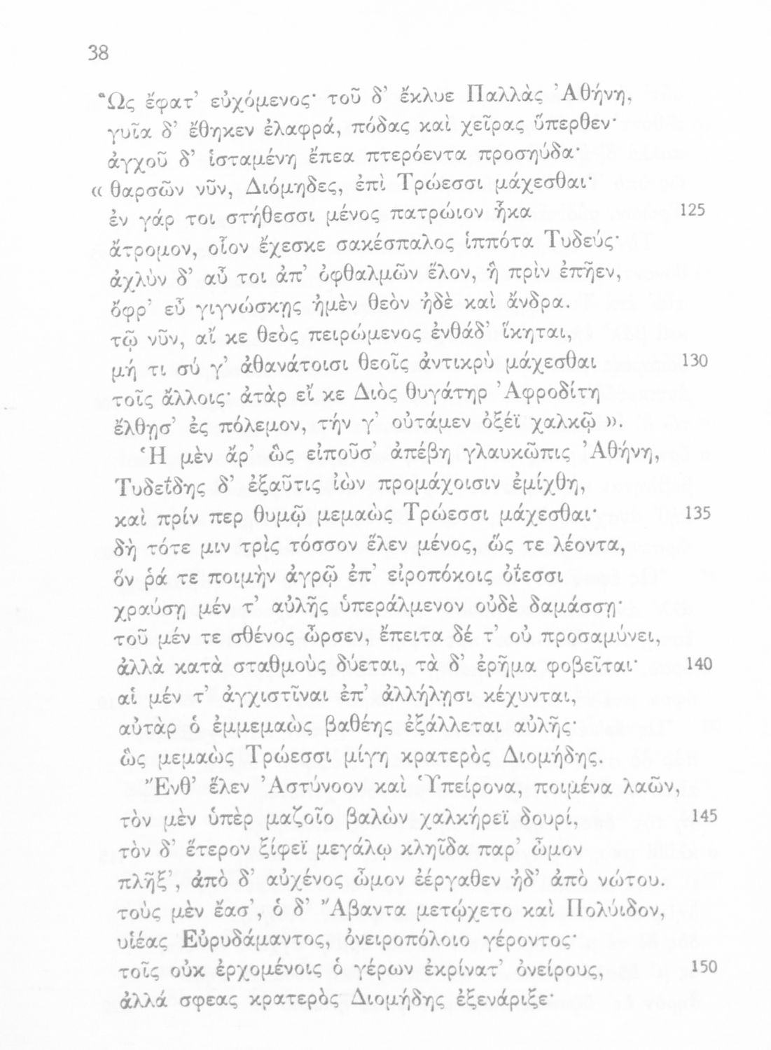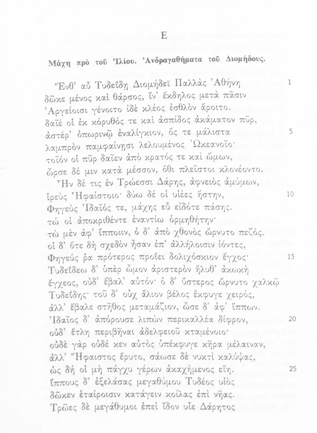 Σχολικό εγχειρίδιο Αρχαίων Ελληνικών της Ε' Γυμνασίου. Το βιβλίο περιέχει το έργο του Ομήρου Ιλιάδα από το πρωτότυπο. Στο δεύτερο μέρος, υπάρχουν ερμηνευτικές σημειώσεις και ανάλυση του έργου.