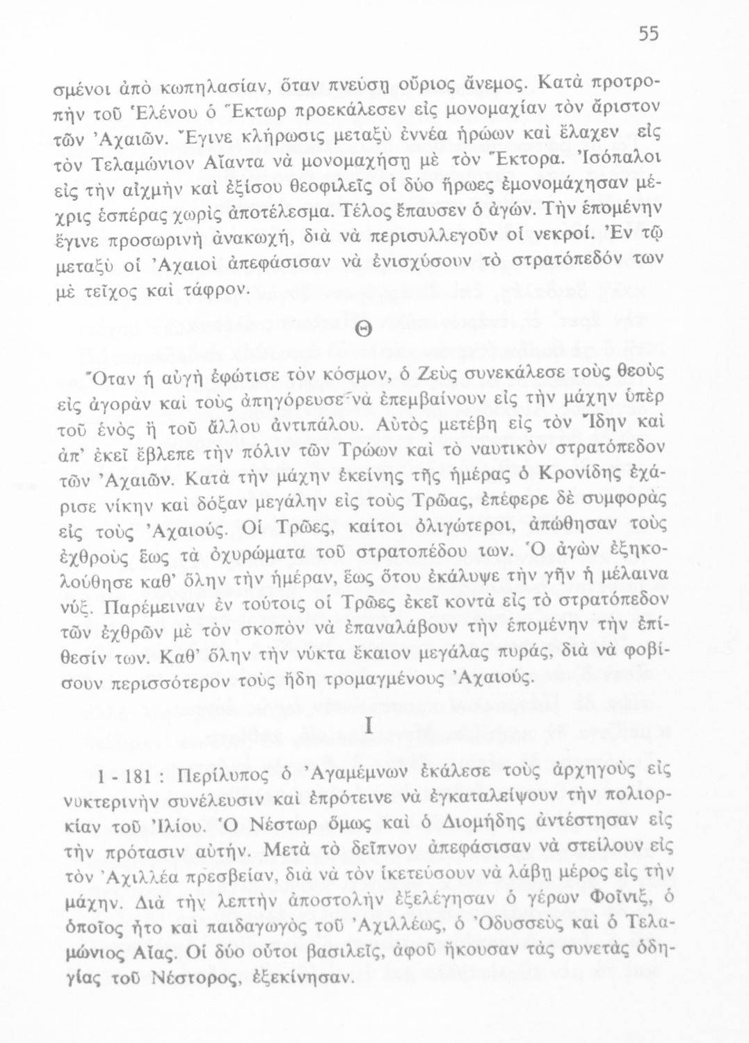 Σχολικό εγχειρίδιο Αρχαίων Ελληνικών Ε΄ Γυμνασίου που περιλαμβάνει αποσπάσματα από την Ιλιάδα, εισαγωγή και ασκήσεις. Περιέχει και παράρτημα εικόνων.