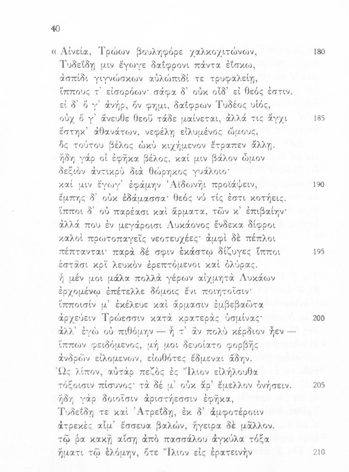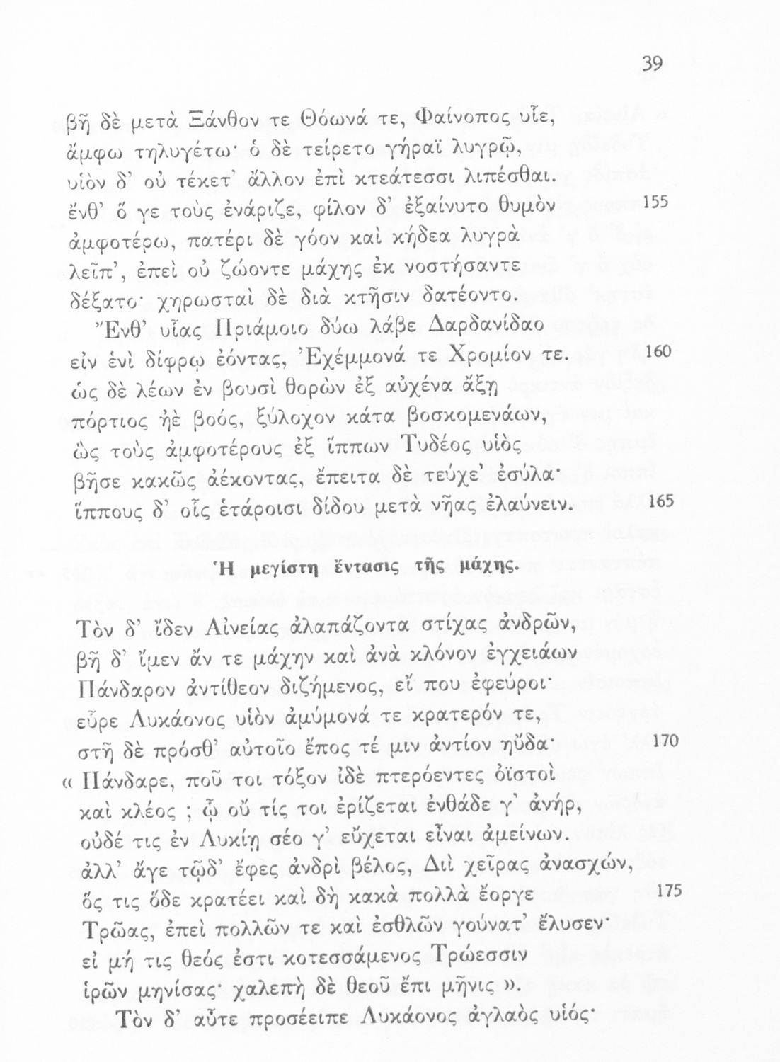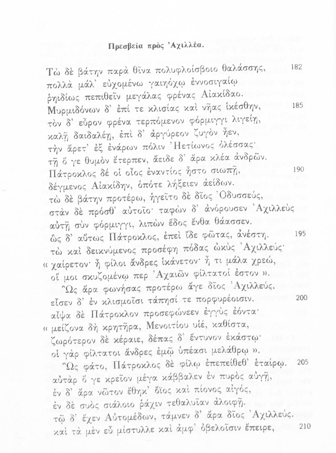 Σχολικό εγχειρίδιο Αρχαίων Ελληνικών της Ε' Γυμνασίου. Το βιβλίο περιέχει το έργο του Ομήρου Ιλιάδα από το πρωτότυπο. Στο δεύτερο μέρος, υπάρχουν ερμηνευτικές σημειώσεις και ανάλυση του έργου.