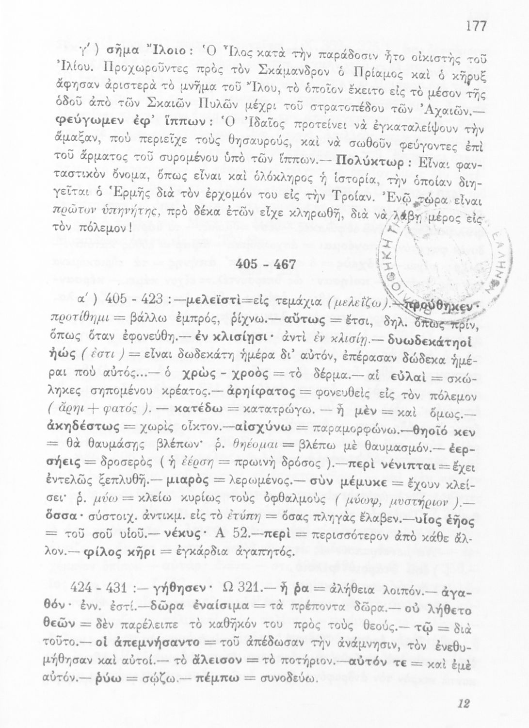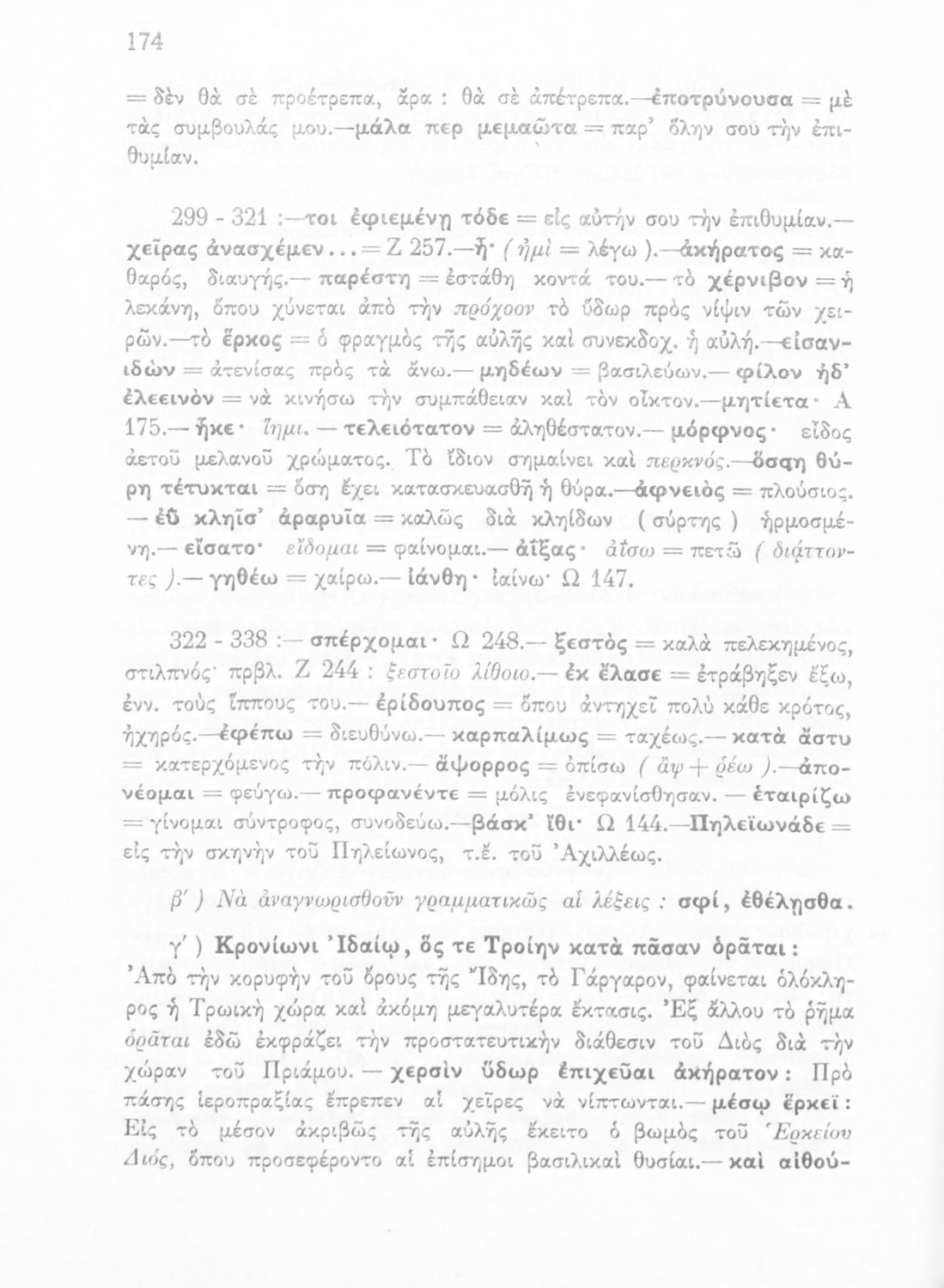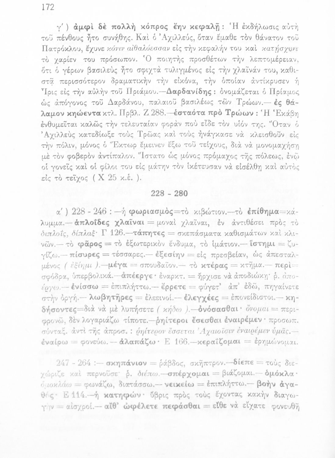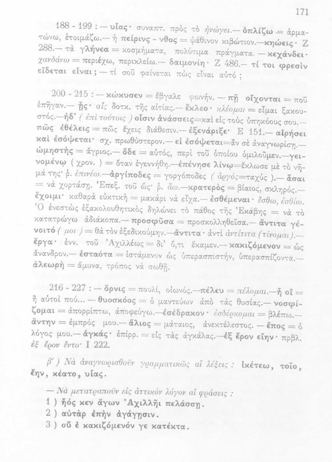 Μαθητικό βοήθημα του Ελληνικού Σχολείου, των Παρθεναγωγείων και του Γυμνασίου για το μάθημα των Αρχαίων Ελληνικών. Περιέχει τις ραψωδίες Ο, Π, Ρ, Σ, Τ, Χ, ψ, Ω από το πρωτότυπο με σχόλια και ερμηνευτικές ...
