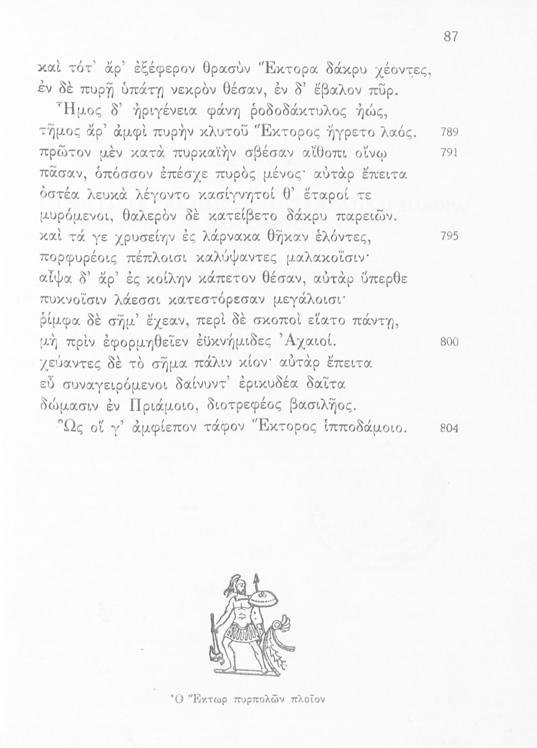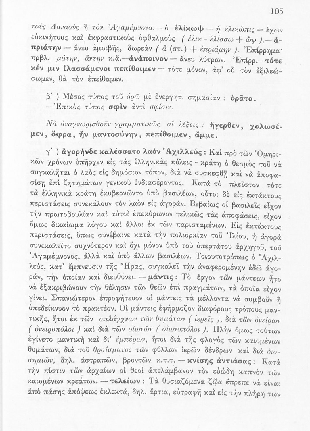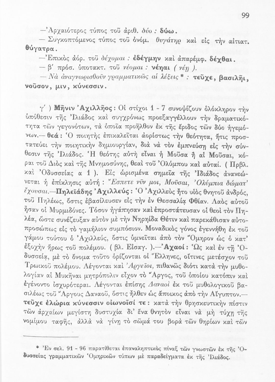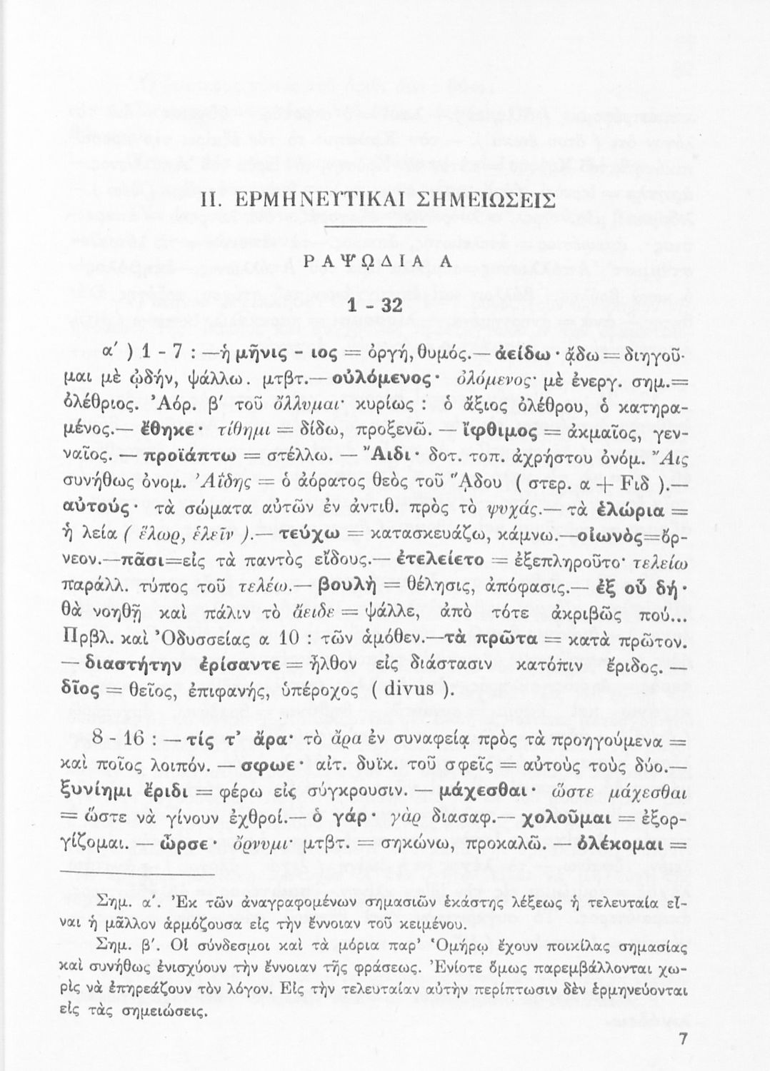 Μαθητικό βοήθημα του Ελληνικού Σχολείου, των Παρθεναγωγείων και του Γυμνασίου για το μάθημα των Αρχαίων Ελληνικών. Περιέχει τις ραψωδίες Ο, Π, Ρ, Σ, Τ, Χ, ψ, Ω από το πρωτότυπο με σχόλια και ερμηνευτικές ...