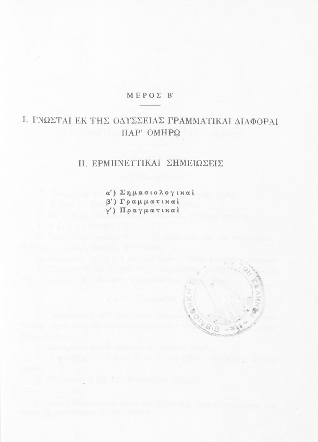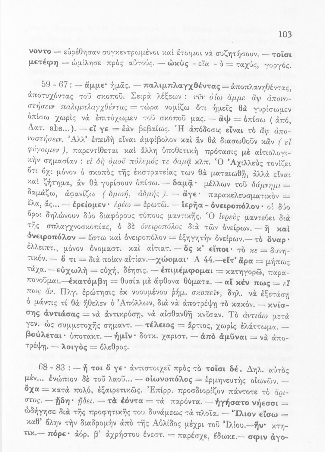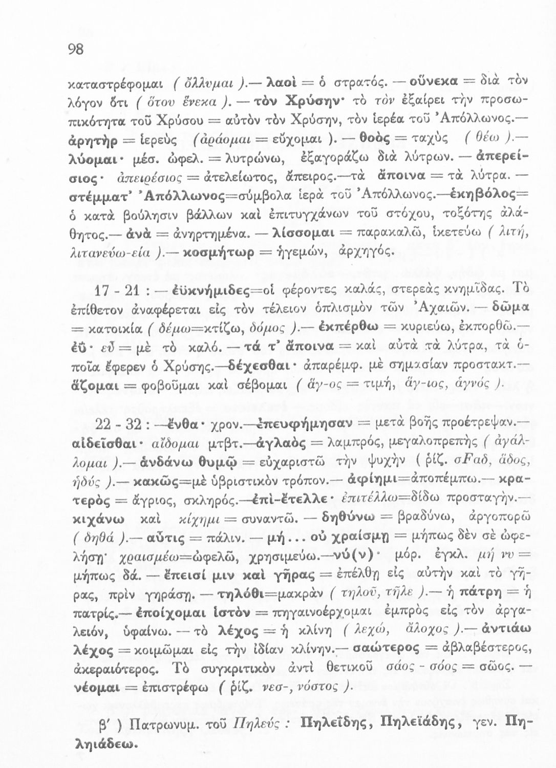 Μαθητικό βοήθημα του Ελληνικού Σχολείου, των Παρθεναγωγείων και του Γυμνασίου για το μάθημα των Αρχαίων Ελληνικών. Περιέχει τις ραψωδίες Ο, Π, Ρ, Σ, Τ, Χ, ψ, Ω από το πρωτότυπο με σχόλια και ερμηνευτικές ...