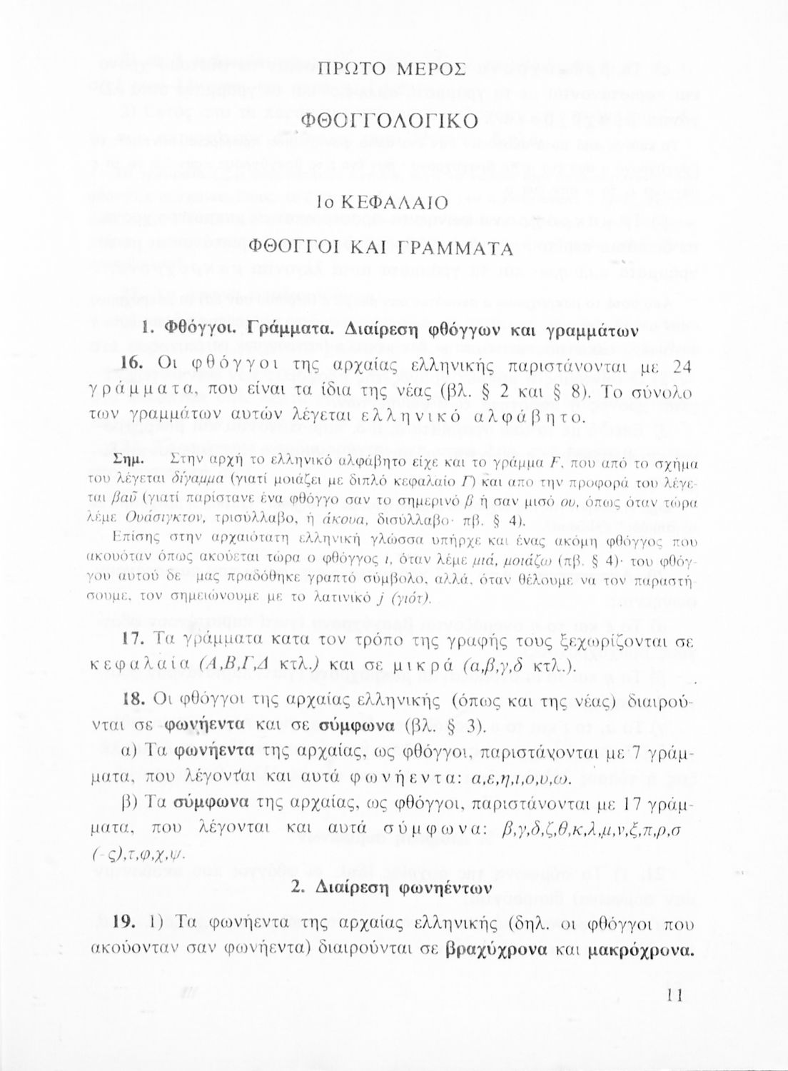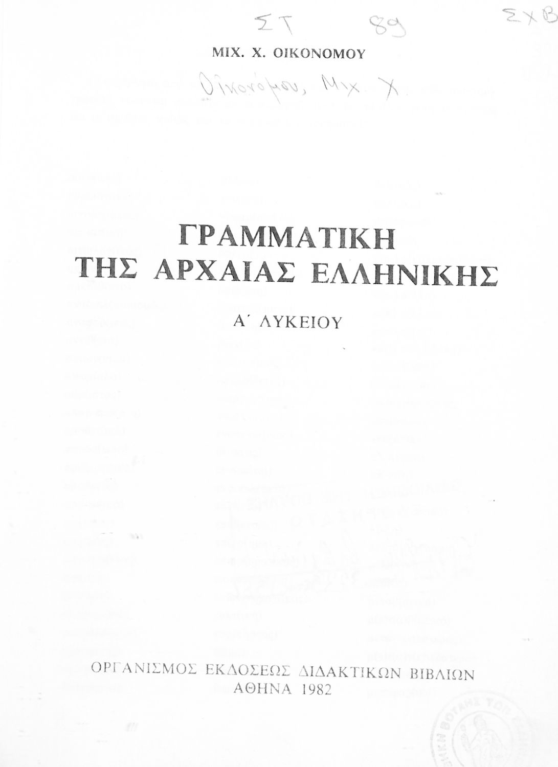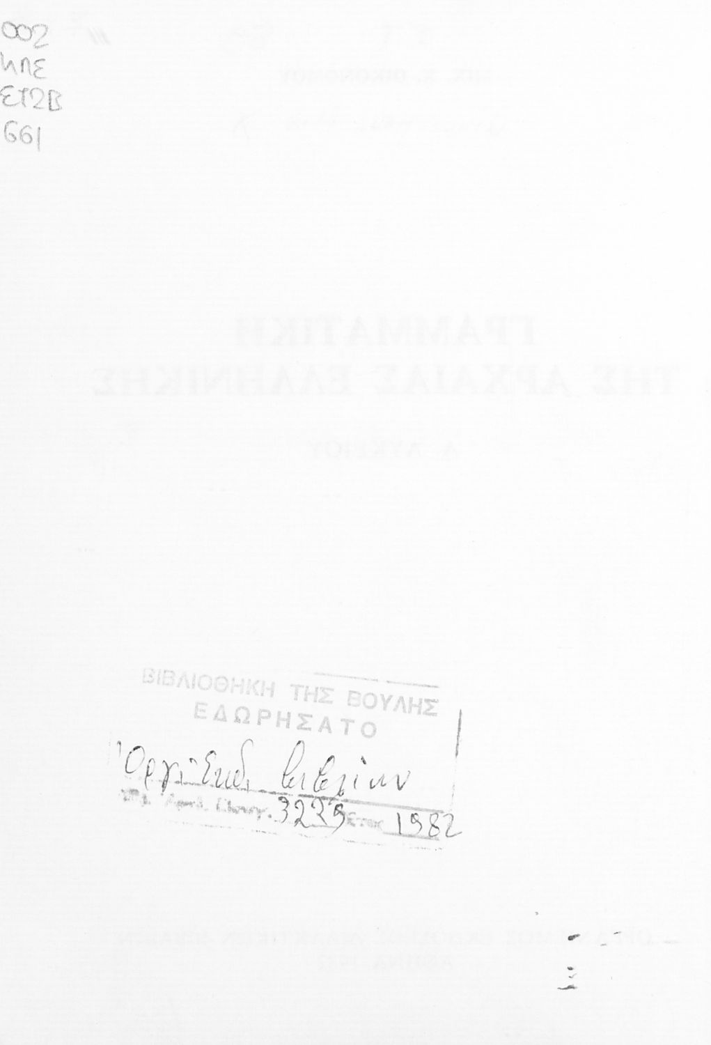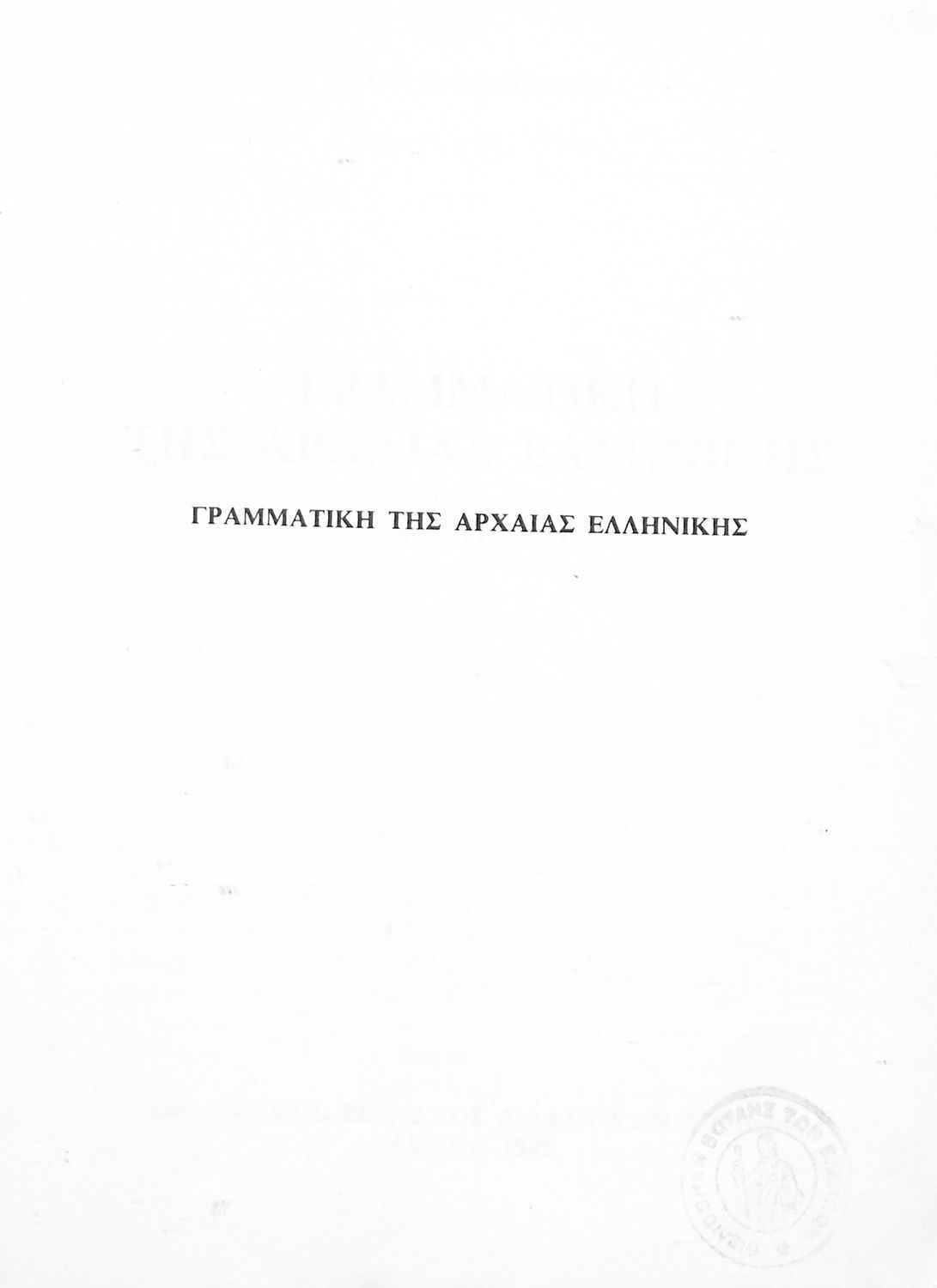 Σχολικό εγχειρίδιο Αρχαίων Ελληνικών Γυμνασίου που περιλαμβάνει τη γραμματική της αρχαίας ελληνικής και είναι χωρισμένο σε φθογγολογικό και τυπολογικό μέρος Περιέχει και κατάλογο ανωμάλων ρημάτων.